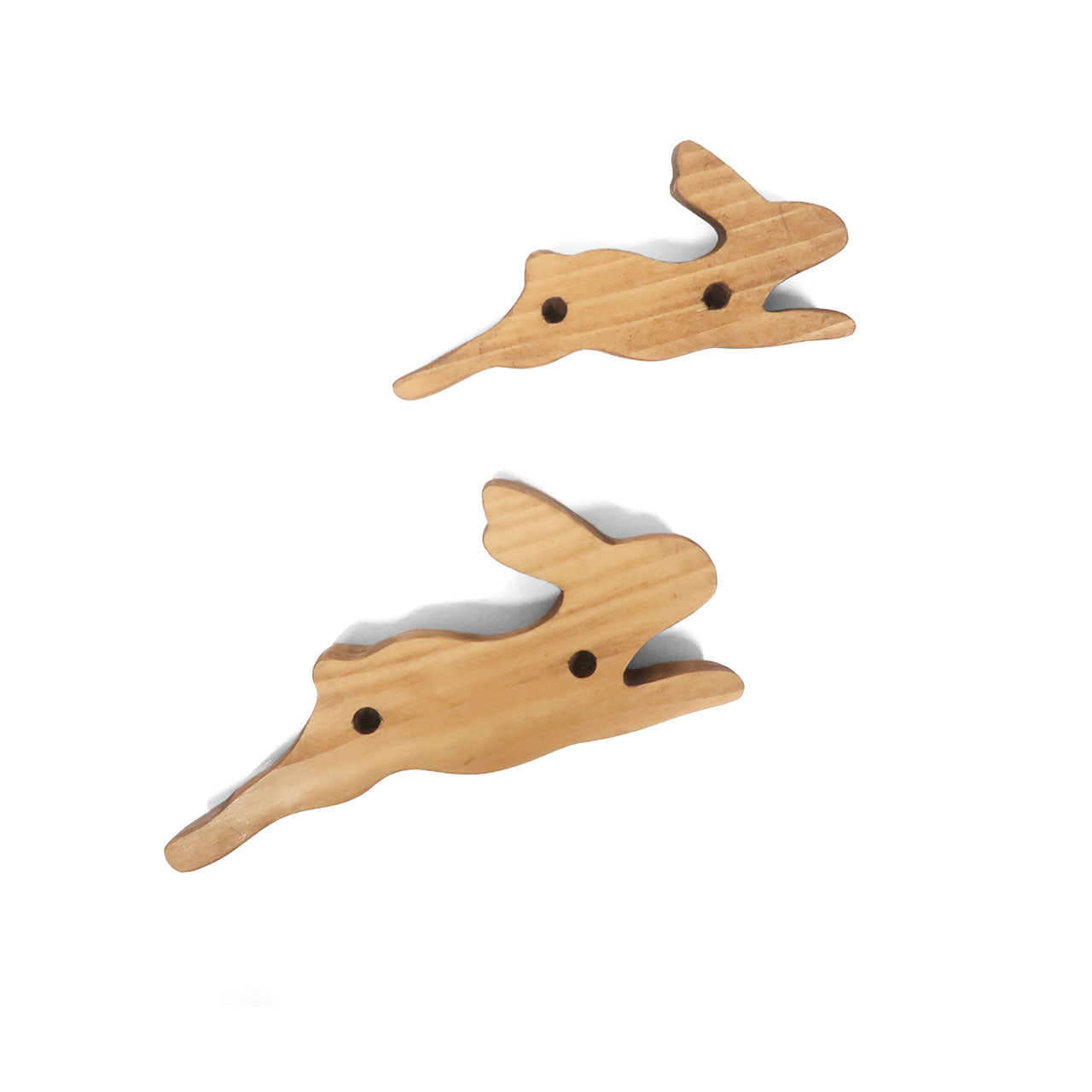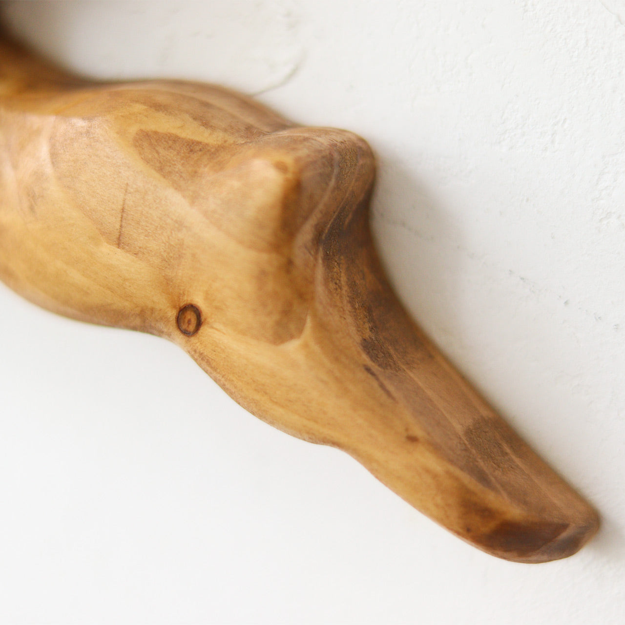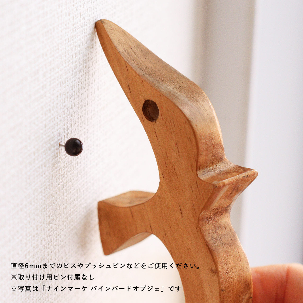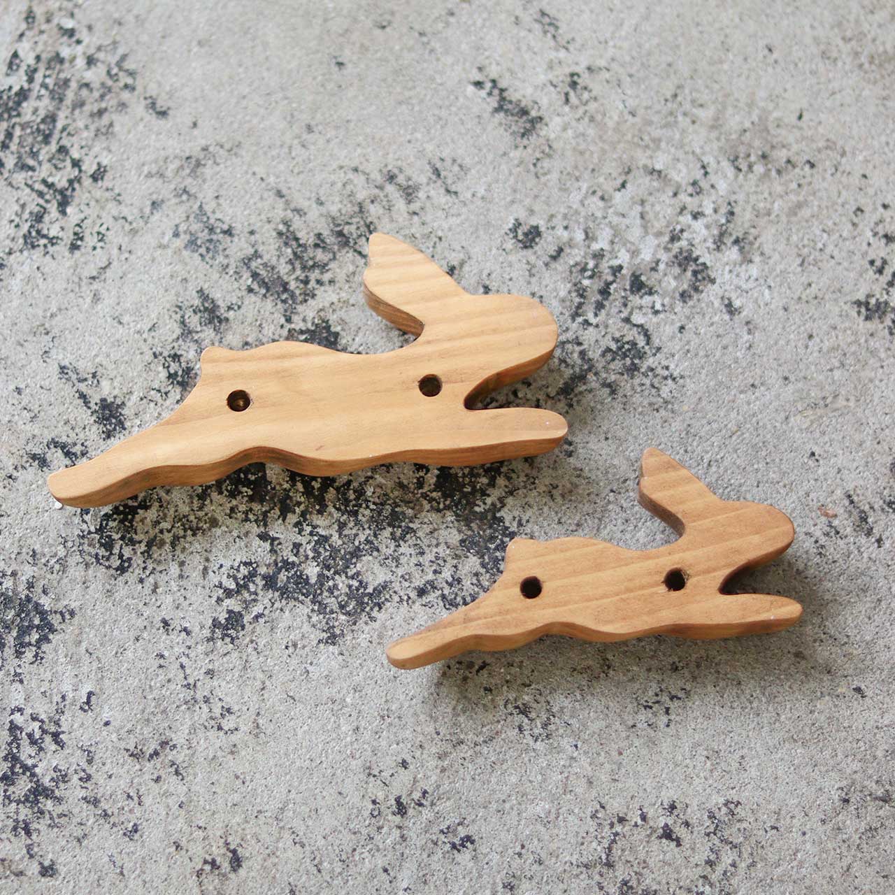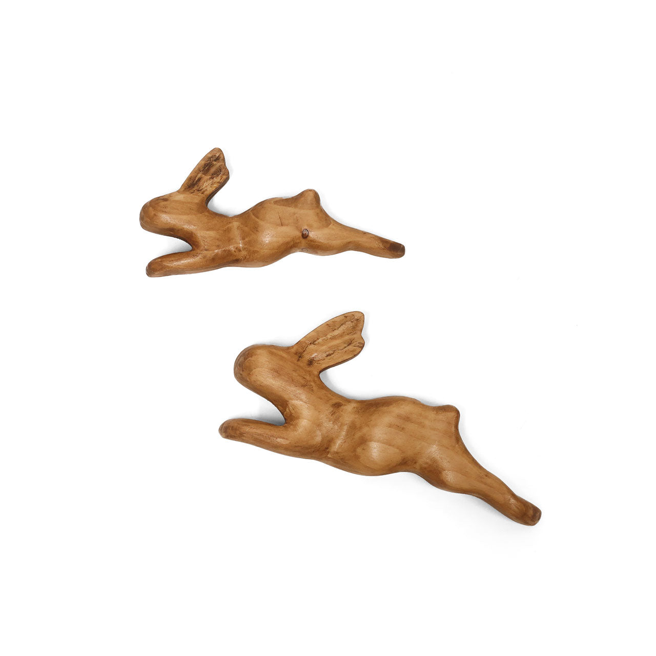 北欧テイストのお部屋にぴったりなうさぎをモチーフにした木製オブジェ。うさぎが伸びやかに跳ねる様子を、木材ならではの柔らかな曲線で表現したウォールオブジェ。壁に取り付けるための穴が裏面に2カ所設けられており、直径6mmまでのビスやプッシュピンを使って設置いただく仕様です。軽量なパイン材を使用し、さらにアンティークのような重厚感を出すために一つ一つ手作業で塗装を施しています。パイン材の自然な木目が美しく、どんなインテリアにも調和し溶け込んでくれます。(※天然木を使用しているため、木目や節の出方、色合いに個体差があります。予めご了承ください。)シンプルで愛らしいウサギのシルエットが、どんな部屋にもやさしく溶け込み空間を明るく演出します。SとL、2サイズセットでのお届けです。