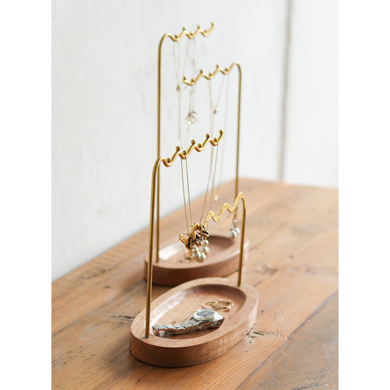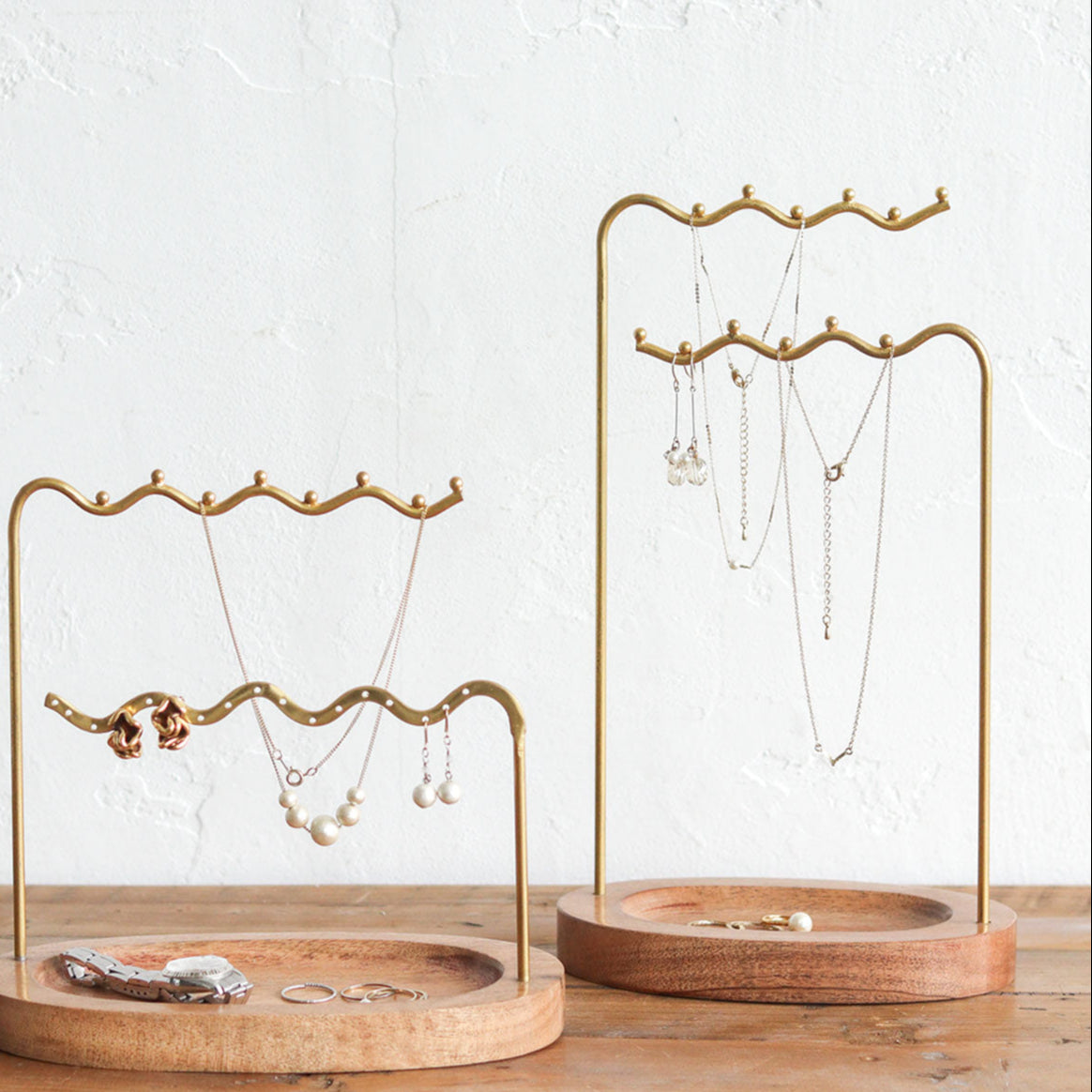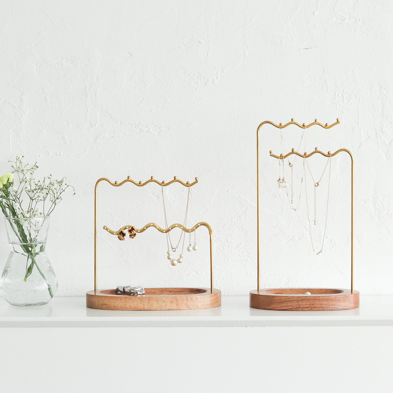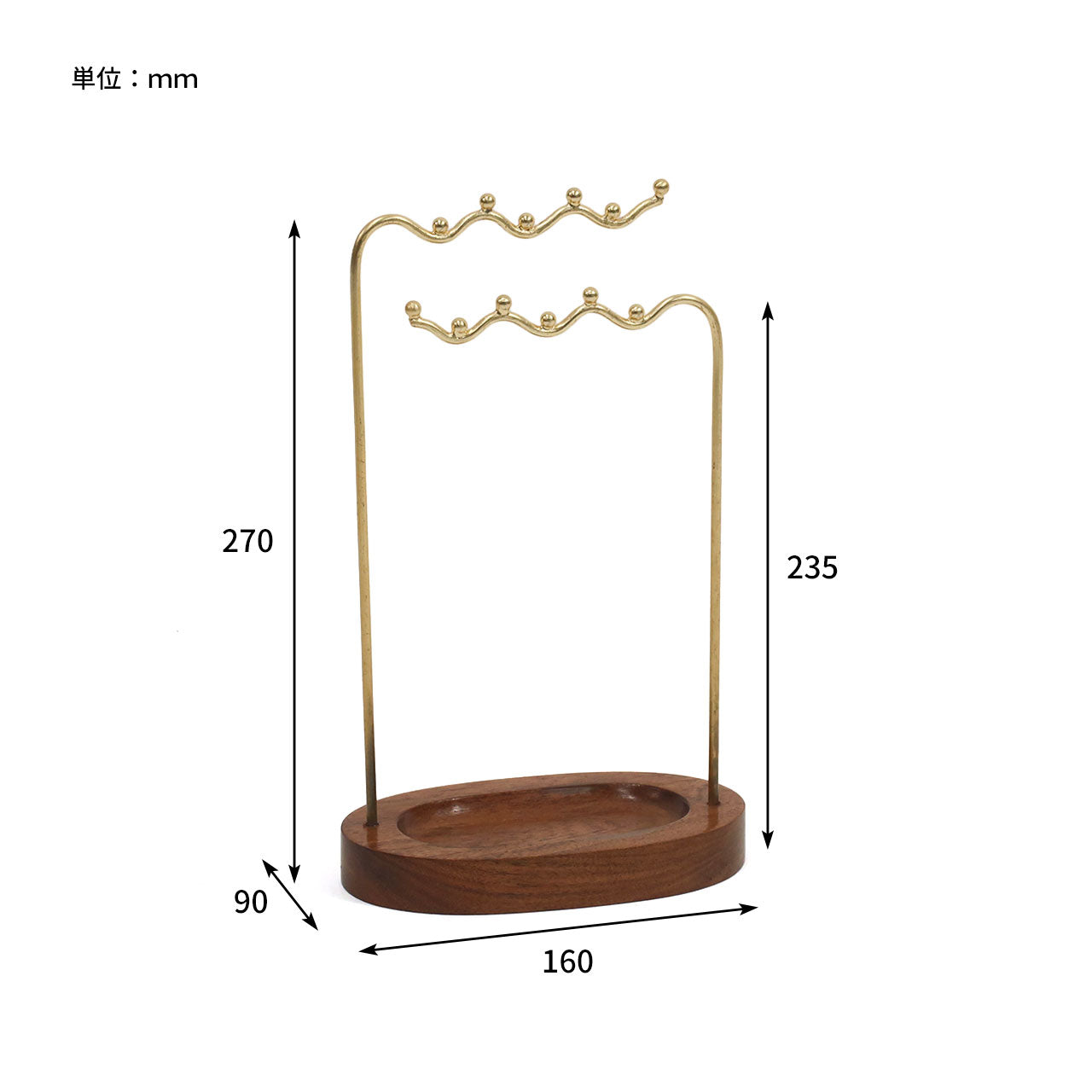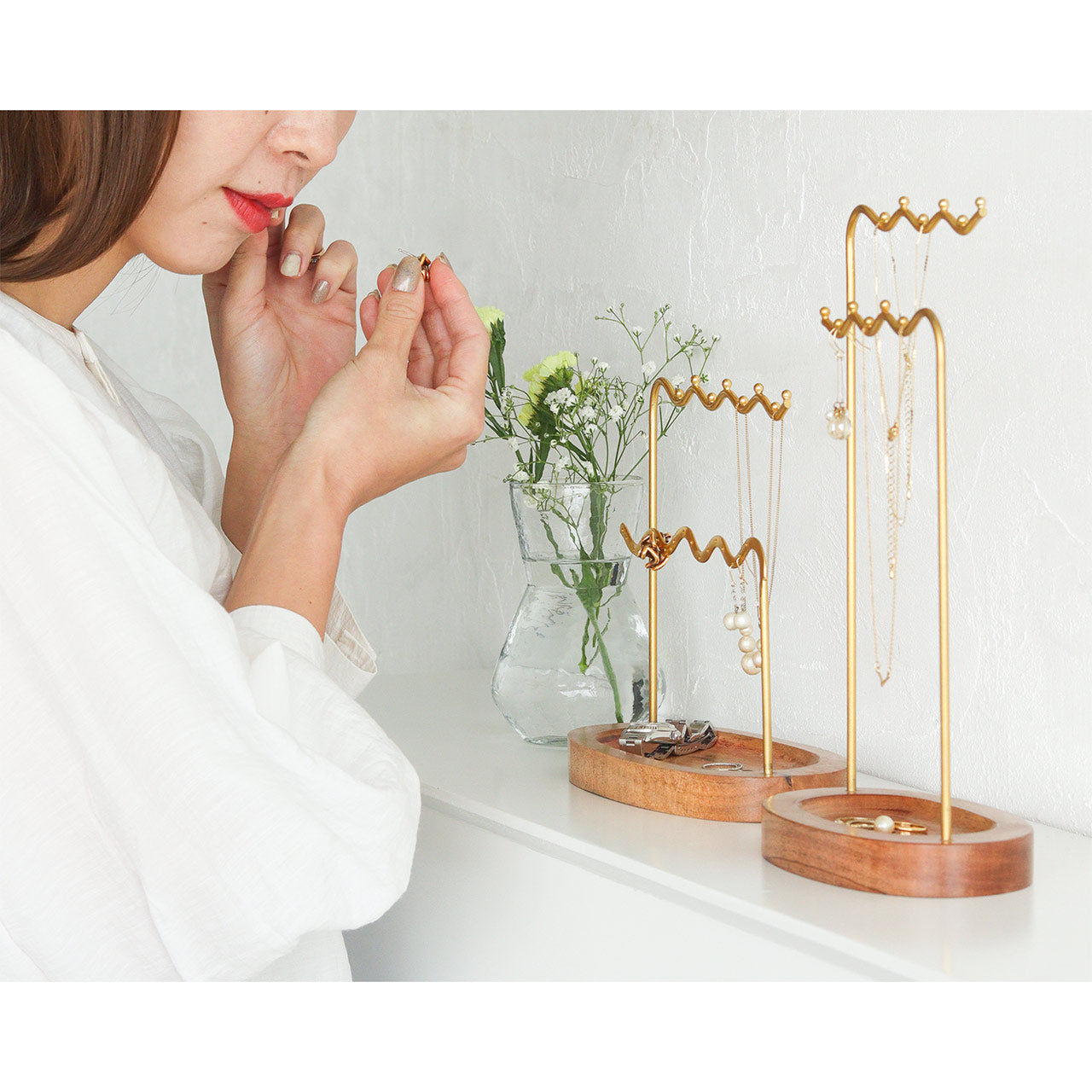 アクセサリーをアイアンで出来た波状のバーに掛けて見せる収納を楽しめるアクセサリースタンド。木目が美しいアカシアの台座とゴールド仕上げのアイアンがどこか懐かしいアンティークのような雰囲気を感じさせます。タイプはローとハイの2種類。ロータイプは、手前と奥でバーの種類が異なり、手前はピアス収納に便利な穴付き、奥はブレスレットなど少し長めのアイテムを掛けられるボール付きのバーになっています。ハイタイプは、手前と奥がどちらも同じボール付きのバーになっており、高さもあるので、ネックレスやブレスレットなど長めのアクセサリーを複数収納できます。アカシアで出来た台座部分はトレーになっており、時計や鍵などお出掛けに必要なアイテムの収納が可能です。ローとハイを2つ並べて、種類別に分類して収納すると、散らかりがちなアクセサリー類がすっきり片付きおすすめです。