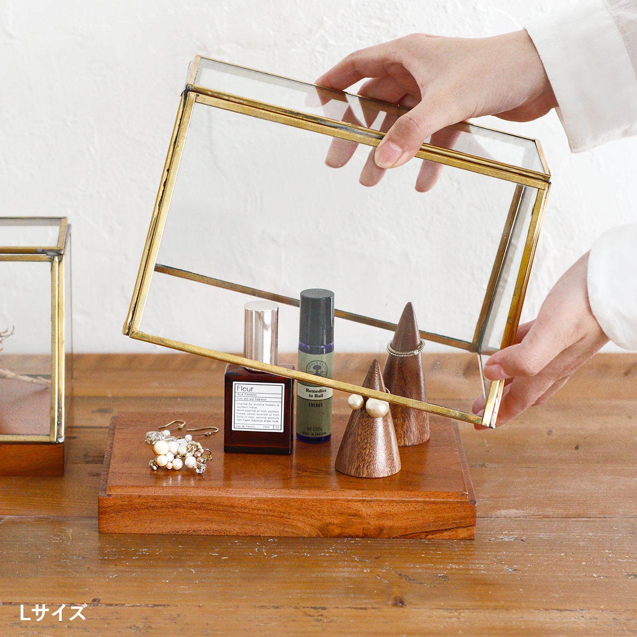 真鍮の枠とアカシアの台座が味わい深いガラスのショーケース。真鍮で出来たゴールドの枠と木目の美しいアカシアの台座がアンティークのような雰囲気を感じさせます。台座にガラスのケースを上から被せるだけの簡単な仕様なので、物の出し入れも簡単。お気に入りのアクセサリーの見せる収納や、ドライフラワーを入れてお部屋の装飾として楽しんだり、記念品やフィギアなどのコレクションケースとしてもおすすめです。