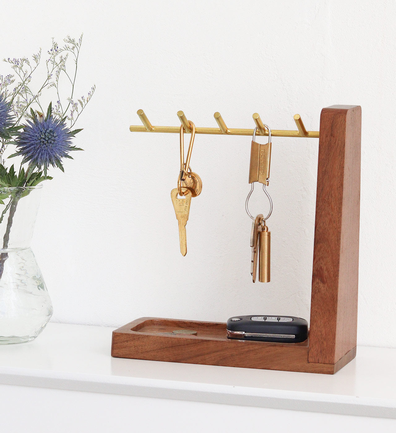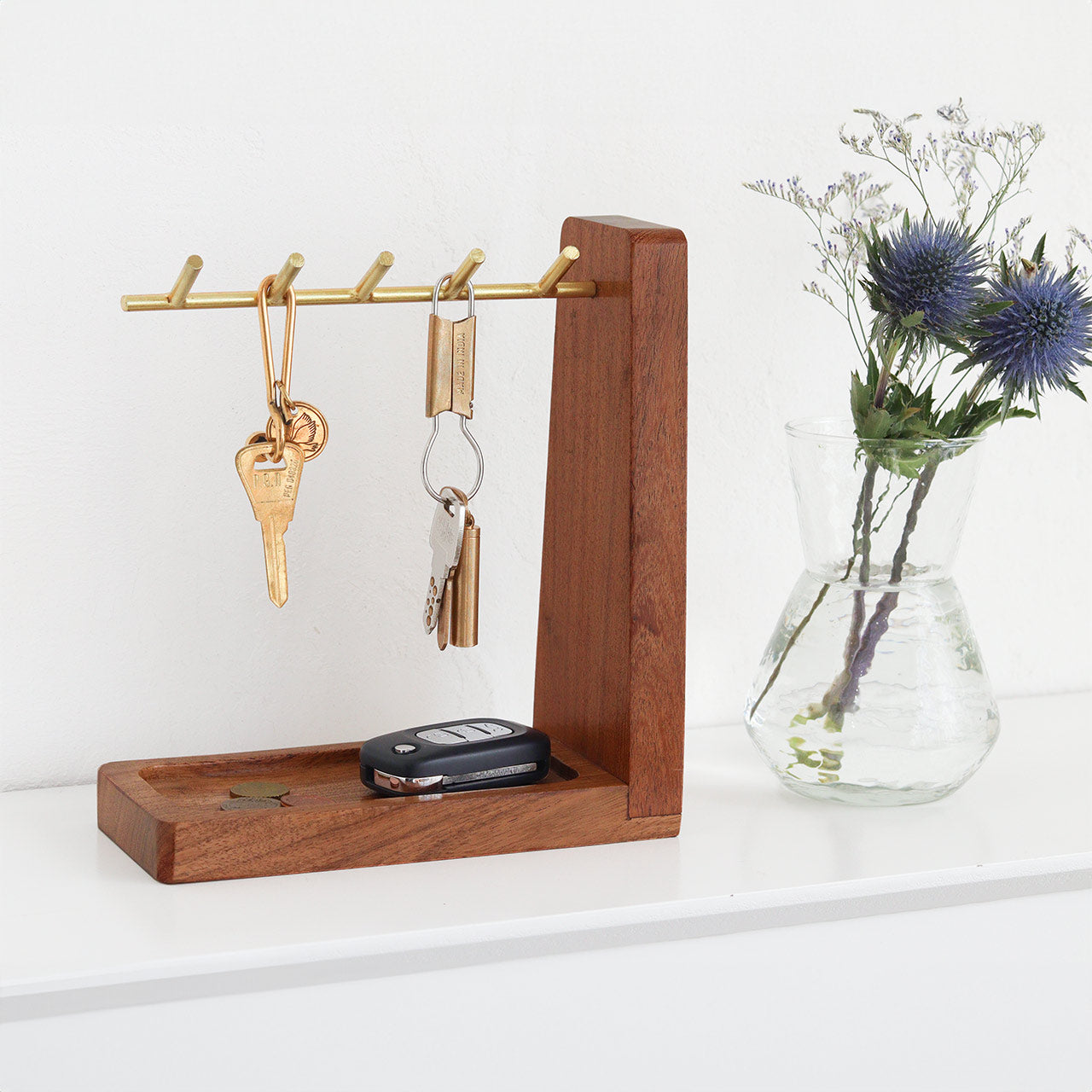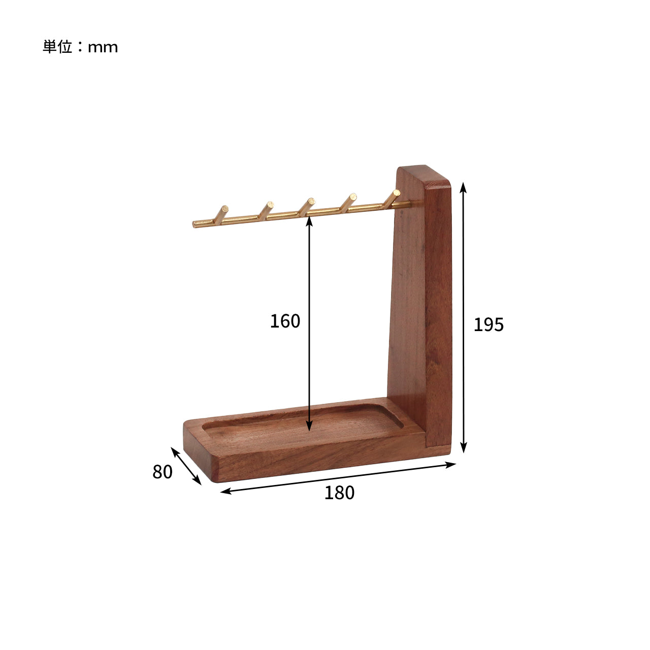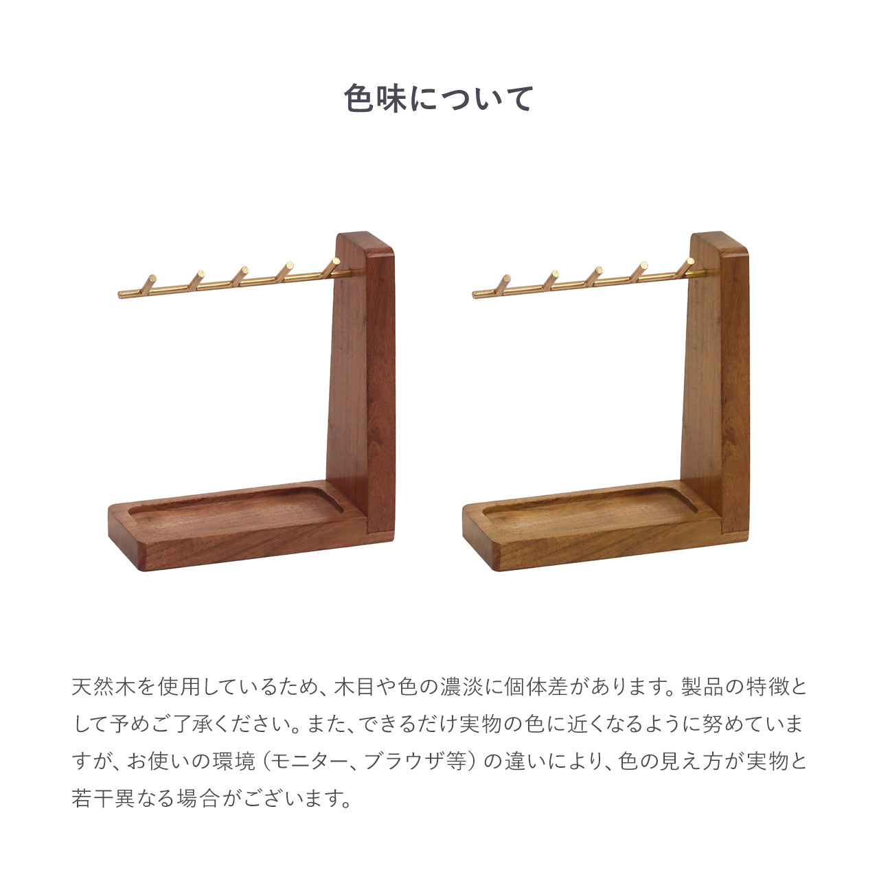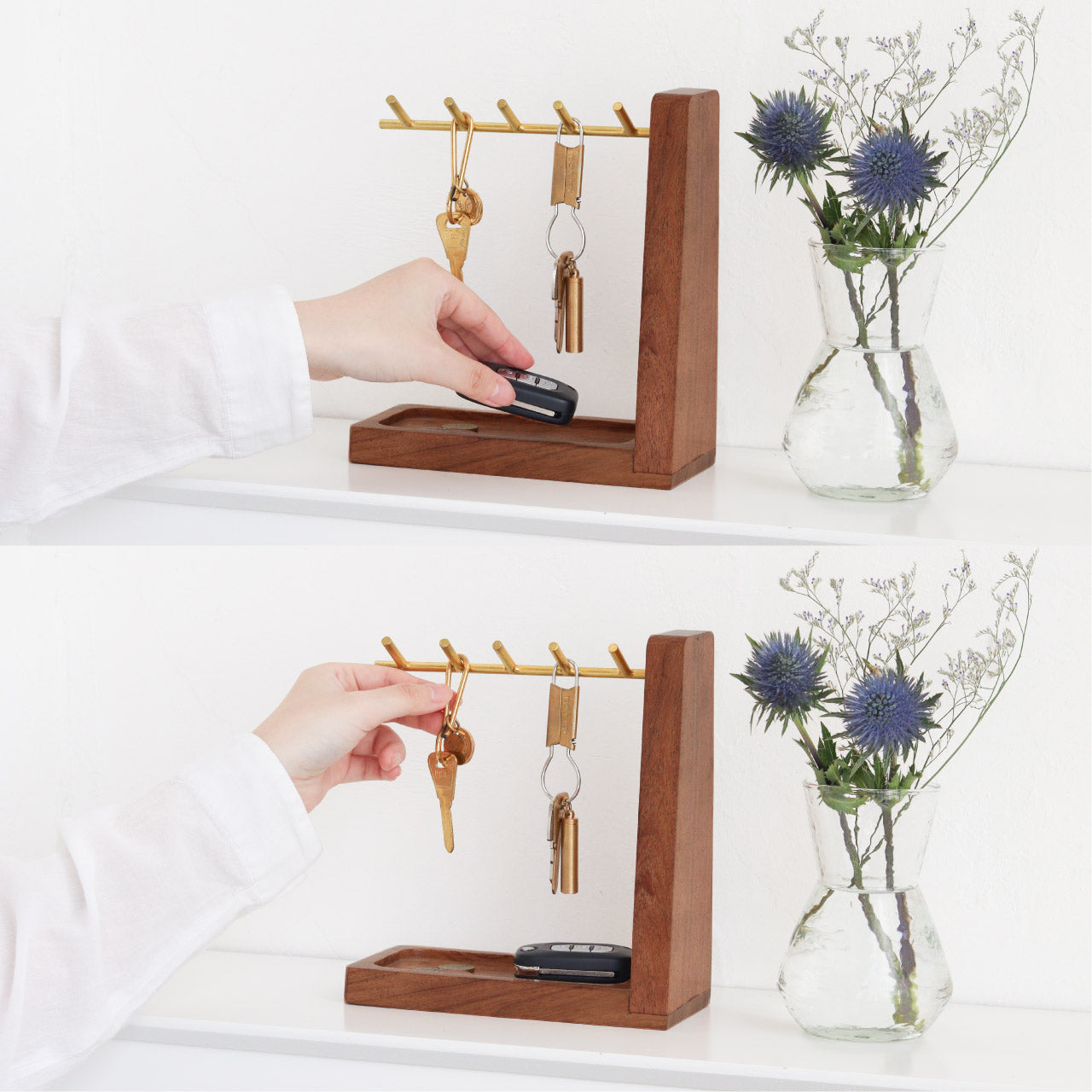 ゴールド仕上げのアイアンのバーに付いたフックに、鍵を掛けて収納できるキースタンド。木目が美しいアカシアの台座とゴールド仕上げのアイアンがどこか懐かしいアンティークのような雰囲気を感じさせます。幅約18cm、奥行き約8cmのコンパクトなサイズ感なので、一人暮らしのお部屋や玄関など省スペースでも場所を取りません。アカシアで出来た台座部分はトレーになっており、時計や香水など身支度に必要なアイテムを収納しておくと便利です。鍵の収納以外にも、指輪やネックレスなどのアクセサリー収納としてもおすすめです。