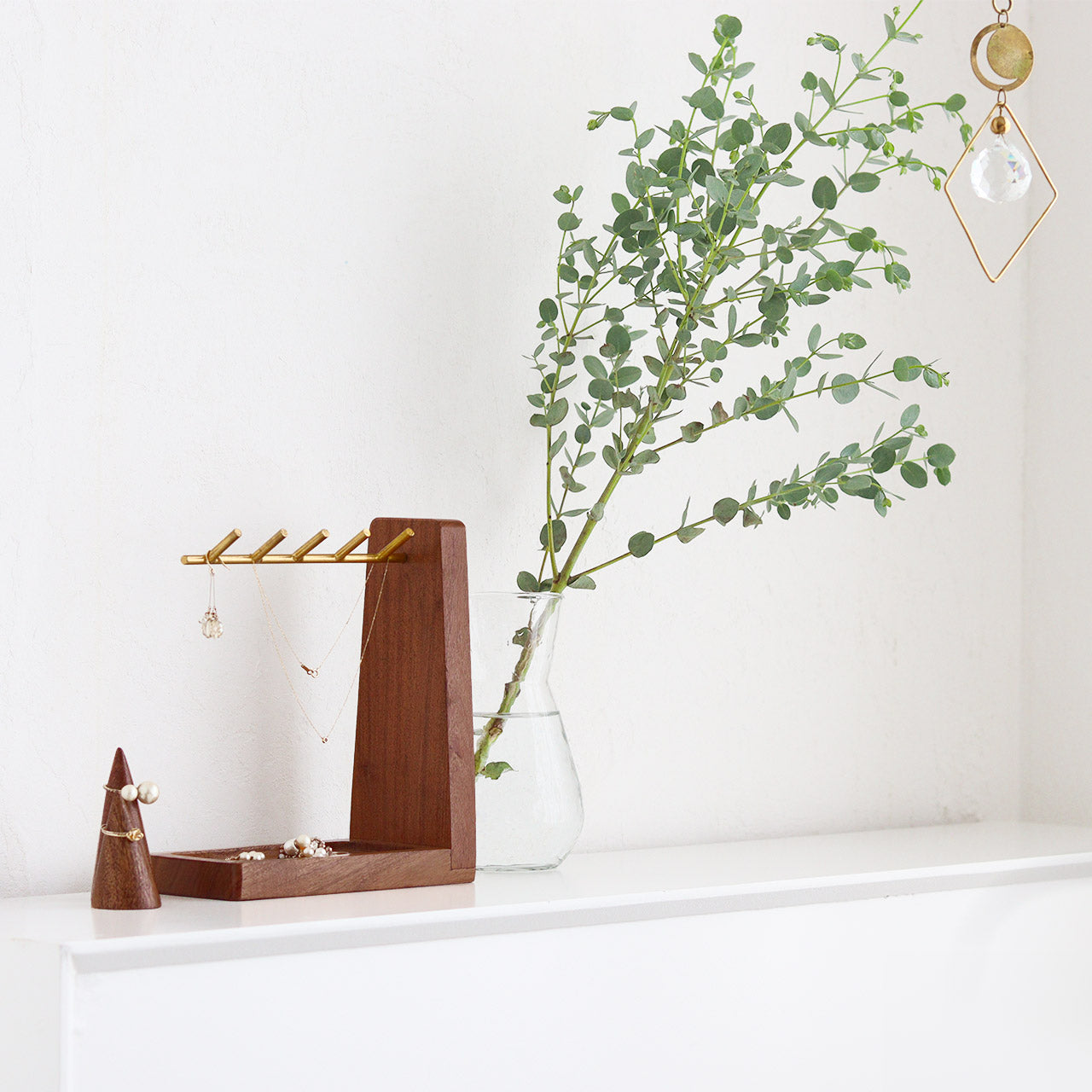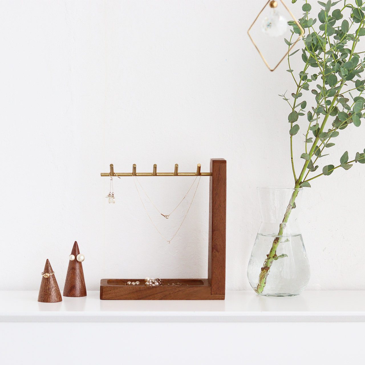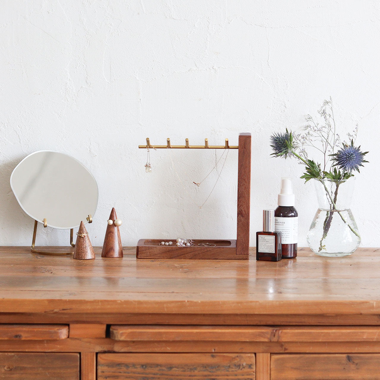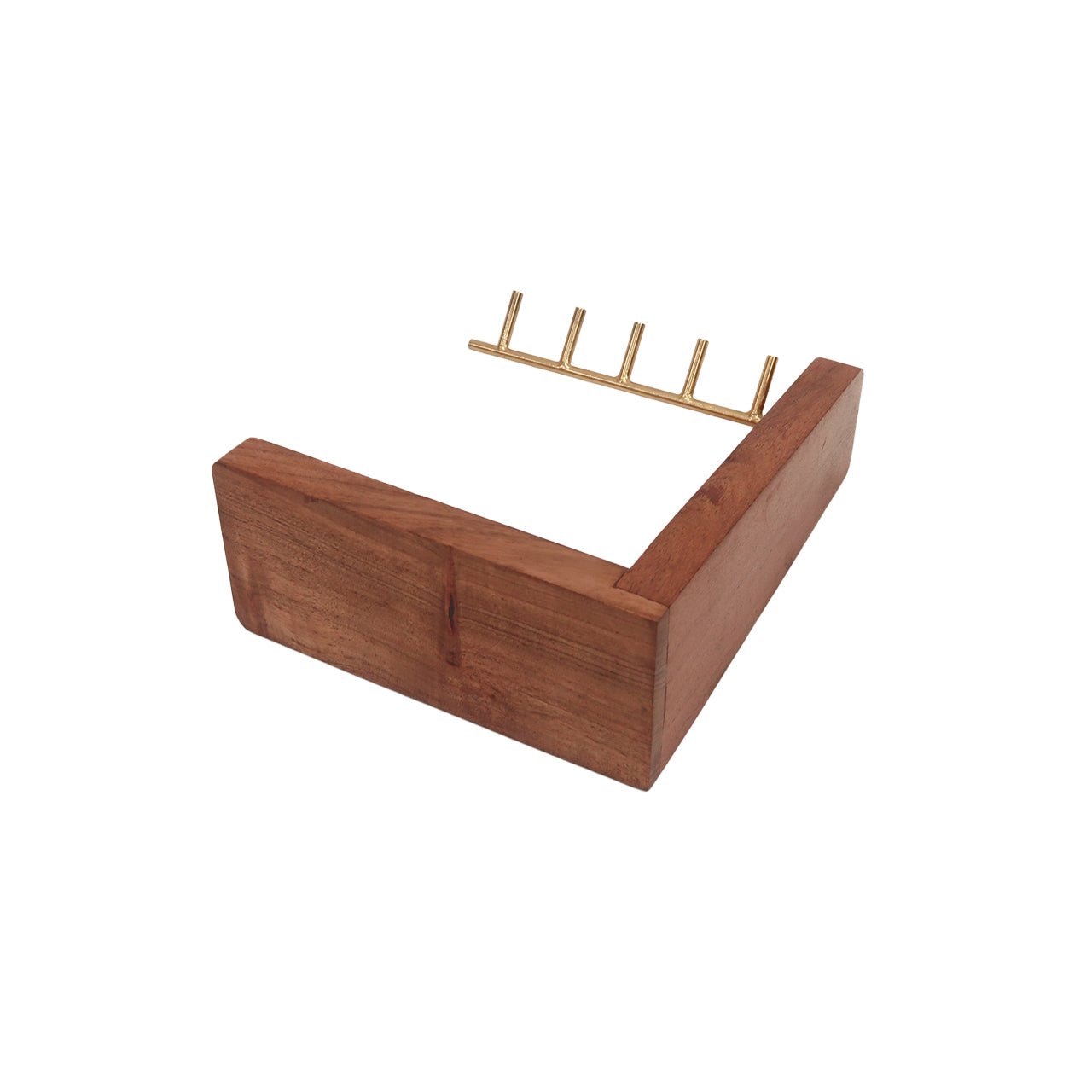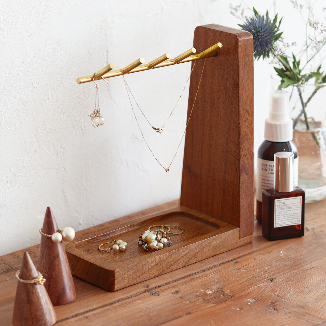 ゴールド仕上げのアイアンのバーに付いたフックに、鍵を掛けて収納できるキースタンド。木目が美しいアカシアの台座とゴールド仕上げのアイアンがどこか懐かしいアンティークのような雰囲気を感じさせます。幅約18cm、奥行き約8cmのコンパクトなサイズ感なので、一人暮らしのお部屋や玄関など省スペースでも場所を取りません。アカシアで出来た台座部分はトレーになっており、時計や香水など身支度に必要なアイテムを収納しておくと便利です。鍵の収納以外にも、指輪やネックレスなどのアクセサリー収納としてもおすすめです。