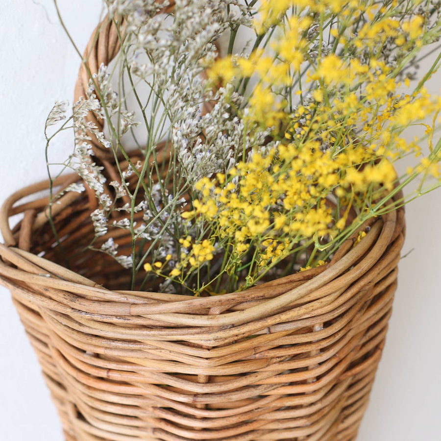 皮付きラタンの温もりを感じるウォールハンギングバスケット。玄関や洗面所などちょっとしたスペースに設置しやすいサイズ感。ラタンと相性の良いドライフラワーを飾ったり、小物を入れたりと用途に合わせて様々な使い方が可能です。ラタンは使い込むほどに、色艶が深まる素材です。時間が経つにつれて、さらに豊かな表情を見せるラタンの経年変化もお楽しみください。