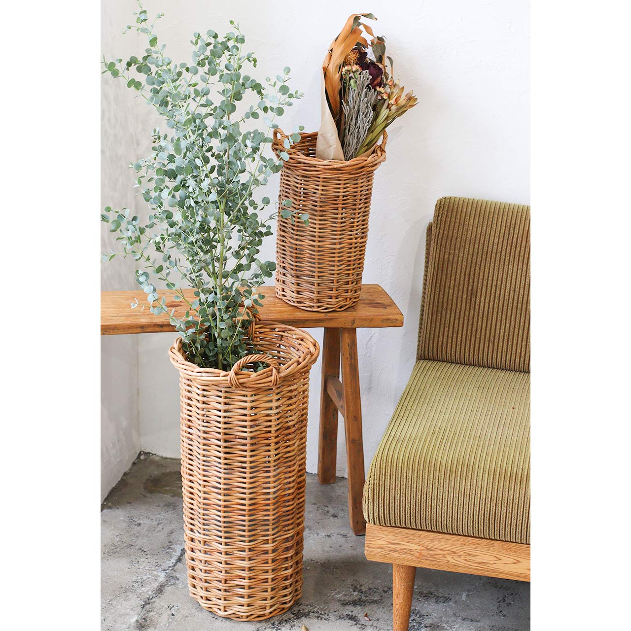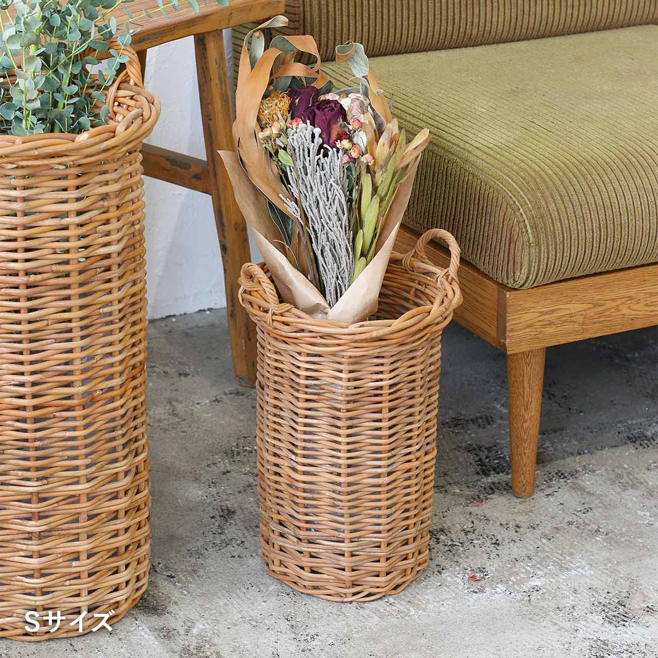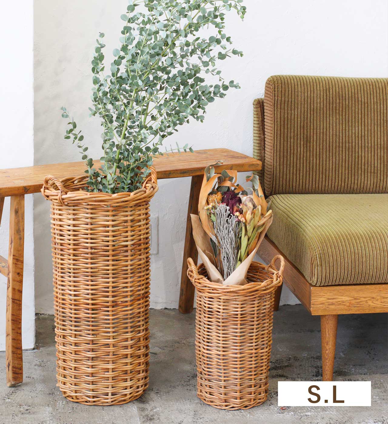 皮付きラタンの温もりを感じるバスケット。収まりの良い円筒型の形状なので、狭いスペースやデッドスペースを有効活用できます。Sサイズは直径22cm×高さ33cmの小さめサイズ。ドライフラワーを飾ったり、トイレではトイレットペーパーを収納したり、ちょっとしたゴミ箱にもできるサイズ感。Lサイズは直径28cm×高さ55cmの大きめサイズ。枝ものなど大ぶりの植物を飾ったり、玄関では傘立てとしても使いやすいサイズ感です。(※傘立てとしてご使用の際は受け皿をご用意ください)見た目によらず軽量で、持ち手も付いているので持ち運びも楽々。様々なシーンでマルチにご活用いただけます。
