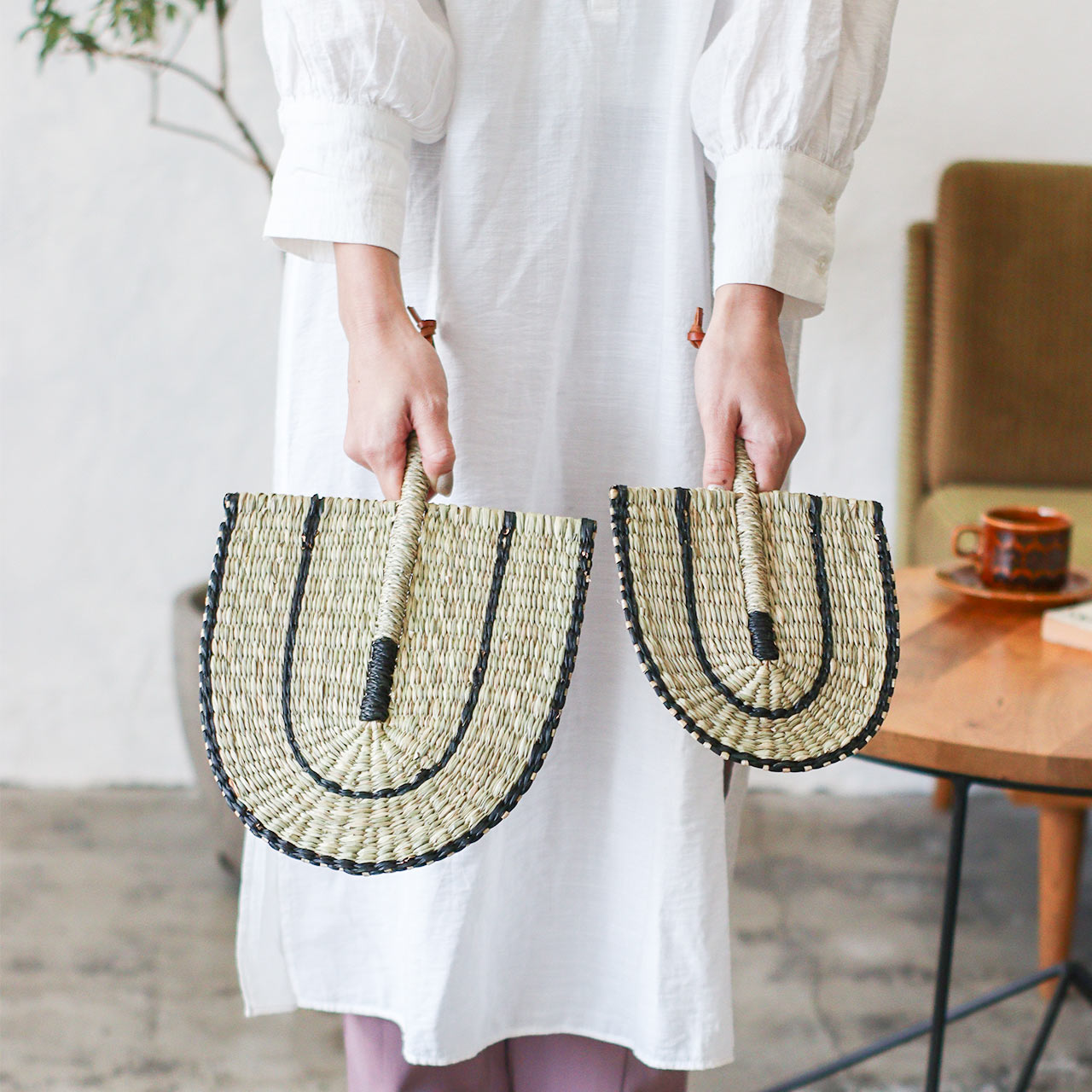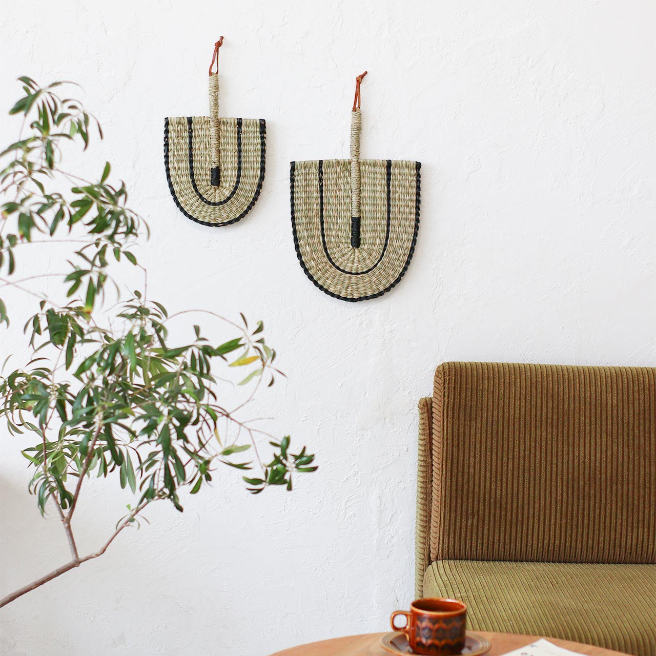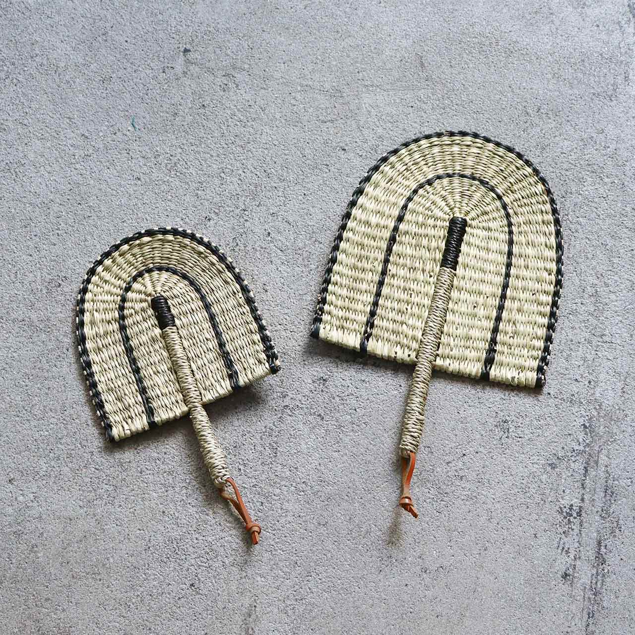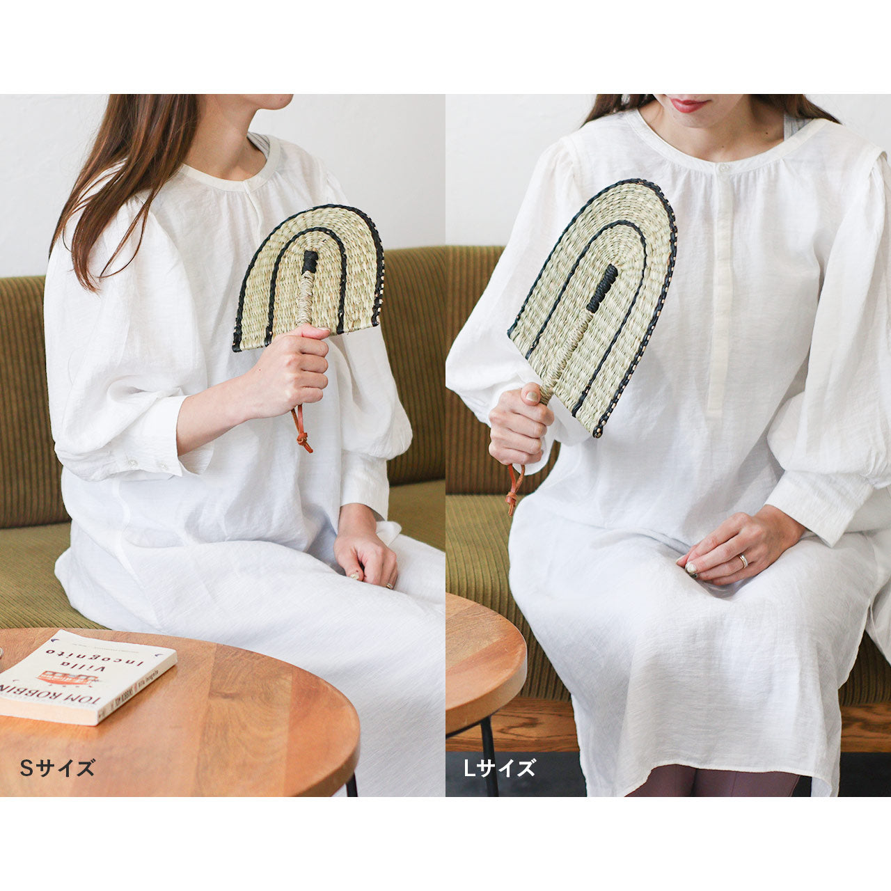 天然素材の「シーグラス」で編まれたうちわ。シーグラスという水草の一種を使い、一つ一つ手編みで仕上げました。日本では畳の材料として使われているイグサに良く似た、素朴で親しみやすいテクスチャーです。吊り下げて収納できる革紐付きで、うちわとして使わない時もそのまま出してオブジェのように飾っておきたくなる、インテリアとしても楽しめるうちわです。サイズはSとLの2種類。Sサイズは、屋内での涼取りや持ち歩きに。Lサイズは、大きな風を起こしやすいため、夏の暑さ対策や、料理を冷ます場面などで活躍してくれます。