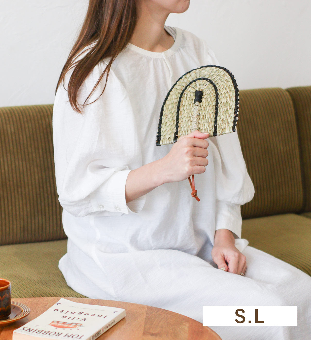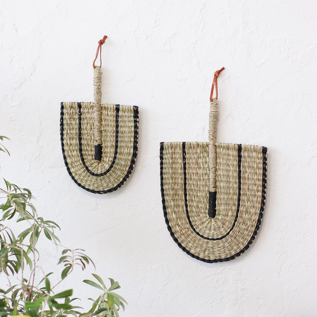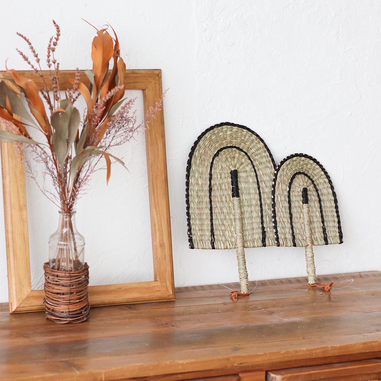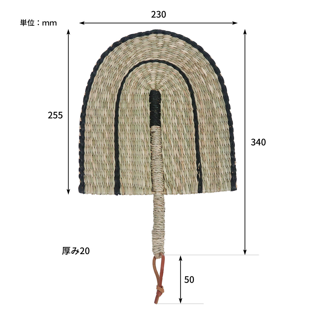 天然素材の「シーグラス」で編まれたうちわ。シーグラスという水草の一種を使い、一つ一つ手編みで仕上げました。日本では畳の材料として使われているイグサに良く似た、素朴で親しみやすいテクスチャーです。吊り下げて収納できる革紐付きで、うちわとして使わない時もそのまま出してオブジェのように飾っておきたくなる、インテリアとしても楽しめるうちわです。サイズはSとLの2種類。Sサイズは、屋内での涼取りや持ち歩きに。Lサイズは、大きな風を起こしやすいため、夏の暑さ対策や、料理を冷ます場面などで活躍してくれます。
