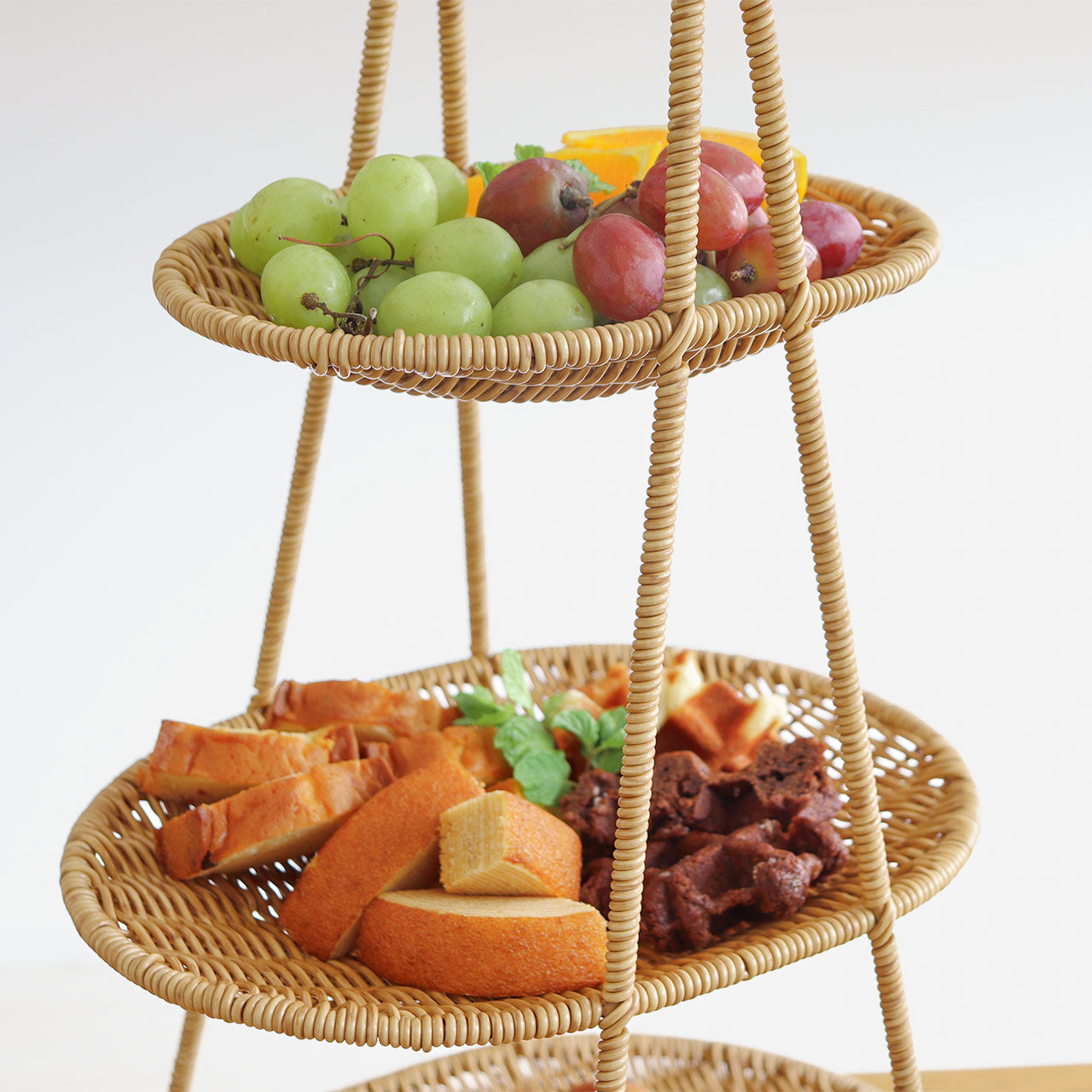ケーキや焼き菓子、スコーンなどを載せて楽しめるPPラタンで編まれたアフタヌーンティースタンド。ユティルシリーズに、お家でのティータイムを華やかに演出してくれるアフタヌーンティースタンドが登場しました。水や汚れに強いPPラタンで編まれているため、食事中にうっかり濡れてしまった時も安心。ティータイム以外にも、朝食やランチにパンやフルーツを載せたり、食卓以外では、野菜ストッカーや調味料、アクセサリーなどの小物収納に使用したりなど、いろいろな用途で広くお楽しみいただけます。タイプは2段と3段の2種類。2つ並べて飾るのもより華やかになり、おすすめです。