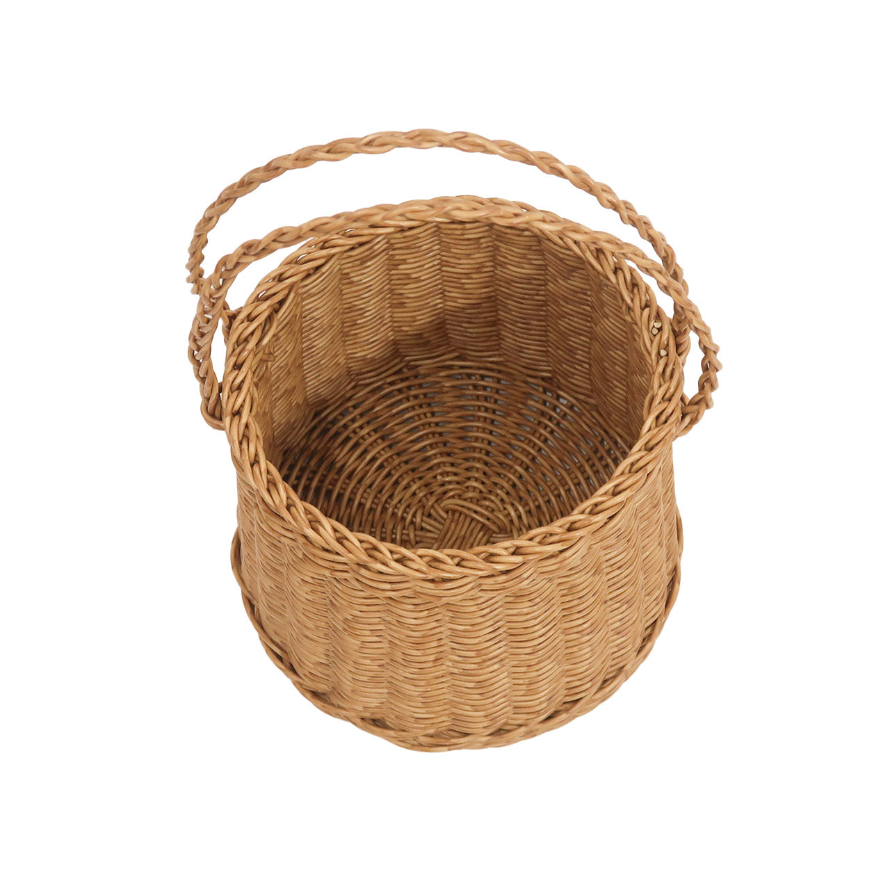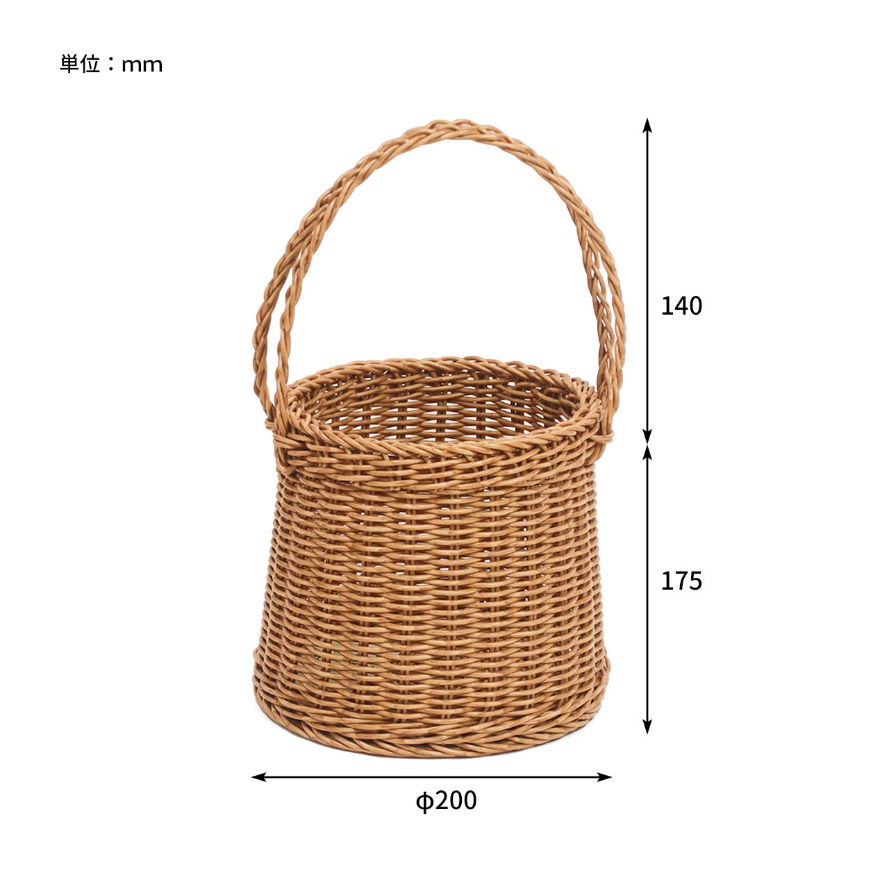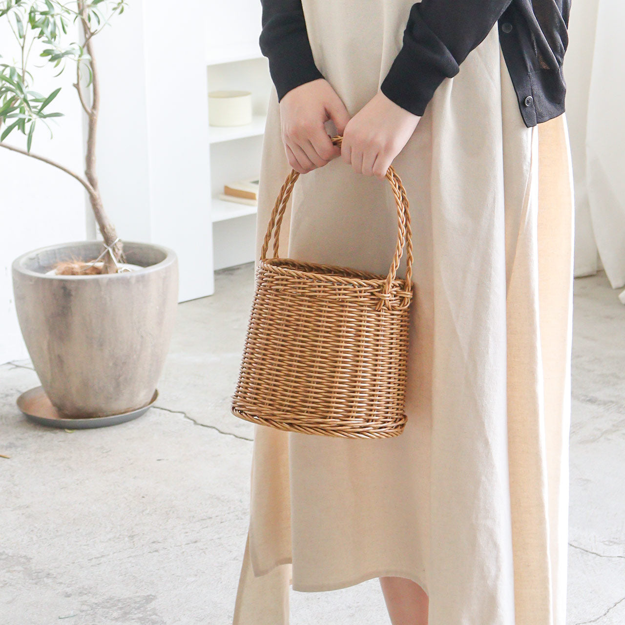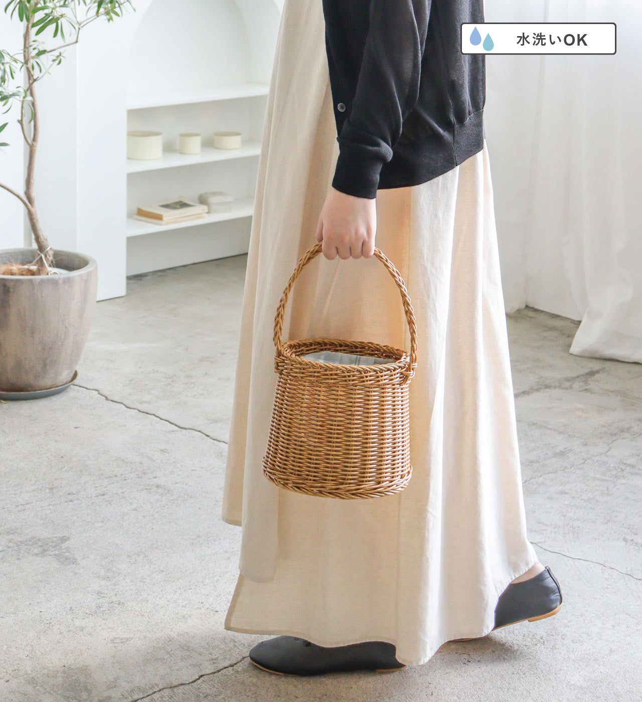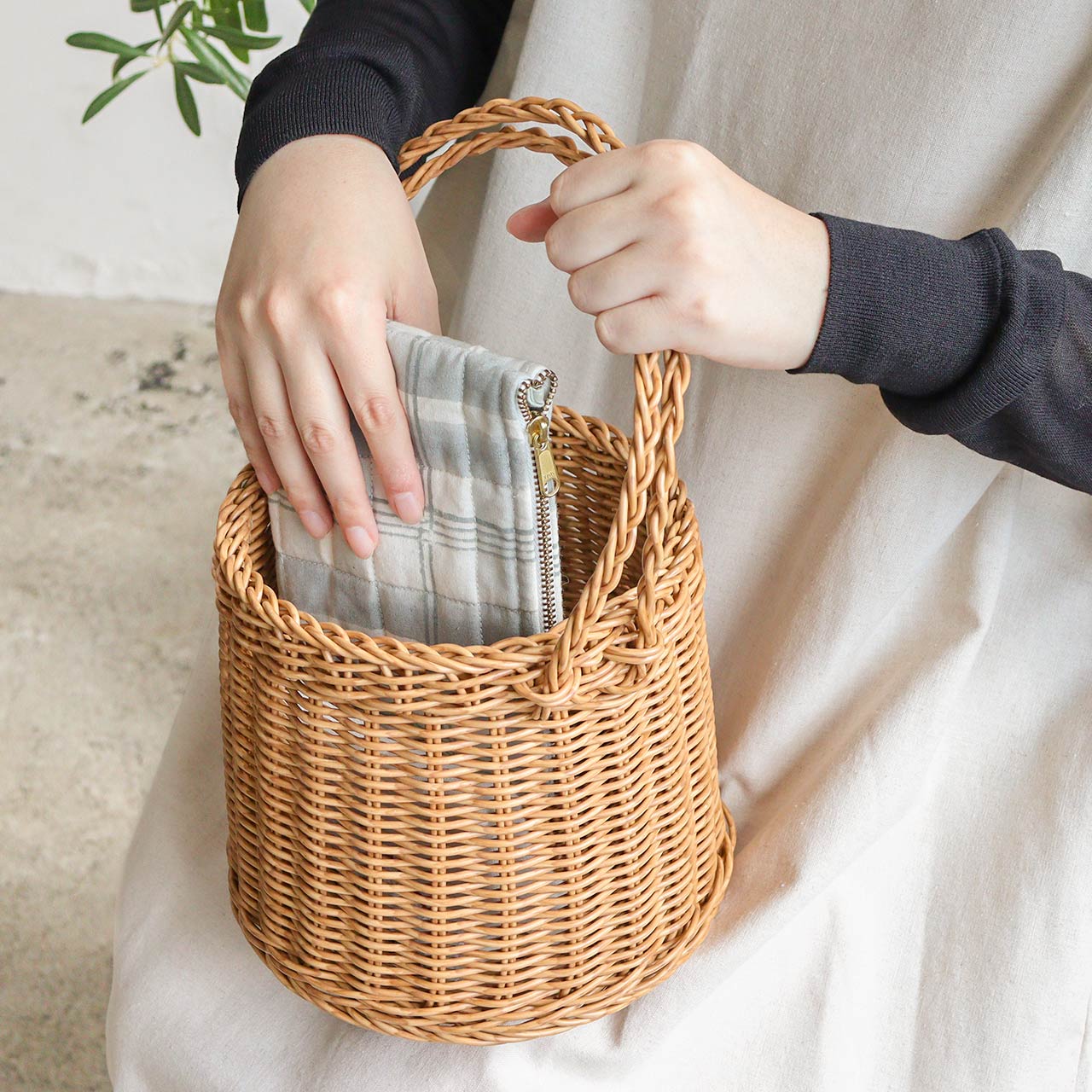 PPラタンで編まれた雨の日でも使える水に強いかごバッグ。天然素材で編まれたような自然な温かみのあるかごバッグ。水に強い素材で編まれているので汚れても水洗いができ、レジャーや雨の日でも気にせず毎日使えます。ハンドル部分もしっかりと編み込まれているため、丈夫な作りでとても軽く使いやすいバッグです。円形のフォルムがシンプルでありながら存在感があり、合わせるだけでいつものコーディネートが新鮮な雰囲気に。見た目以上に収納力もあり、財布、スマホ、化粧ポーチなど、普段のお出掛けセットがすっぽり収まります。よりナチュラルな雰囲気にこだわったナイールカラー。見た目のかわいらしさと、使い勝手の良さを兼ね備えた万能バッグです。
