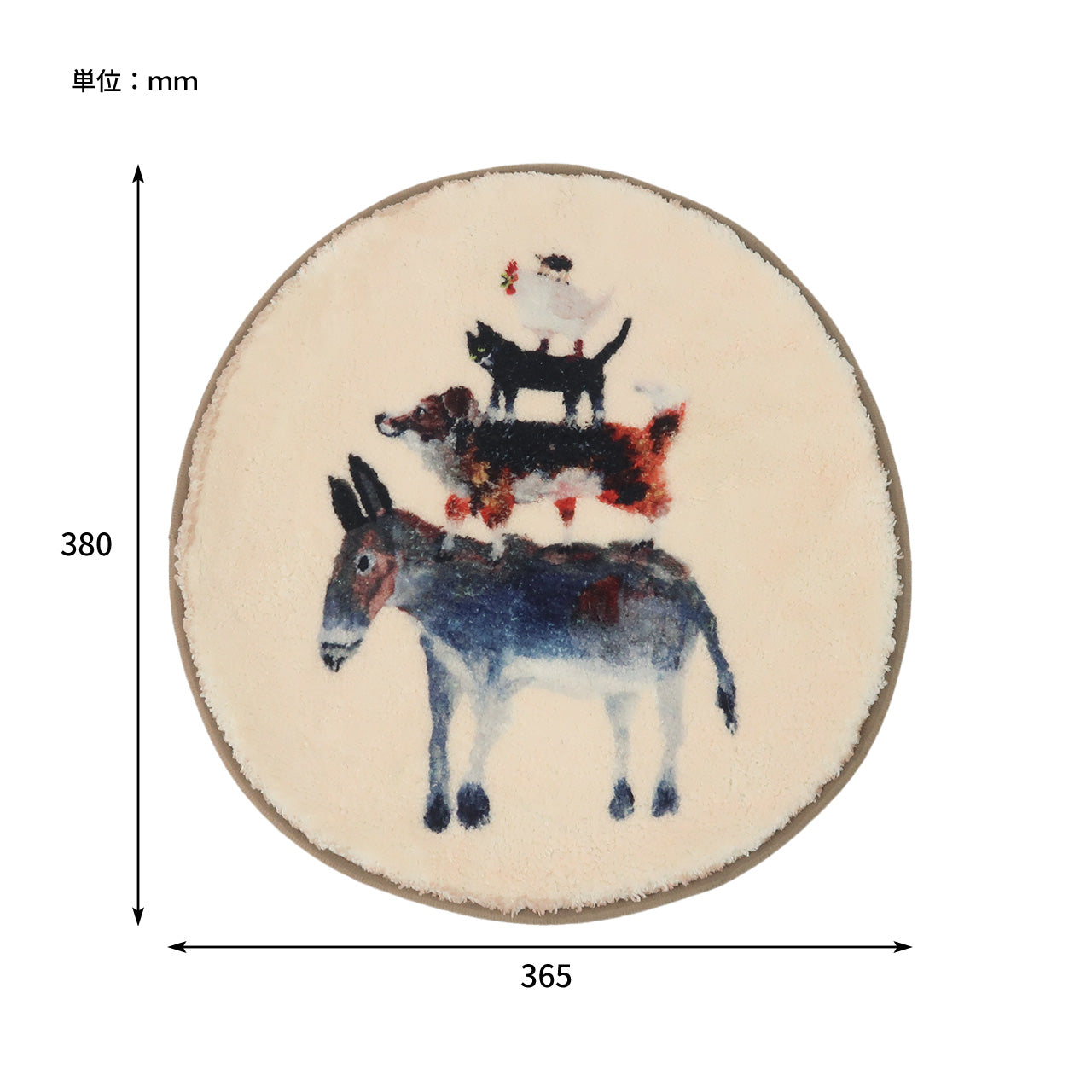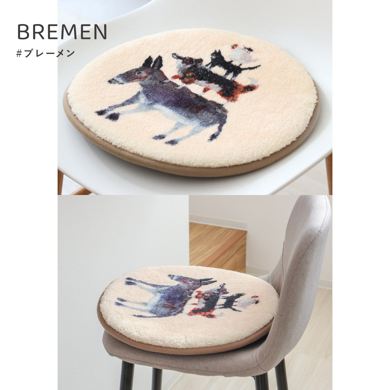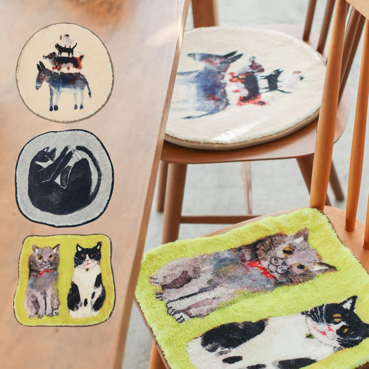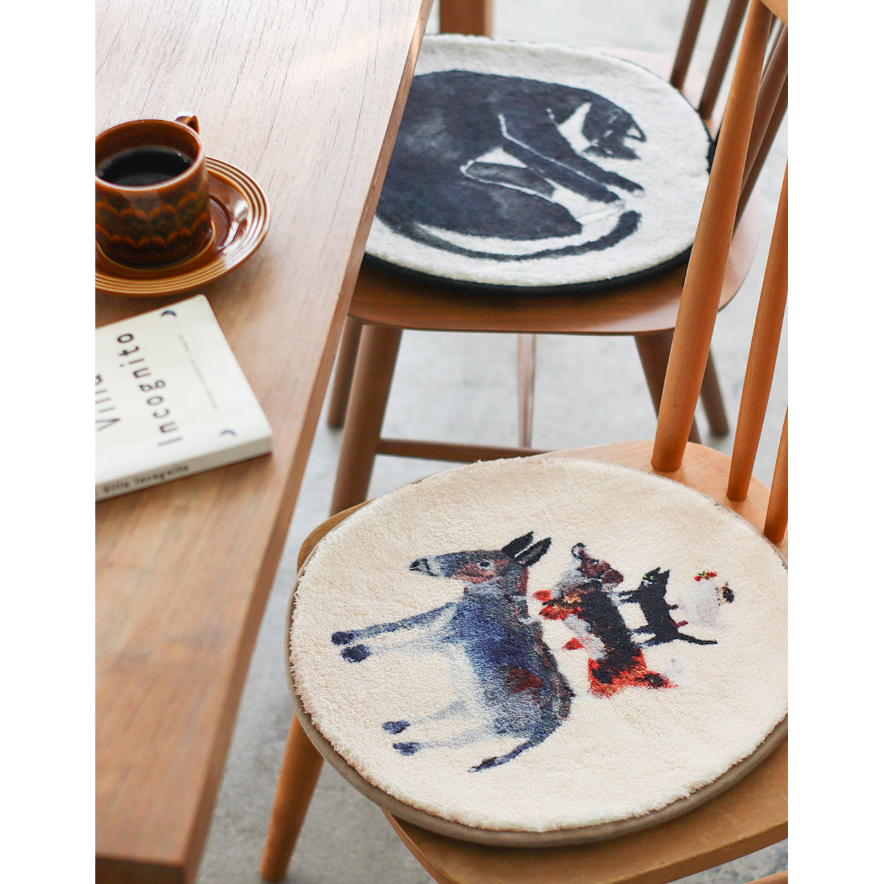 作家「KOTETSU」さんのイラストが描かれたチェアパッド。色彩豊かで生き生きとした動物たちのイラストは見ているだけで元気を与えてくれます。イラストはコテツさんが一緒に生活をしている大好きな「猫」と、有名なグリム童話の1シーンを描いた「ブレーメン」の3種類。中材には低反発のウレタンフォームを使用し、もちもちとした優しい感触。イラストが描かれた座面はふわふわとした質感で、冬場の冷たい椅子や床にも最適です。裏面は滑り止め加工付きなので、椅子から立ち上がってもズレにくく安心です。ダイニングチェアはもちろん、オフィスチェアや、床に直接敷いて座布団としてのご使用もおすすめです。
