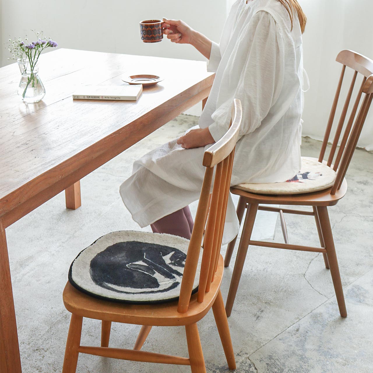作家「KOTETSU」さんのイラストが描かれたチェアパッド。色彩豊かで生き生きとした動物たちのイラストは見ているだけで元気を与えてくれます。イラストはコテツさんが一緒に生活をしている大好きな「猫」と、有名なグリム童話の1シーンを描いた「ブレーメン」の3種類。中材には低反発のウレタンフォームを使用し、もちもちとした優しい感触。イラストが描かれた座面はふわふわとした質感で、冬場の冷たい椅子や床にも最適です。裏面は滑り止め加工付きなので、椅子から立ち上がってもズレにくく安心です。ダイニングチェアはもちろん、オフィスチェアや、床に直接敷いて座布団としてのご使用もおすすめです。
