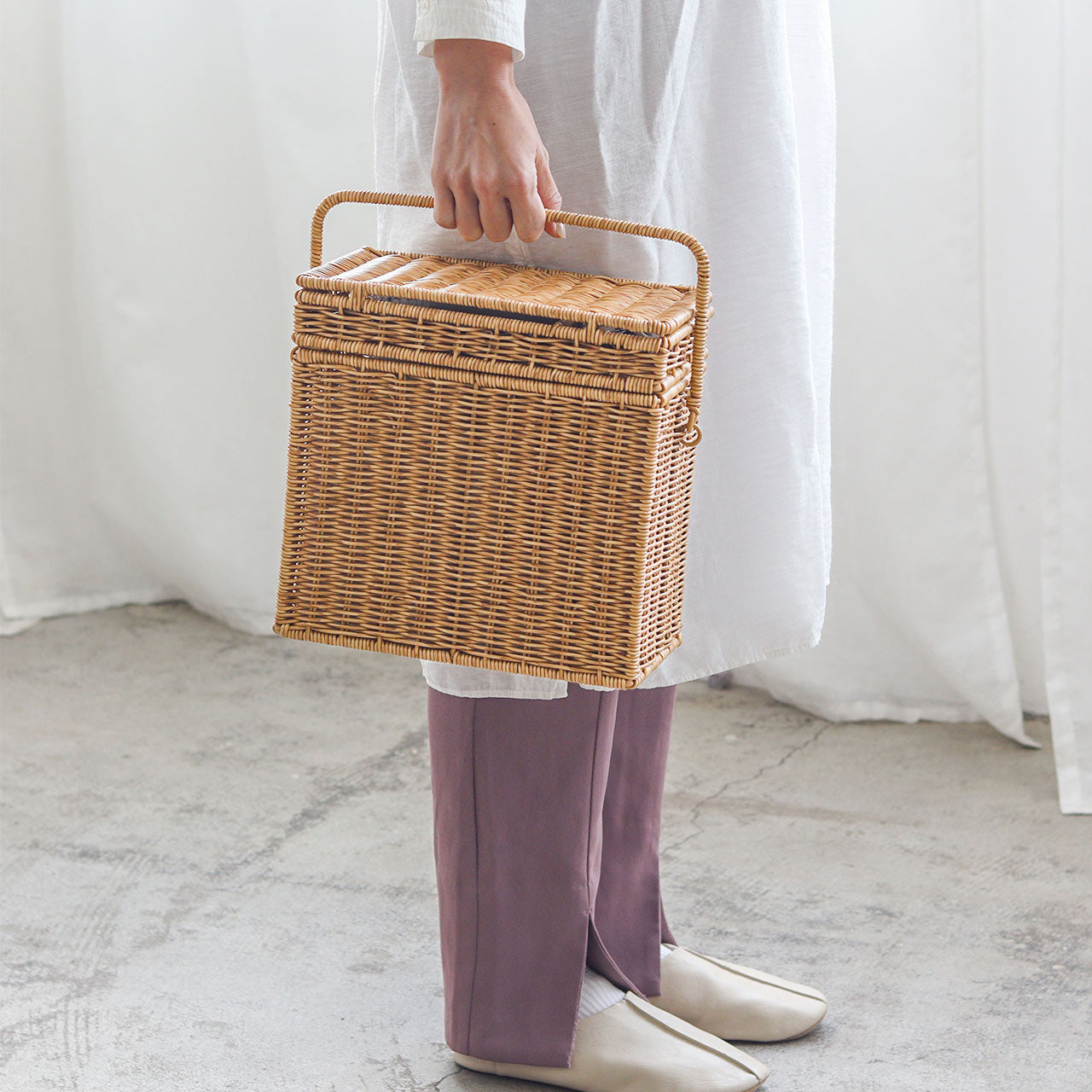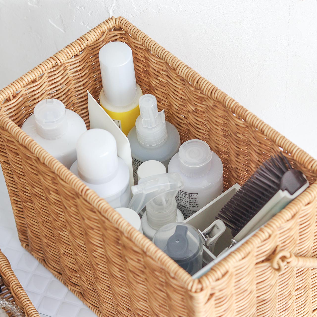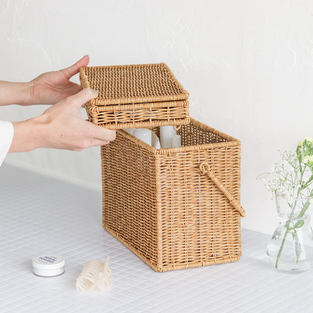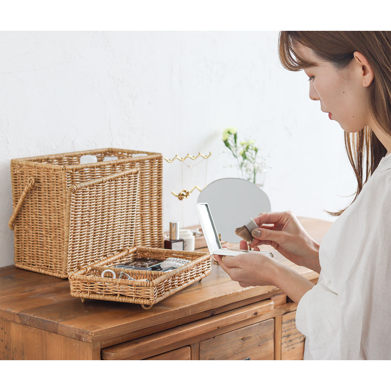 ユティルシリーズに、収納力抜群の持ち手付きコスメボックスが登場しました。毎日のメイク道具がこれ一つで全て収まる、大容量のコスメボックス。水に強いポリプロピレン・ポリエチレンチューブを使って手作業で編まれているので、使用中に汚れてしまっても水洗いができるので安心。(※濡れたままの状態で長期間放置すると錆の原因となります。洗浄後はよく乾燥させてください。)取り外し可能な2段式なので、細々としたメイク道具がスッキリ片付きます。上段には、アイシャドウやチーク、ブラシなどの収納に。下段には、スプレー缶や化粧水ボトルなど高さのある物の収納におすすめです。(高さ18cmまでの物は立てて収納が可能です。)奥行き16cmのスリムなサイズ感と、一見メイクボックスに見えない佇まいが、出しっぱなしでも気にならず、自然にインテリアに溶け込んでくれます。持ち手付きなので、リビングや寝室など様々な場所で気軽にメイクをお楽しみいただけます。メイクボックス以外にも、ソーイングボックスや工具箱、お子さまのお道具箱としてもおすすめです。
