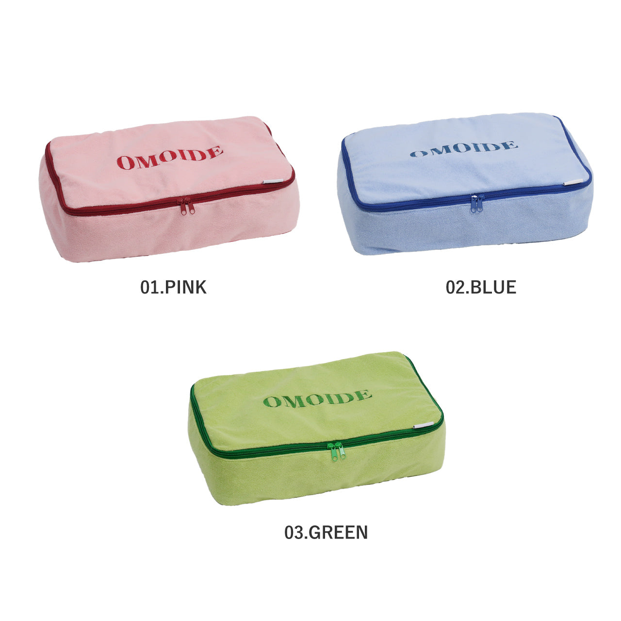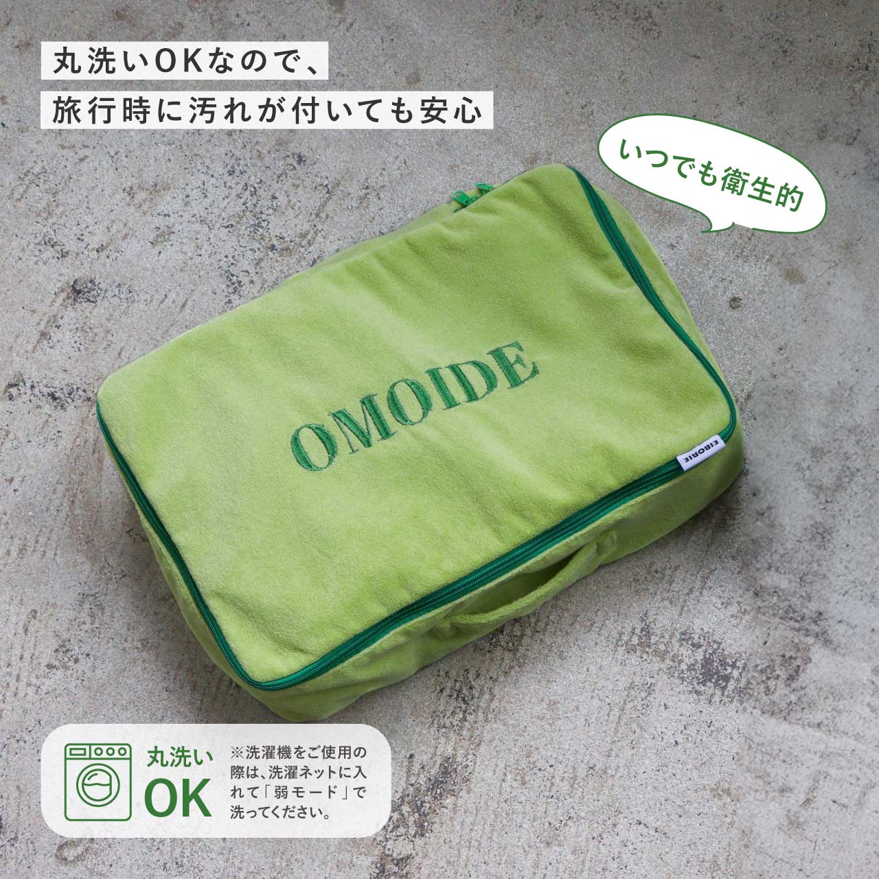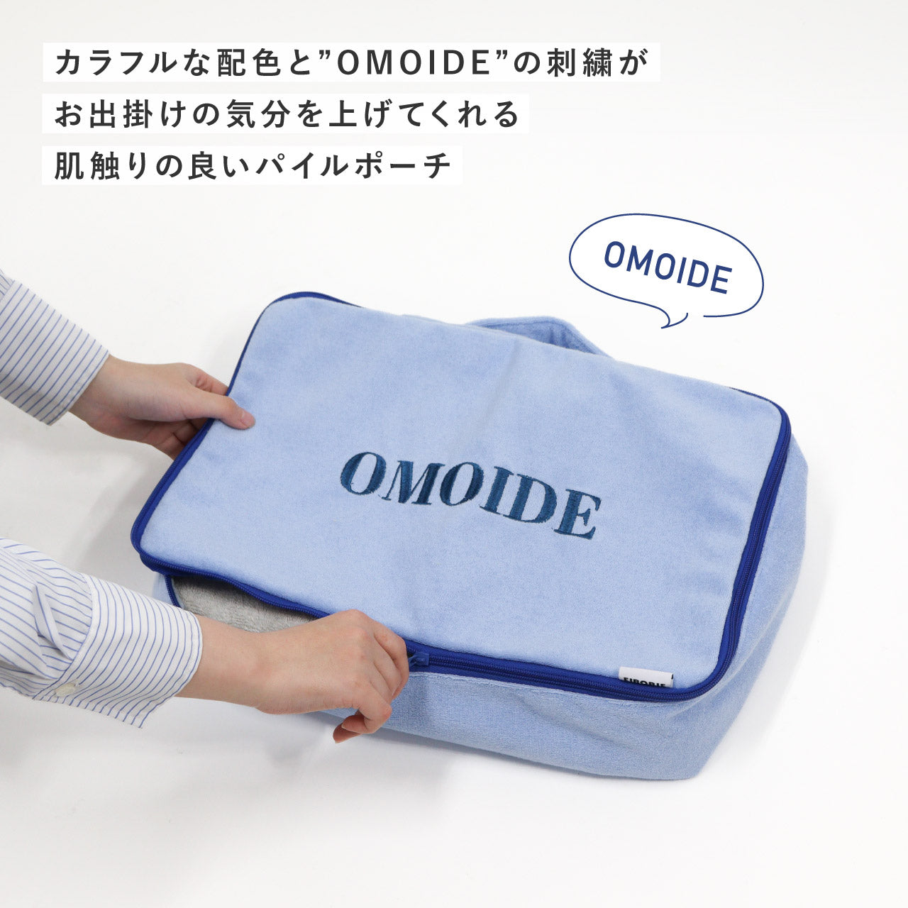 触り心地の良いパイル生地を使用した、トラベル用収納ケース。ポーチの表面に刺繍された"OMOIDE"の文字が目を引く、シンプルながらも遊び心を感じるデザイン。スーツケース、キャリーケースにすっぽり収まるマチの深い四角い形に、持ち出しやすいハンドルも付いています。ファスナーも大きく開いて中が見やすく、ダブルファスナーなので開閉もスピーディーに行えます。片面はメッシュ生地になっており通気性もよく、湿気がこもりやすい使用済みの衣類収納にも安心です。丸洗いも可能なので、いつでも清潔に保てて衛生的。(※手洗いをおすすめしますが、洗濯機をご使用の際は、洗濯ネットに入れて「弱モード」等で洗濯してください。)Lサイズはトラベル用の収納としてはもちろん、ジムやサウナバッグとして日常使いにもおすすめです。同シリーズは小物収納からパッキングまで揃えることができるサイズ展開です。