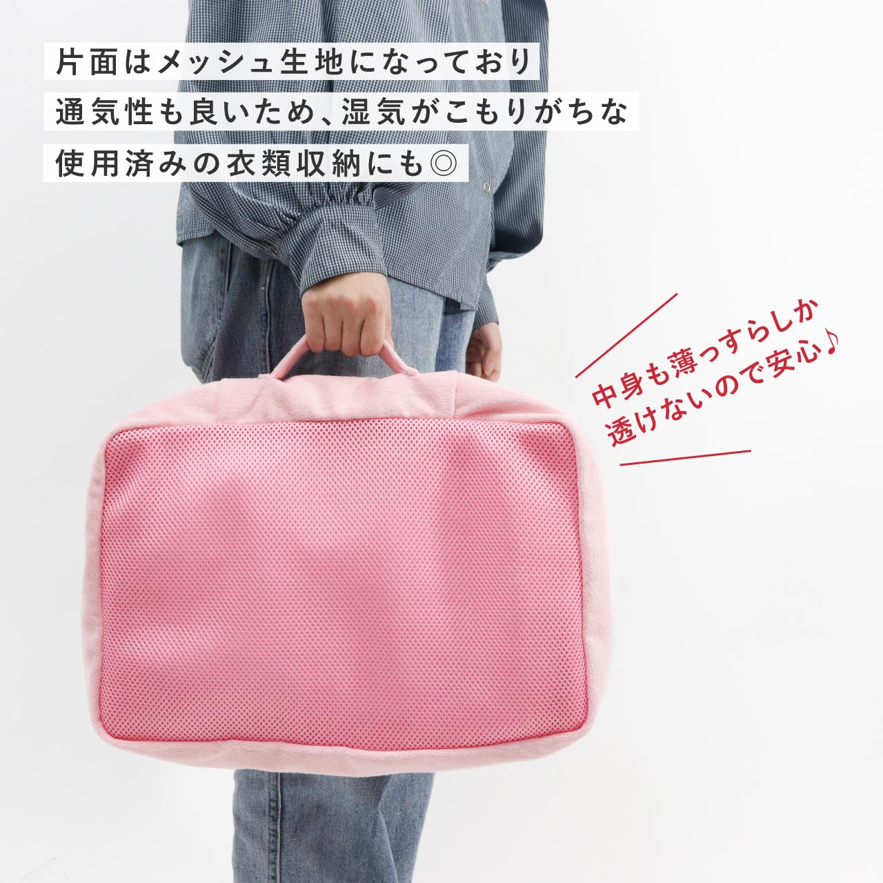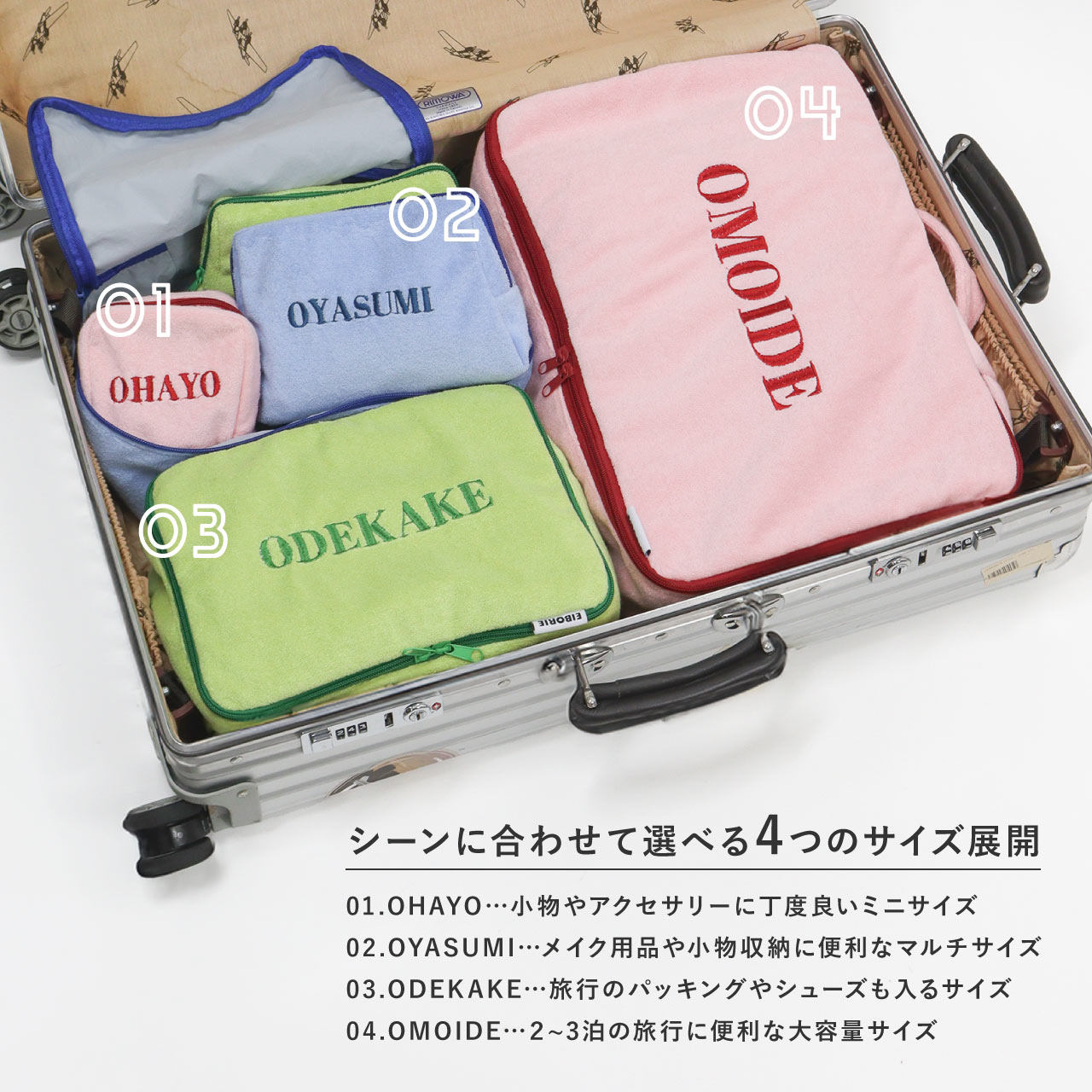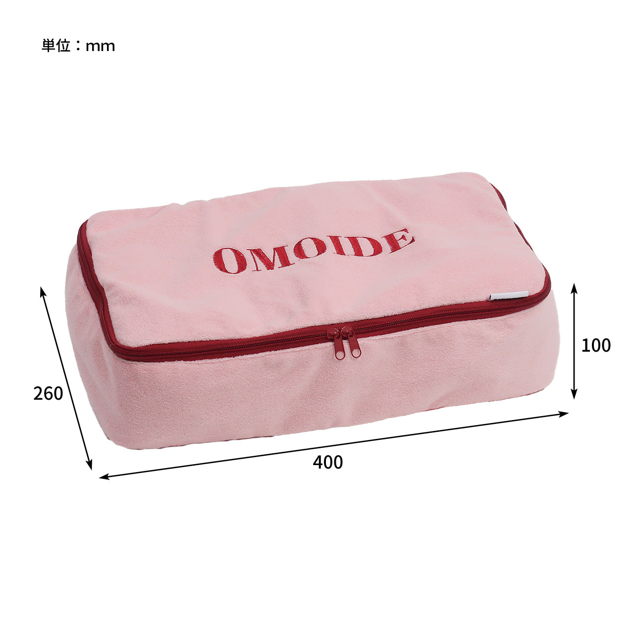 触り心地の良いパイル生地を使用した、トラベル用収納ケース。ポーチの表面に刺繍された"OMOIDE"の文字が目を引く、シンプルながらも遊び心を感じるデザイン。スーツケース、キャリーケースにすっぽり収まるマチの深い四角い形に、持ち出しやすいハンドルも付いています。ファスナーも大きく開いて中が見やすく、ダブルファスナーなので開閉もスピーディーに行えます。片面はメッシュ生地になっており通気性もよく、湿気がこもりやすい使用済みの衣類収納にも安心です。丸洗いも可能なので、いつでも清潔に保てて衛生的。(※手洗いをおすすめしますが、洗濯機をご使用の際は、洗濯ネットに入れて「弱モード」等で洗濯してください。)Lサイズはトラベル用の収納としてはもちろん、ジムやサウナバッグとして日常使いにもおすすめです。同シリーズは小物収納からパッキングまで揃えることができるサイズ展開です。