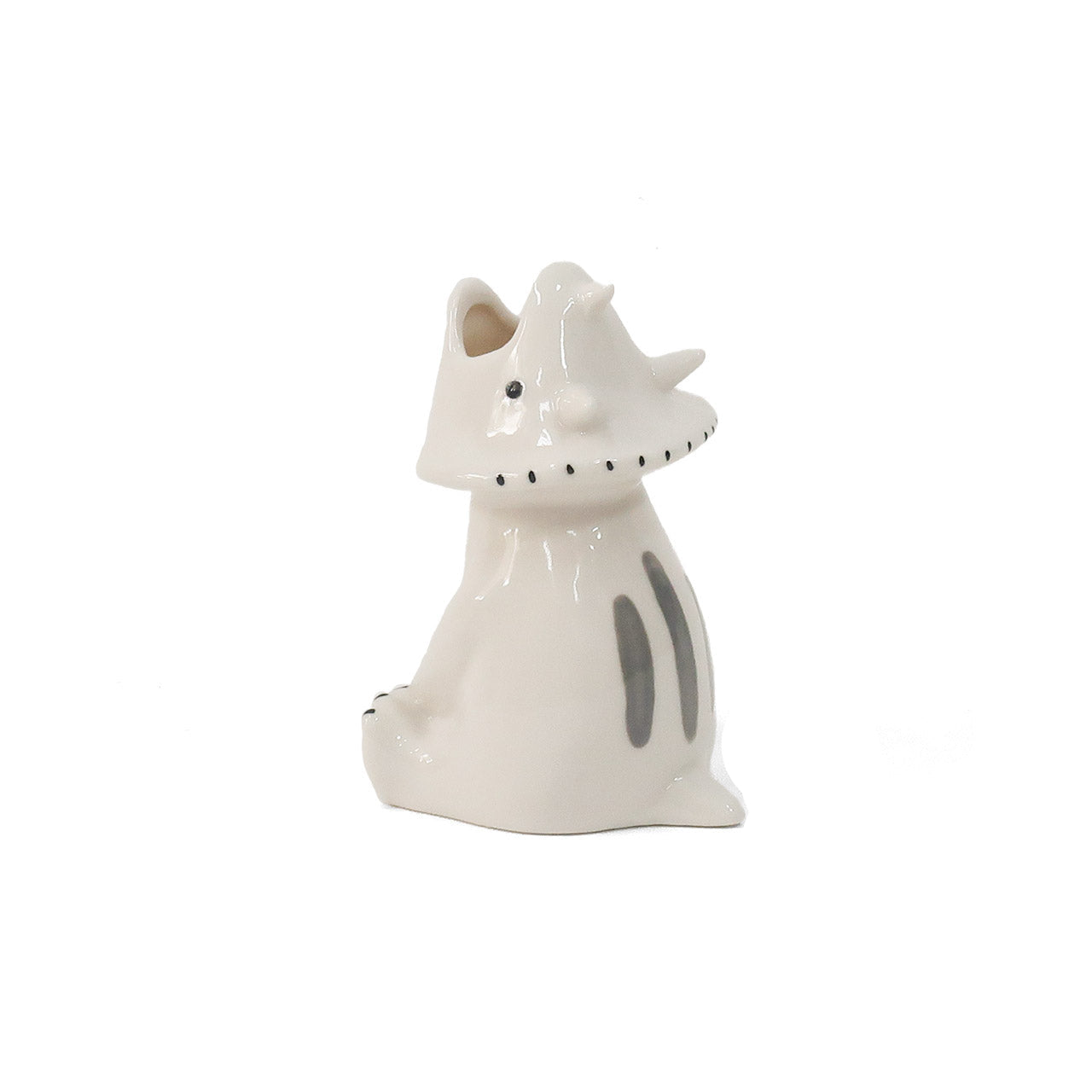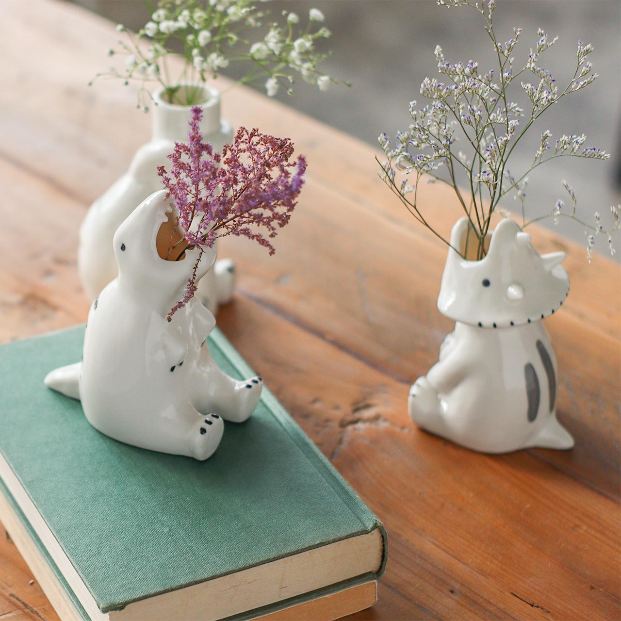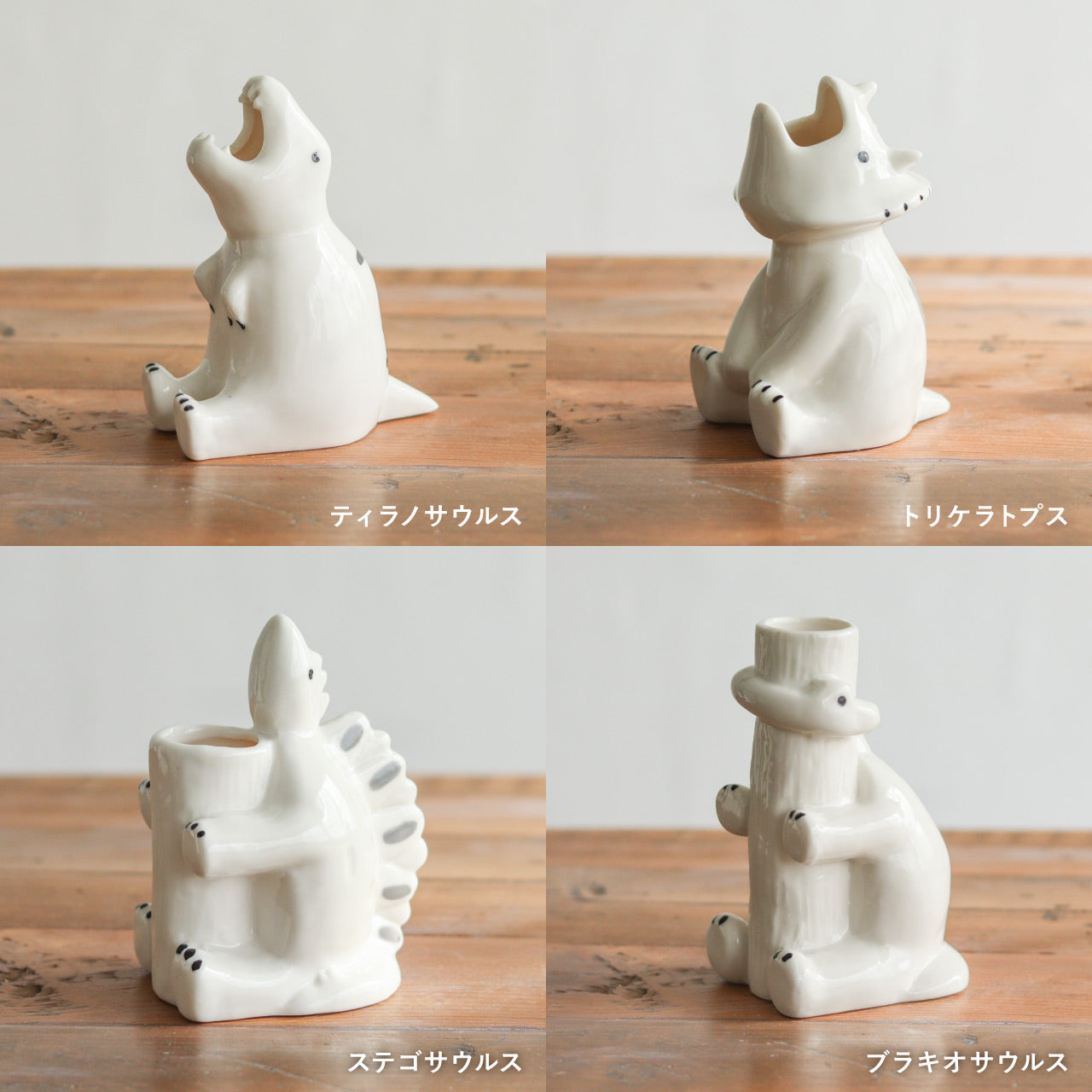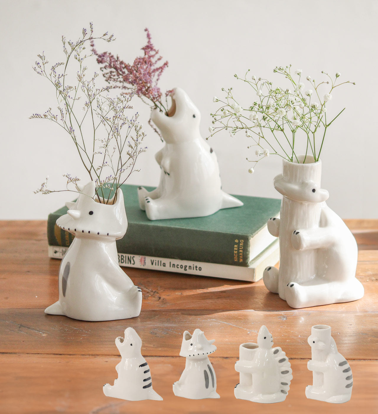 恐竜をモチーフにした磁器製のフラワーベース。白い磁器で出来たぽってりとした丸い体に、黒とグレーの釉薬を使いハンドメイドで恐竜の表情を仕上げました。玄関やリビングなどのちょっとしたスペースに飾りやすいサイズ感。小さな草花やドライフラワーを挿して飾るのはもちろん、ペン立てや歯ブラシスタンドとして使ったり、そのままオブジェとして飾るのだけでも十分素敵なアイテムです。底面には「Sceneryvase」の印字が入っています。恐竜達のちょこんと座った様子がかわいらしく、種類違いで並べたくなります。日々の暮らしに癒しをプラスしてくれる かわいいフラワーベースです。