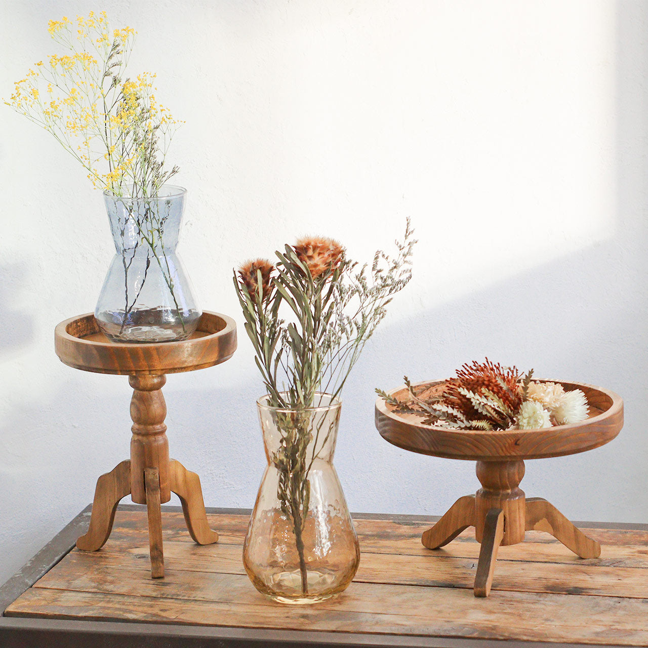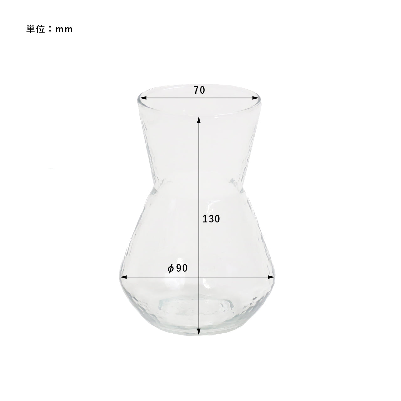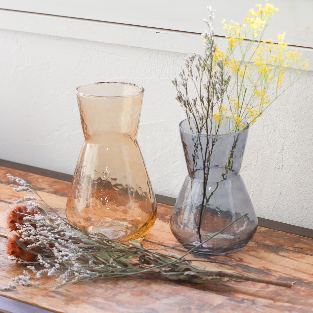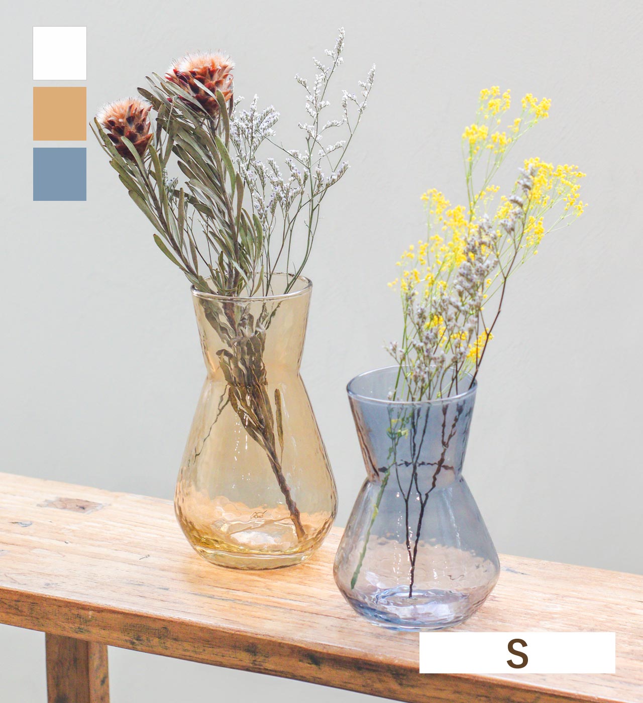 ガラス表面に入った凹凸のテクスチャーが特徴のフラワーベース。シンプルでありながら、どこか特別感を漂わせるフォルム。凹凸のあるガラスが光を受けてきらめくたび、花瓶そのものが空間に華やかさをもたらします。1点1点異なるガラス表面の凹凸も、ハンドメイドならではの風合いとしてお楽しみください。カラーはベーシックなクリアと、シックなカラーのアンバー、ブルーグレーの全3色。サイズはSとLの2種類。Sサイズは小さな草花を飾るのに丁度良い大きさ。玄関やベッドサイドなど小さなスペースにも飾りやすいサイズ感です。同じサイズで並べたり、2サイズ組み合わせてお使いいただくのも統一感が出ておすすめです。