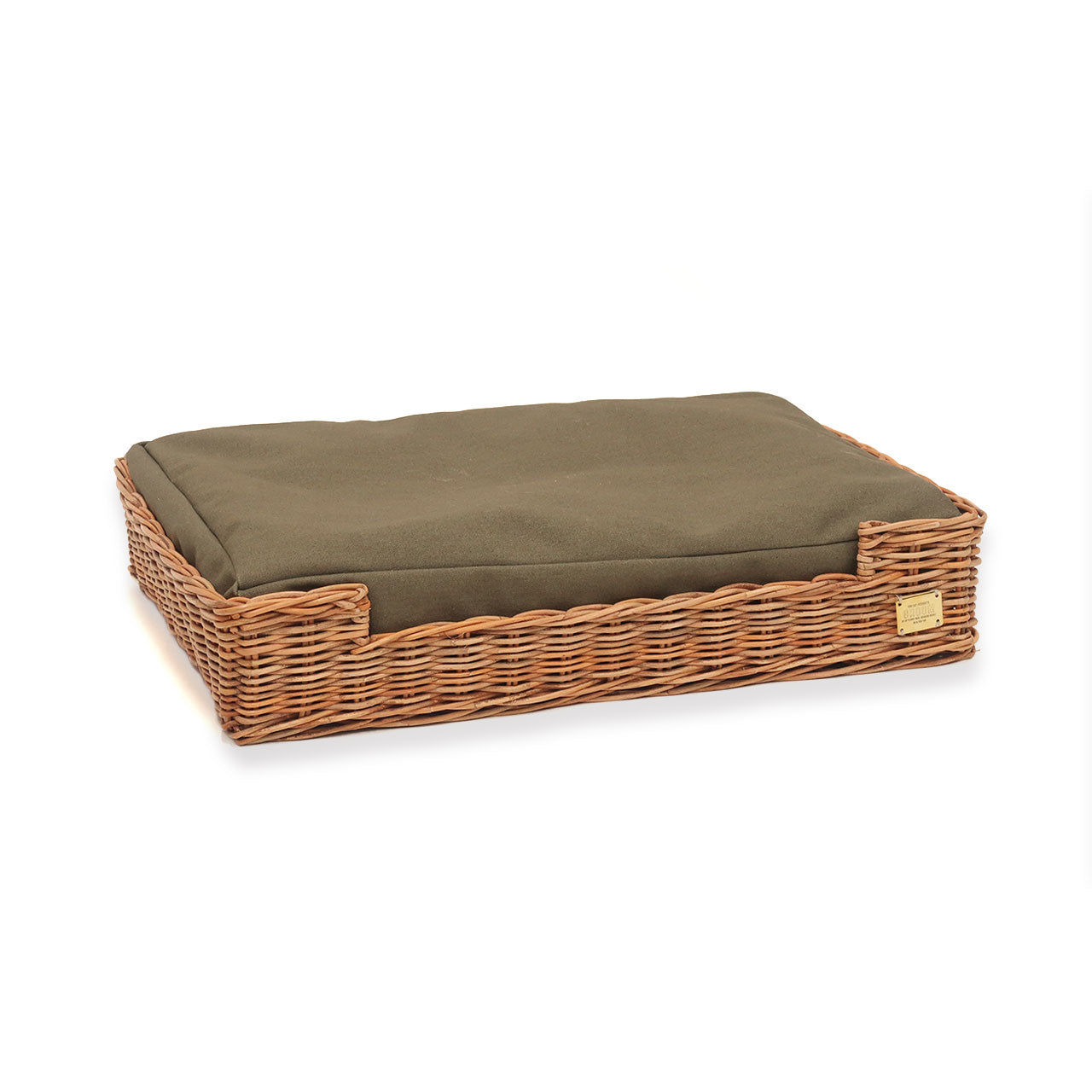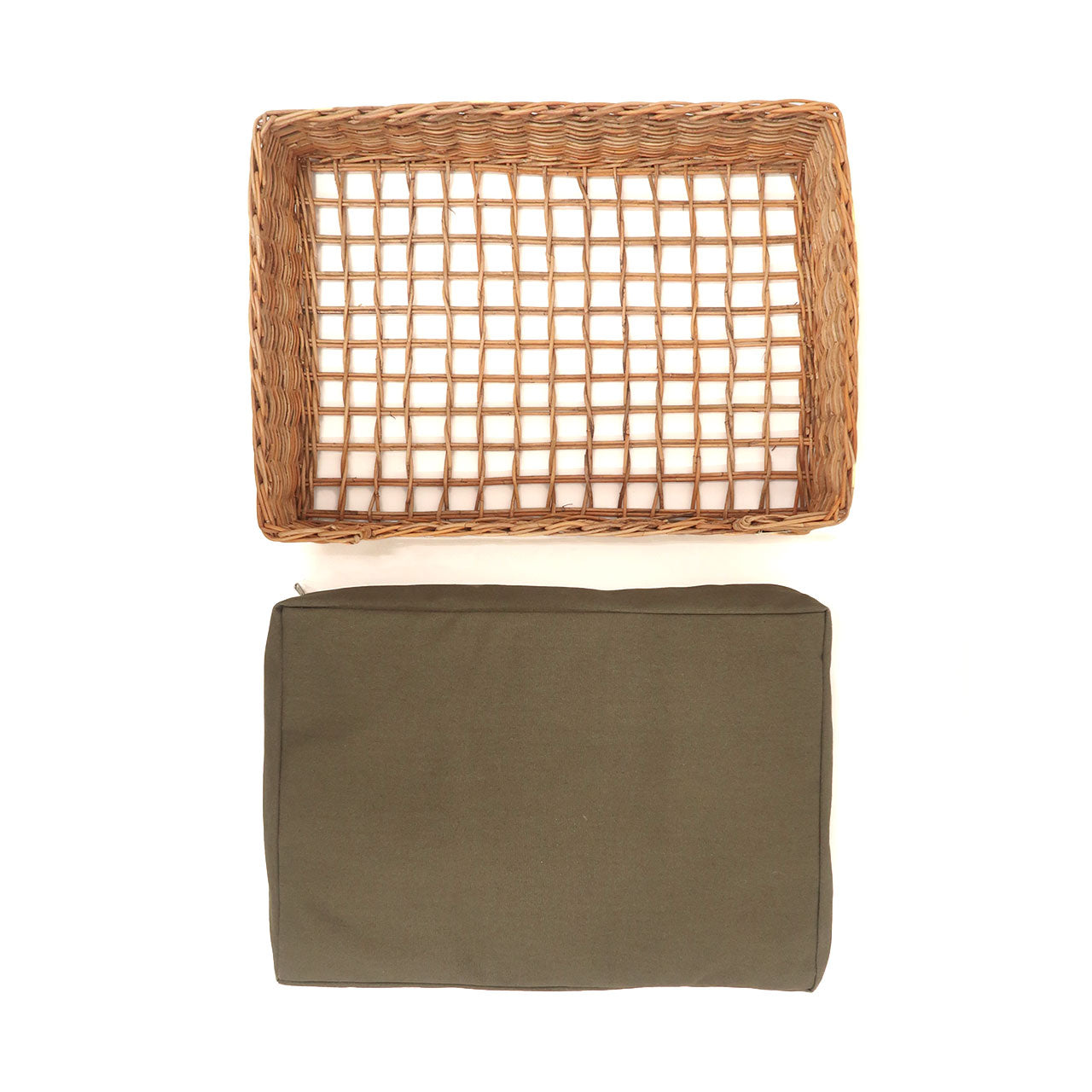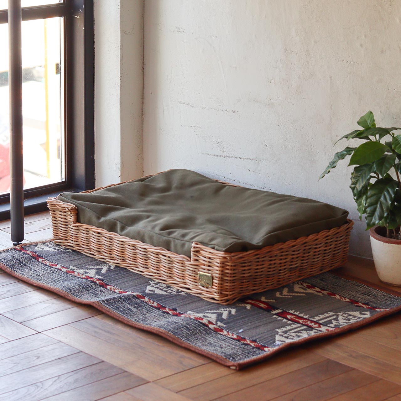 皮付きラタンを使って編まれたハンドメイドのねこベッド。表皮をそのまま残した皮付きラタンで編んだねこベッドです。1点1点職人が手編みで仕上げており、天然素材の素朴な風合いがあふれる佇まい。厚みのあるクッションはずれないように底で固定できる仕様になっており、猫はもちろん小型犬にもお使いいただけます。クッションカバーは取り外して洗濯可能です。