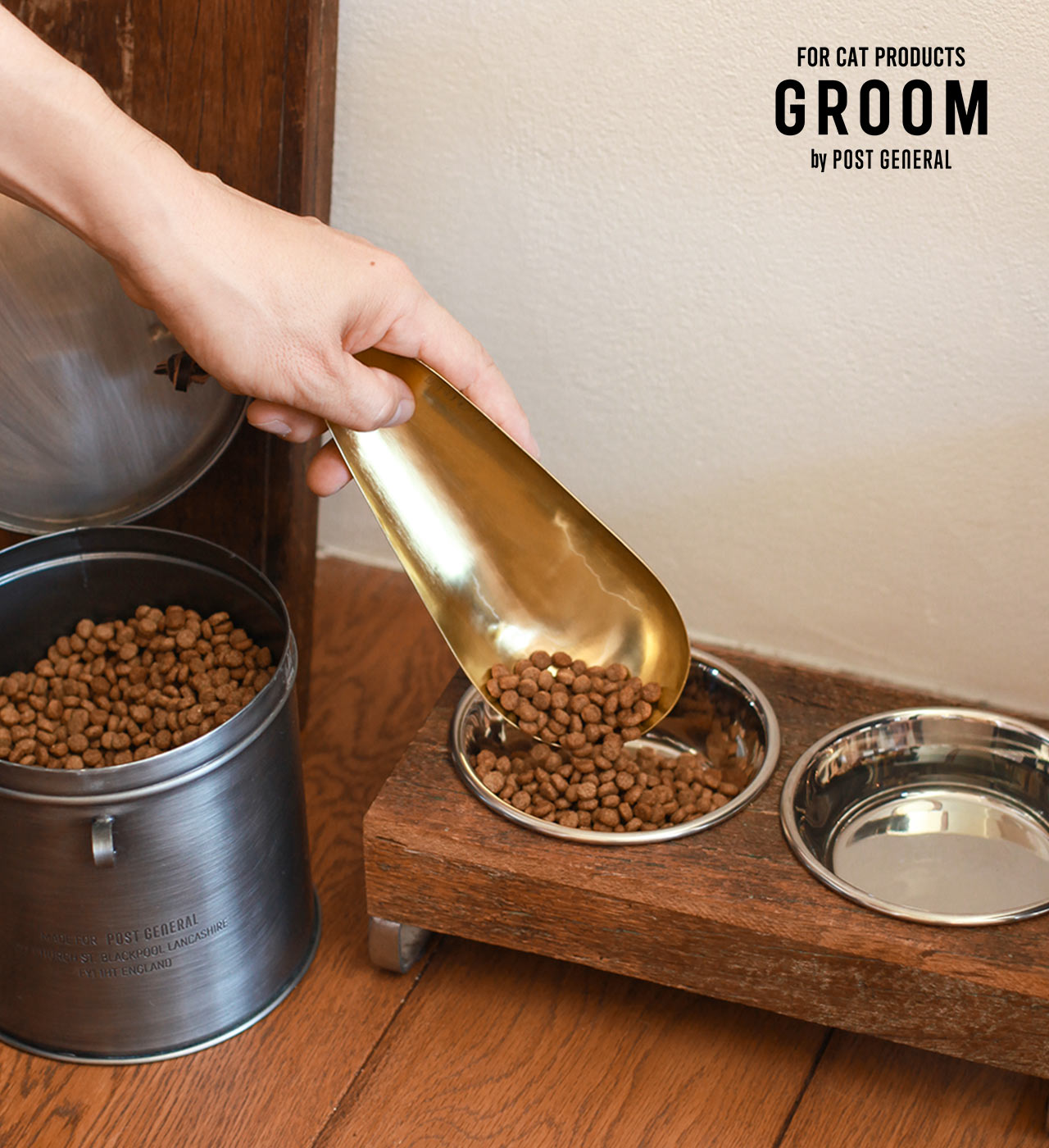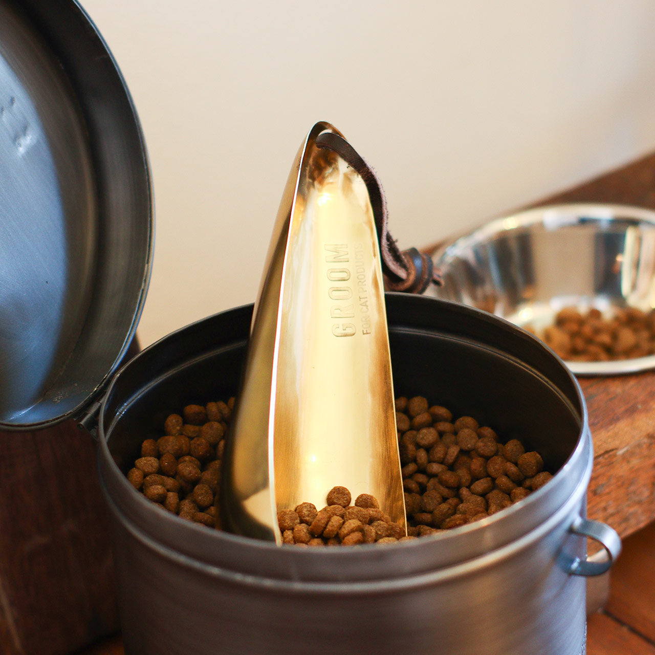 真鍮色に仕上げたアイアン素材のフードスコップ。プラスチック素材が多い猫のフードスコップをあえてインテリア性のあるアイテムに仕上げました。そのまま見える場所に置いていてもインテリアになじむ、シンプルな形状と上品な真鍮風カラーです。付属の革紐で吊り下げることもできます。プレゼントにもぴったりな専用袋付きです。