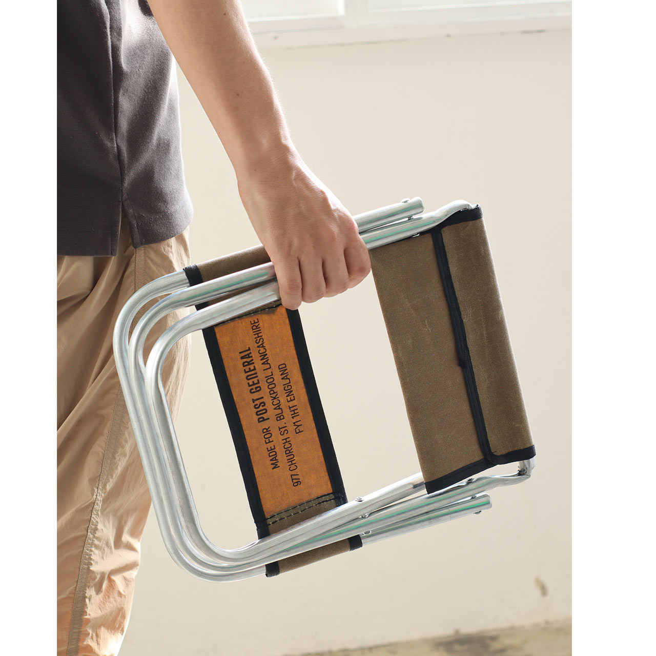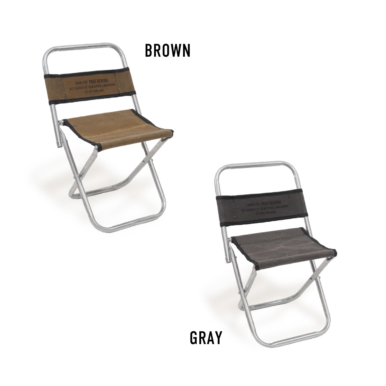 蝋引きのキャンバス生地を使用した小型の折り畳みチェア。亜鉛メッキ塗装を施した無骨なフレームと蝋引きキャンバス生地を組み合わせた折り畳みミニスツールです。「ブラウン」「グレイ」の2カラー。蝋引きキャンバスは折れ曲がった部分の生地表面に白いシワができることで風合いが増していき、使うほどに味わい深い表情をお楽しみいただけます。開き方によって背もたれ有り・無し2パターンの使い方が可能。背もたれ部分のキャンバス生地は上下に動かして好きな位置に調整することができるので、キャンプやBBQなどのアウトドアシーンも快適にお過ごしいただけます。※背もたれに過度に体重をかけるとバランスを崩してしまい、転倒等の恐れがありますのでご注意ください。アウトドアシーンのほか、室内でのインテリアアイテムとしての使い方も。デイバッグにも収まるコンパクトで快適なミニスツールです。
