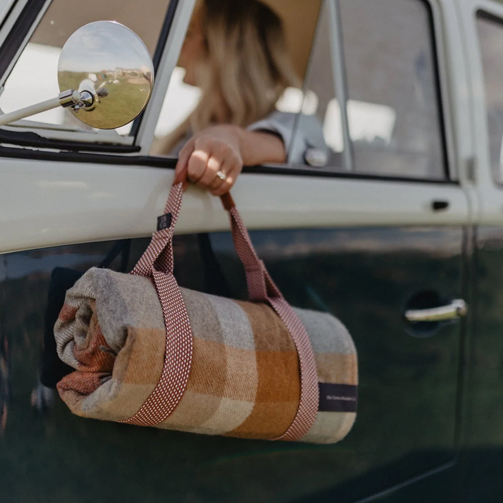 リサイクル素材のポリエステル100%でつくられたピクニックブランケット用のキャリアストラップです。完璧なフィット感と持ち運びやすさを重視して設計しました。バックパックや自転車に固定も可能です。