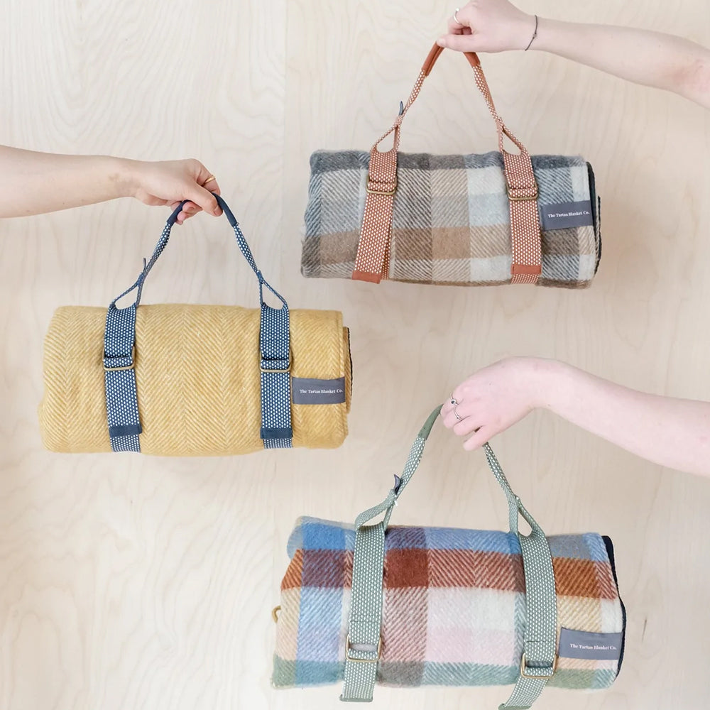 リサイクル素材のポリエステル100%でつくられたピクニックブランケット用のキャリアストラップです。完璧なフィット感と持ち運びやすさを重視して設計しました。バックパックや自転車に固定も可能です。