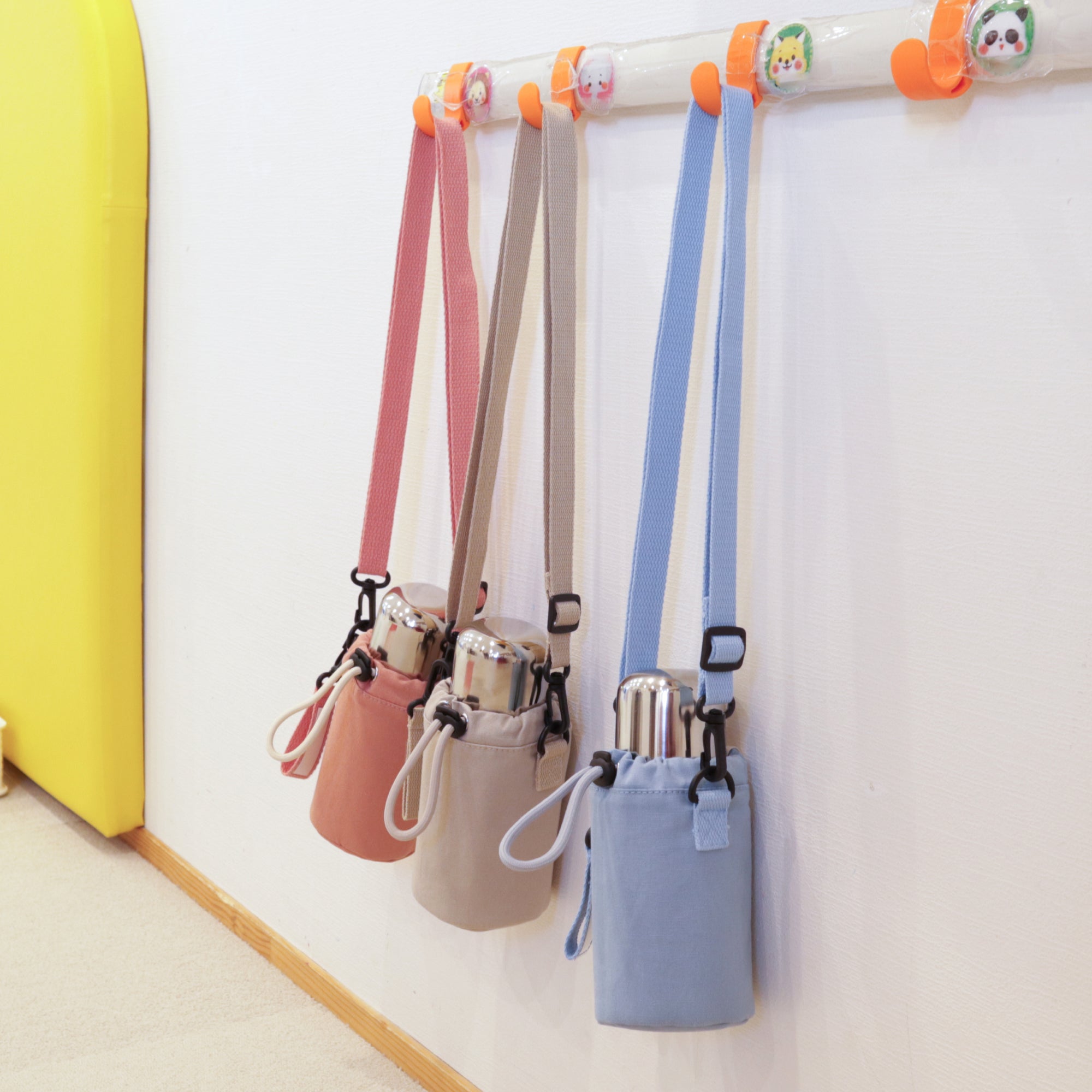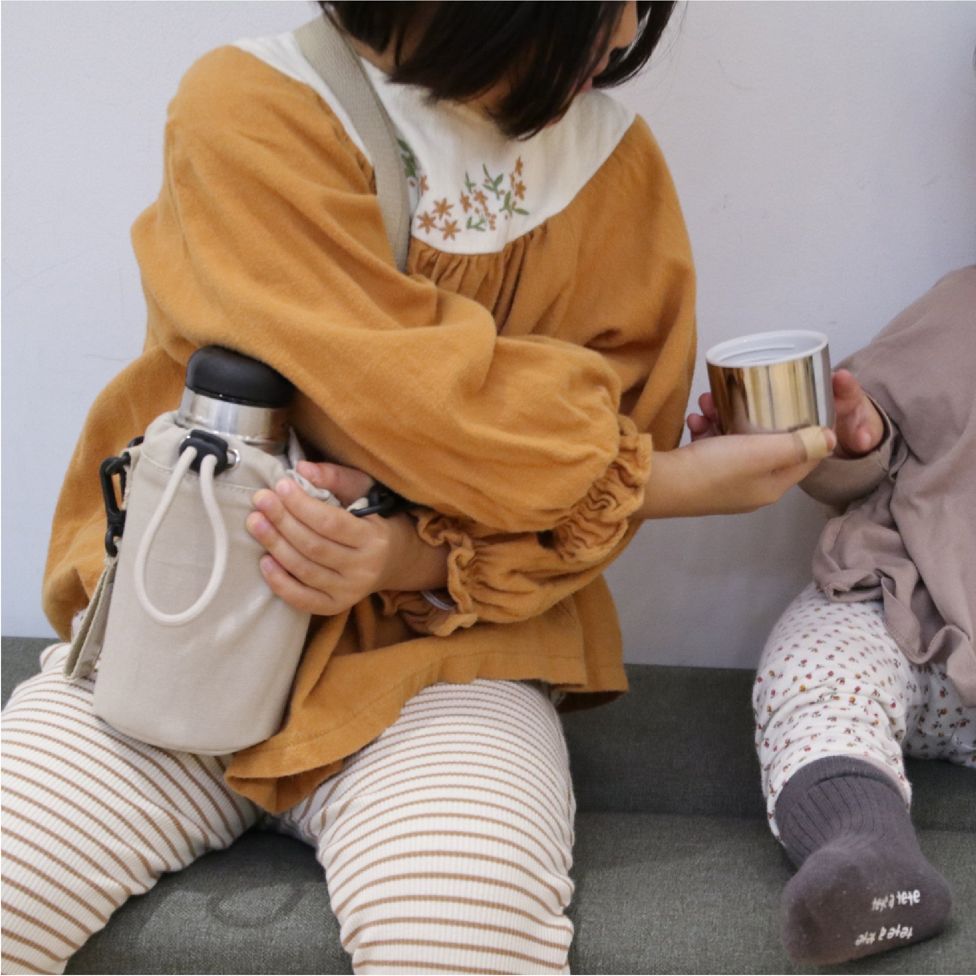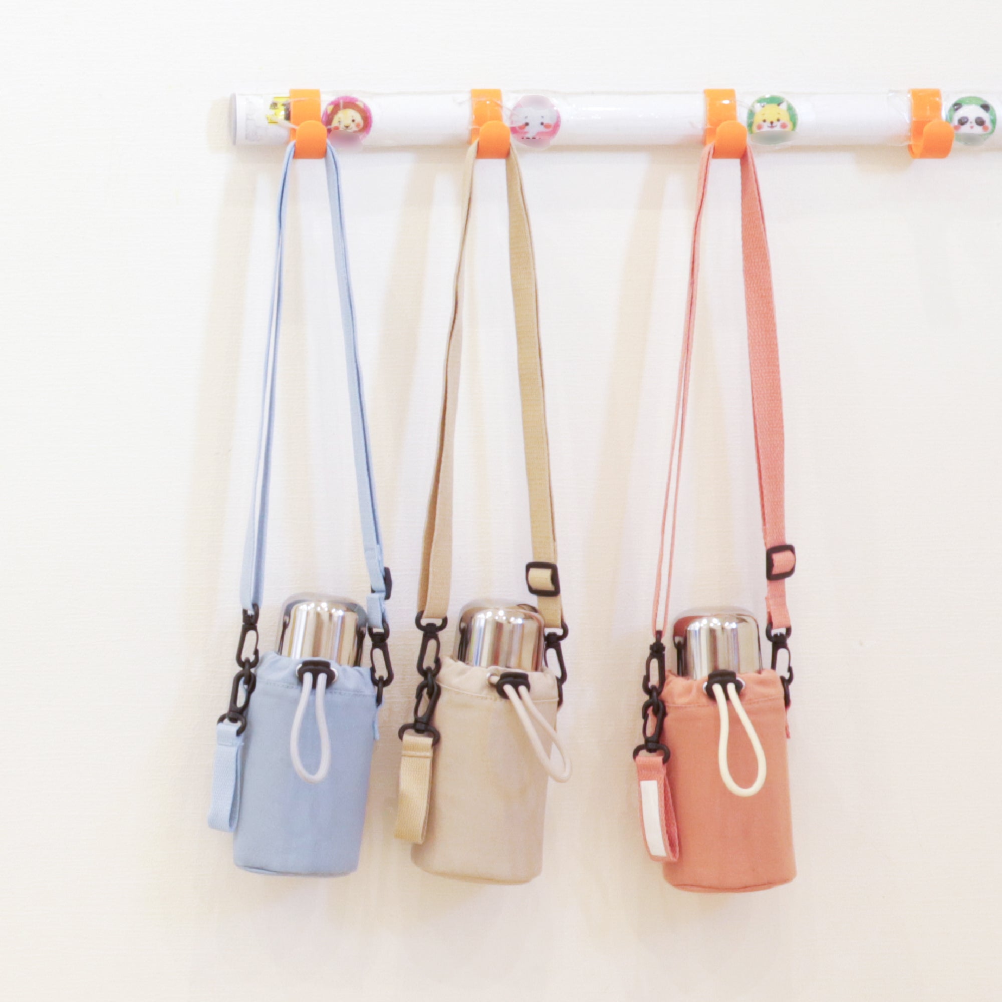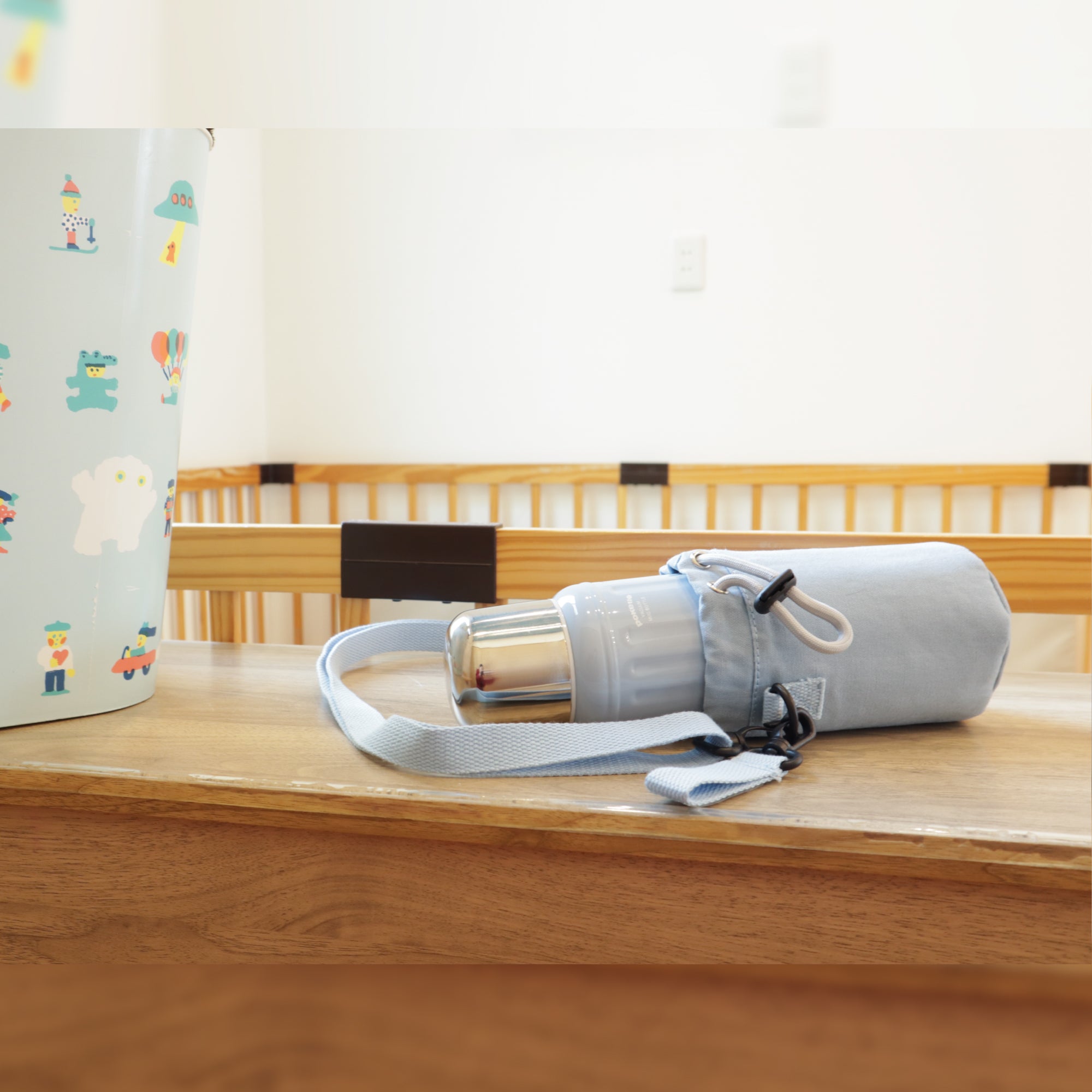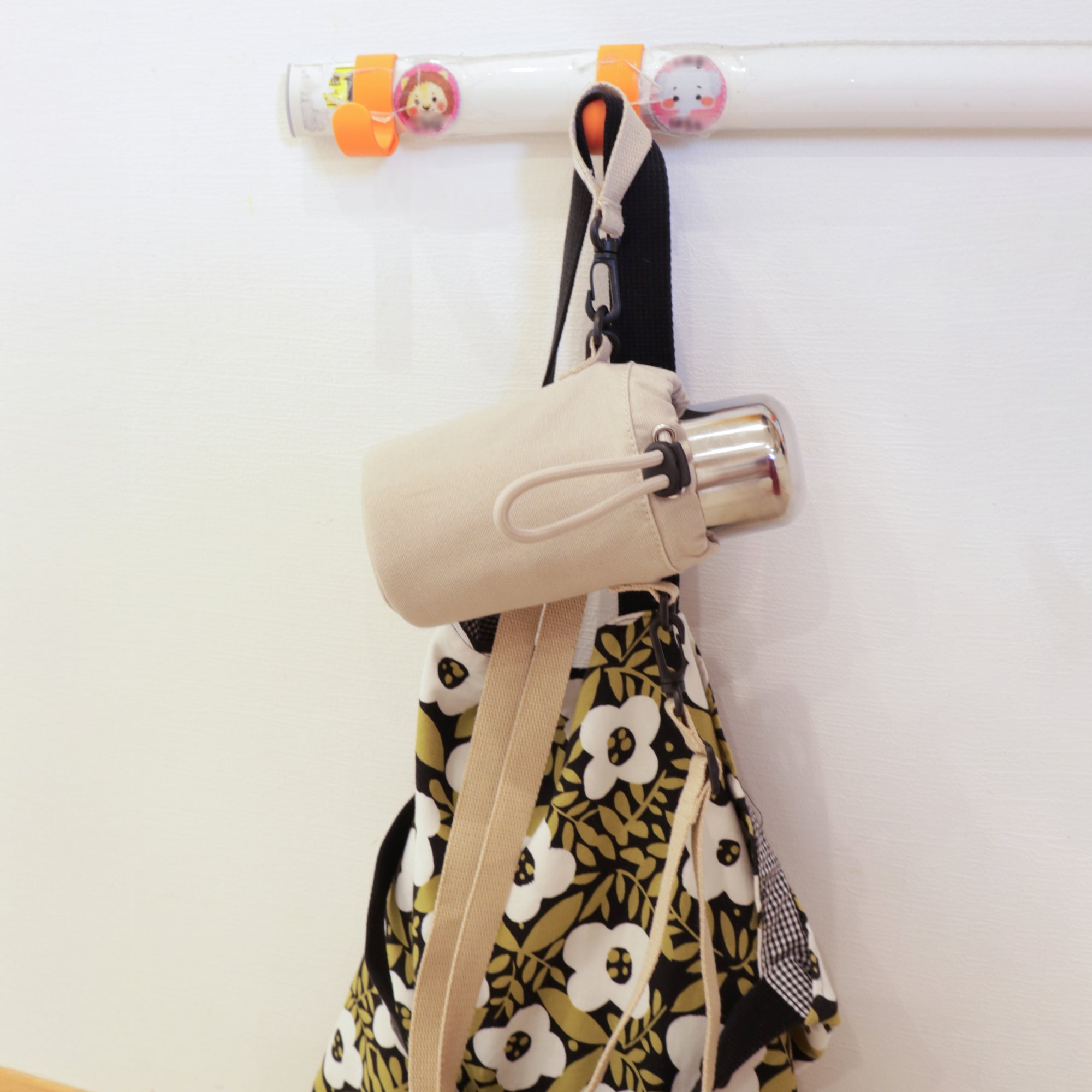 大きなフックにもかけられるネームループつきで、ファブリック感のある生地を使用したやさしいカラーとフォルムが特徴です。耐久性も持たせ、衝撃を緩和し、水筒の破損を防ぎます。カバーを装着したまま、給水可能です。ペットボトルも入れられる仕様で保冷機能もあります。ショルダーは調整可能で、最長126.5cmまで調整できるから、成長期のお子様で安心です。ボトルに合わせてカラーも3色からお選びいただけます。