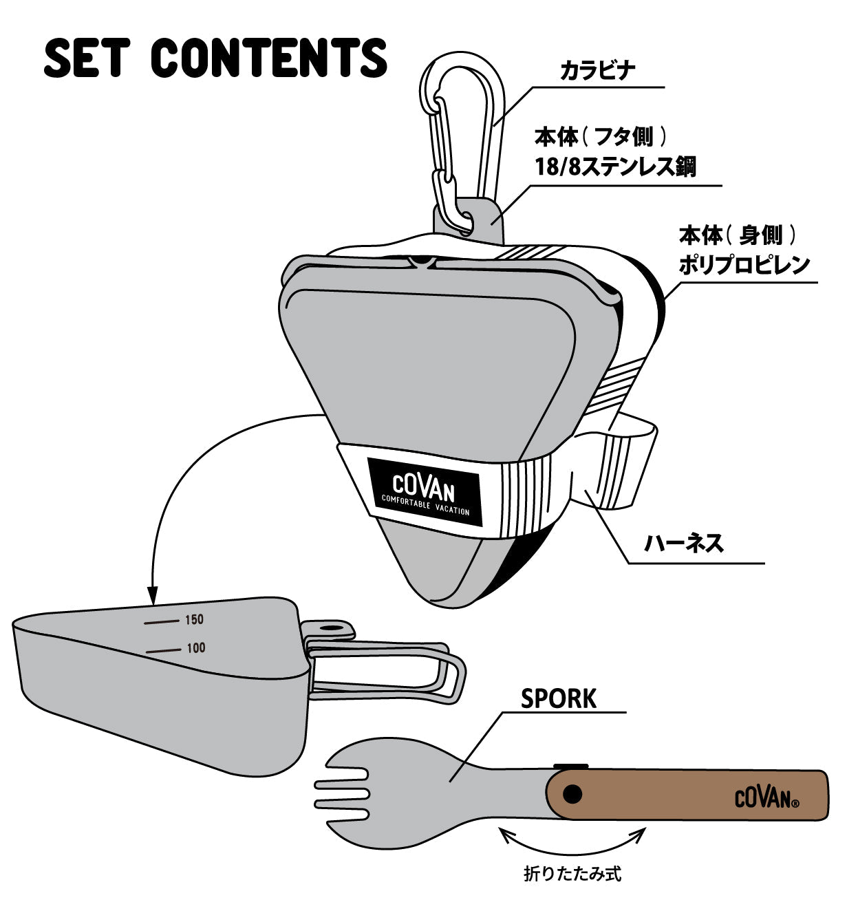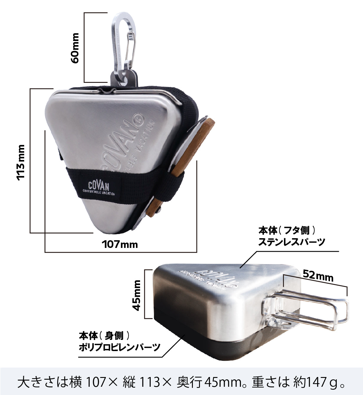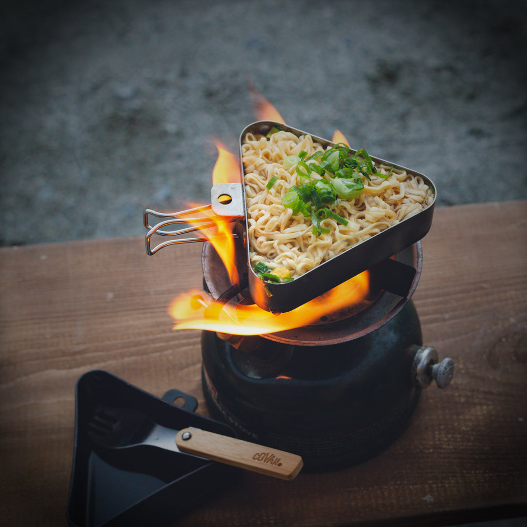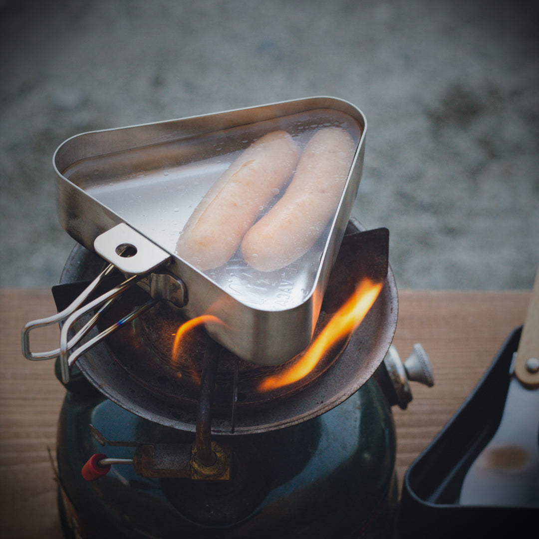 おにぎり1個で、究極のソロ飯完成。深絞りで仕上げたステンレスの質感が硬派なギア。ステンレスパーツはシェラカップ・計量カップになります。直火にかけられるからシングルバーナーがあれば調理も可能。新潟燕三条産ステンレス&天然木のスポークが付いているので