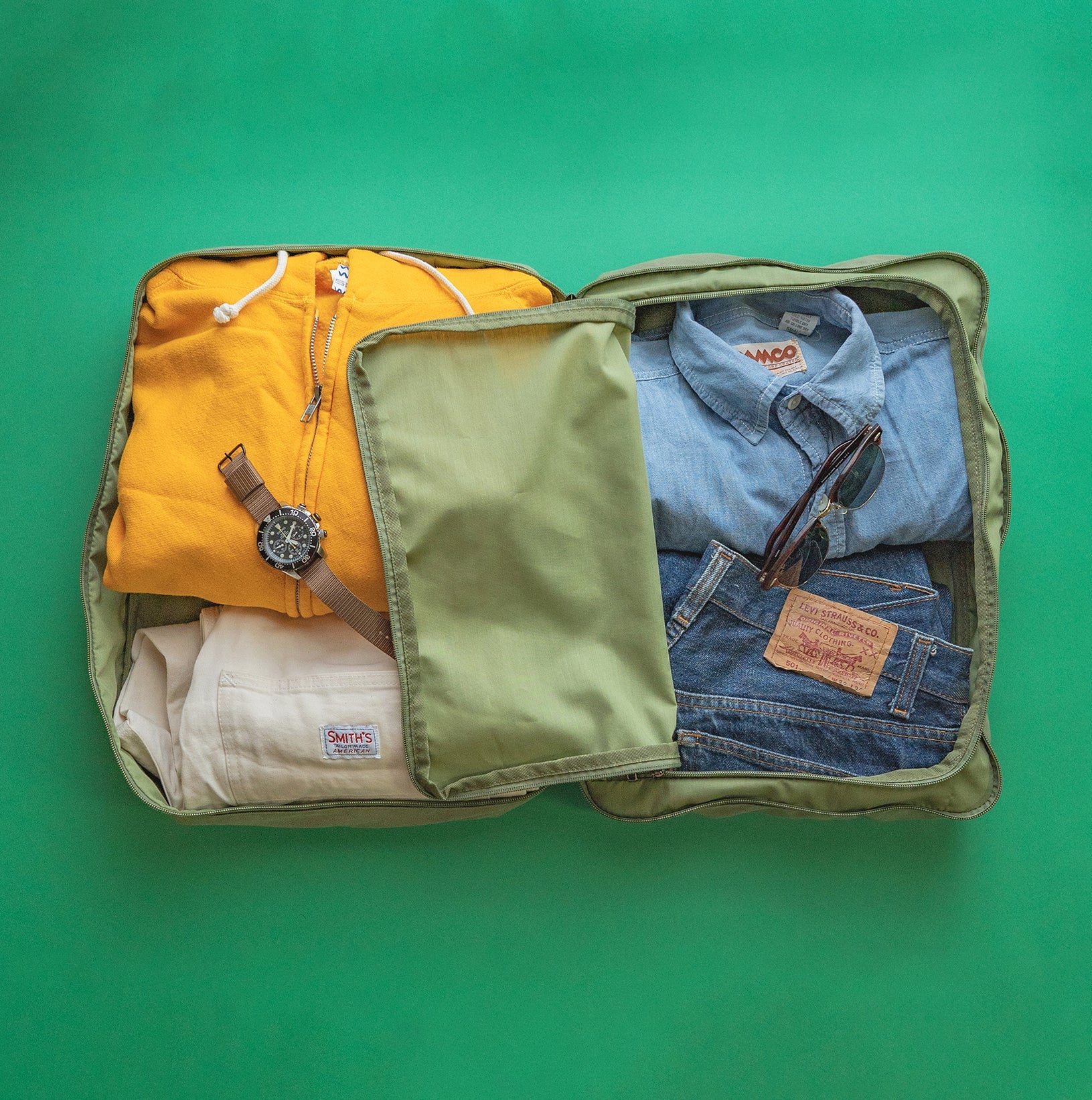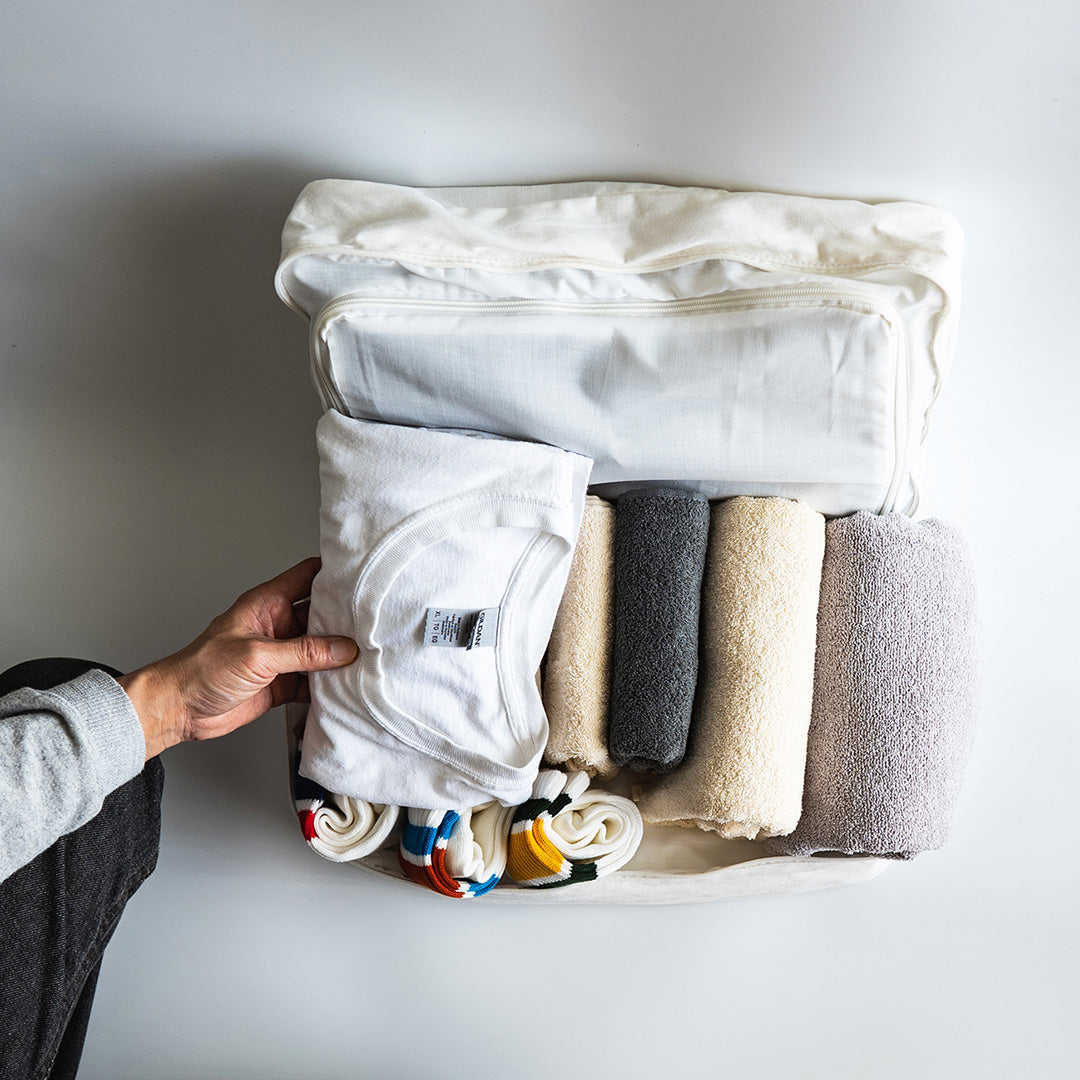 16Lの大型ポーチです。センターにファスナー式の仕切りが付属し、8Lづつに分けて収納可能。衣類を種類別や曜日別に仕分けたり、着用前と着用後のものを分けることができます。ハンドル付きなので、単体での持ち歩きも可能です。