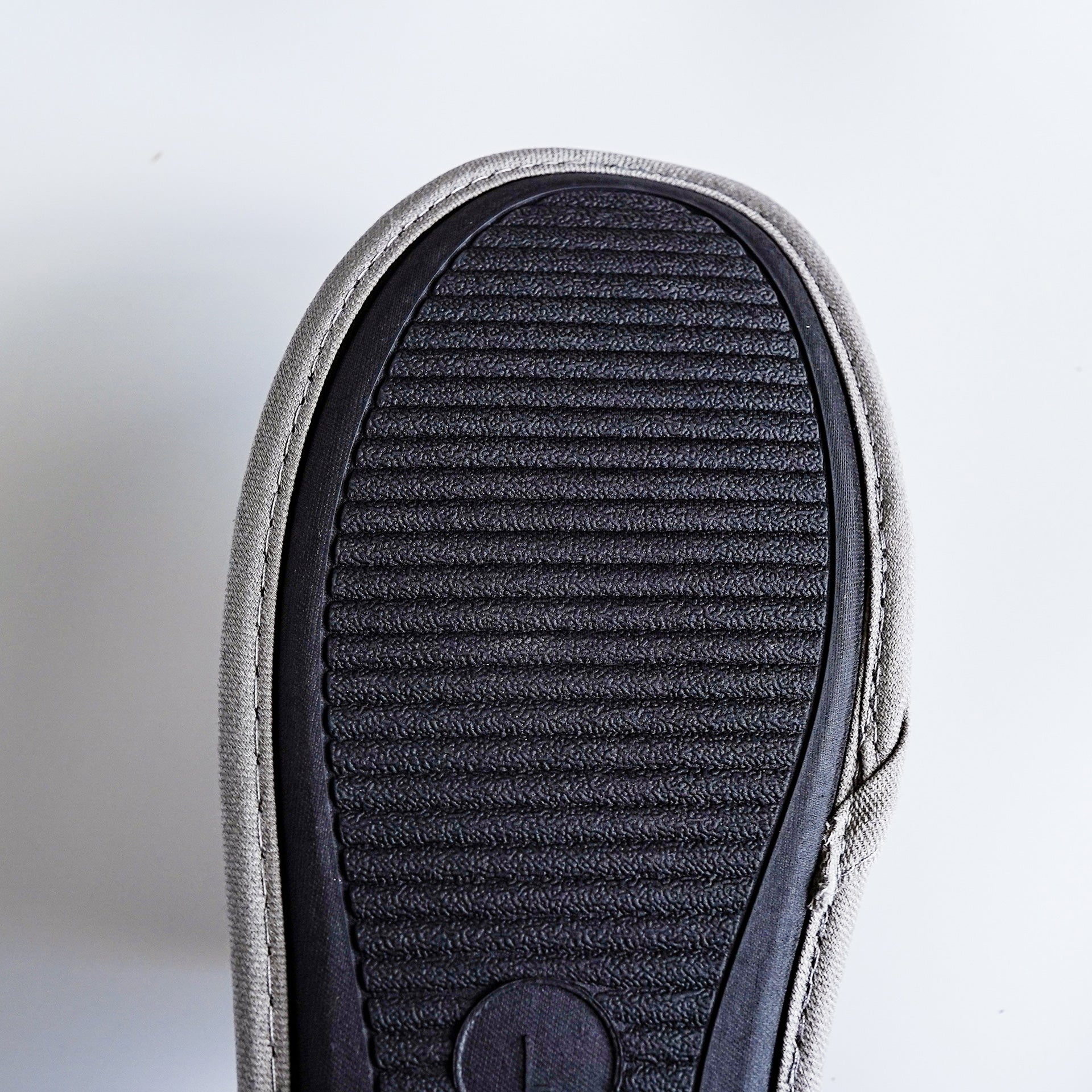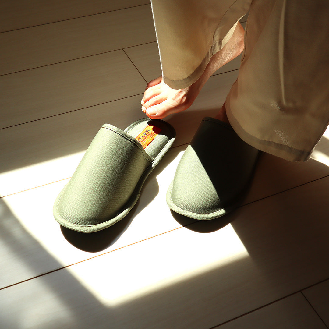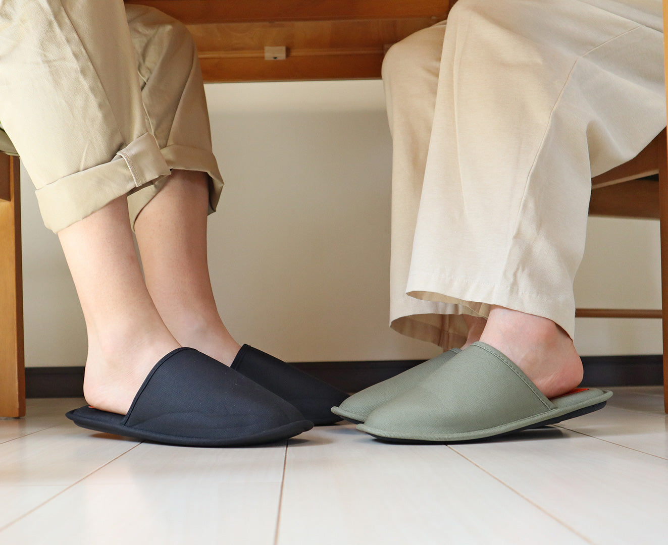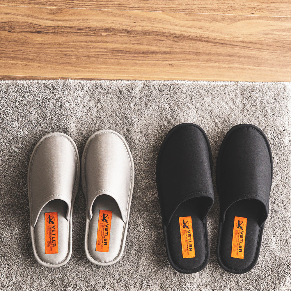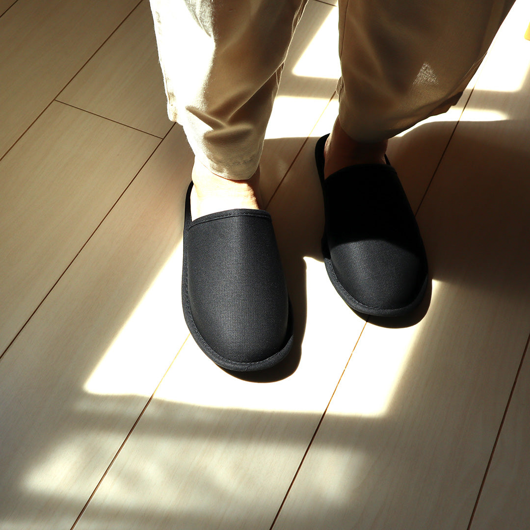 ストレッチモールスキンのシックな生地にオレンジのタグが映えるシンプルなスリッパです。厚みのあるクッションで履き心地は抜群。ソールには一般的なスリッパで多用される合皮よりもタフなTPR樹脂を使用。擦り切れ難く長く使えるのもポイントです。
