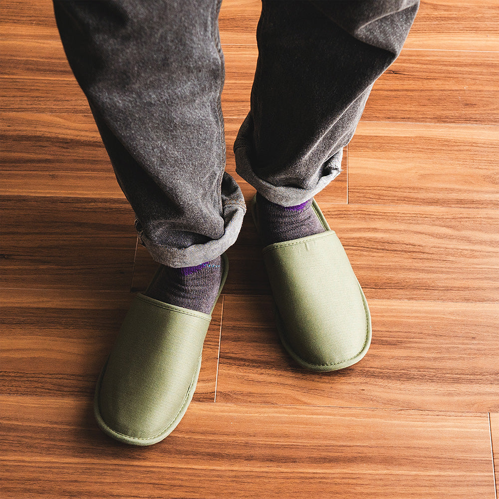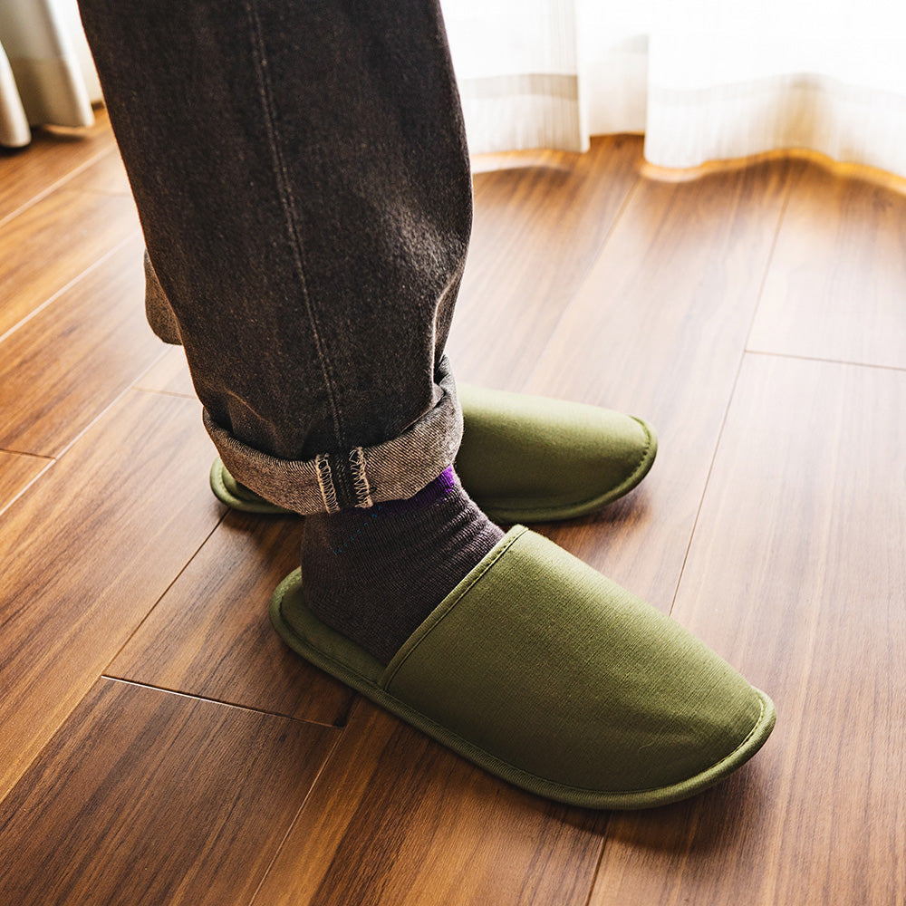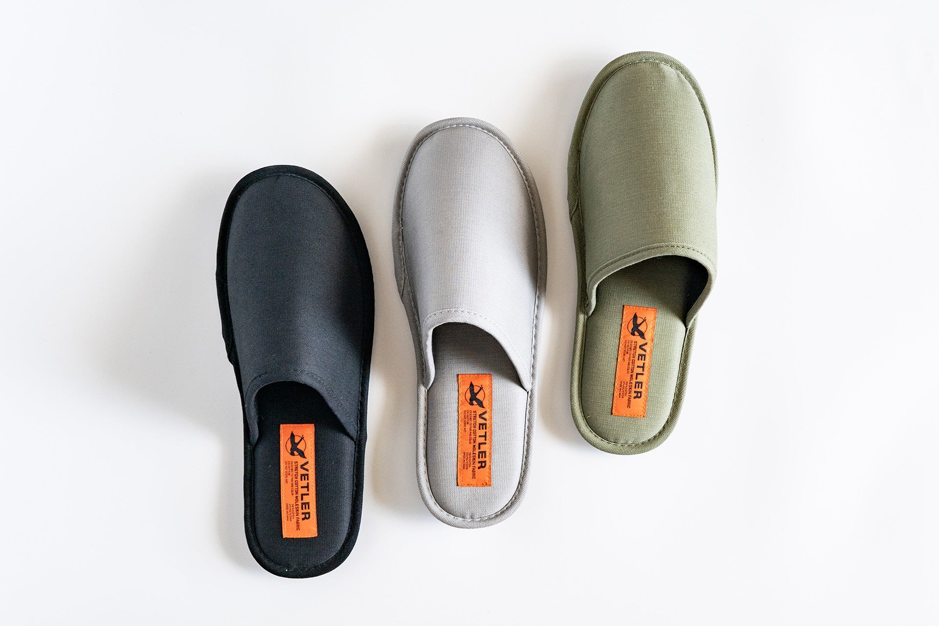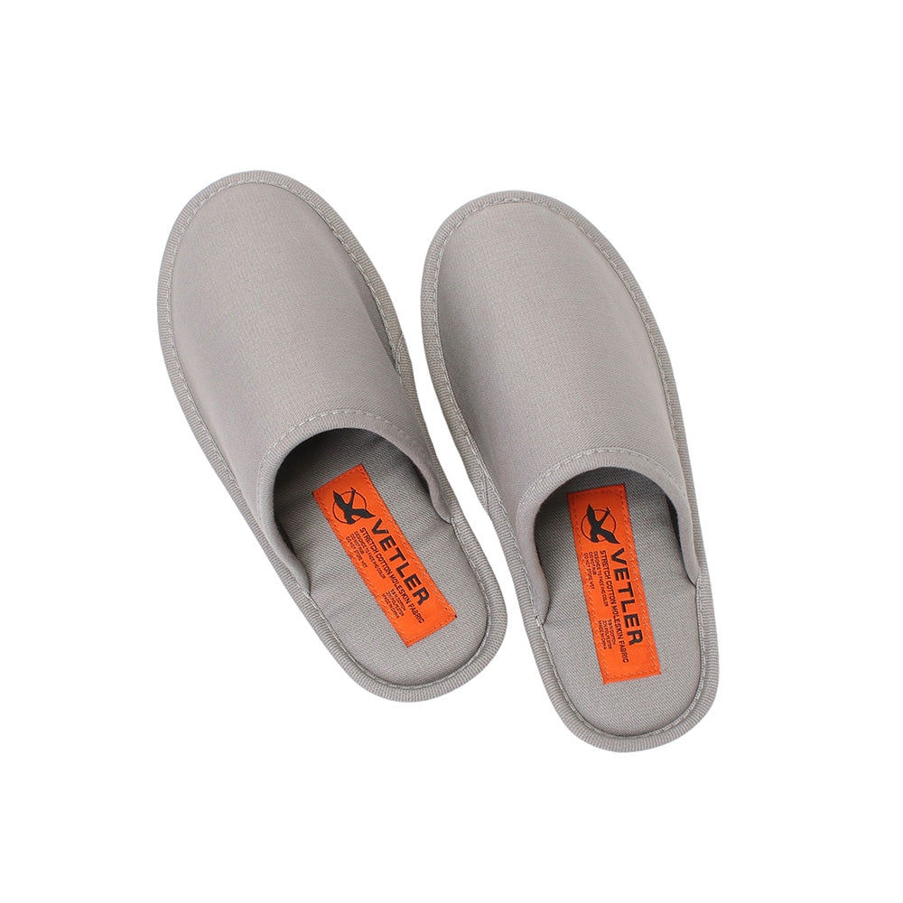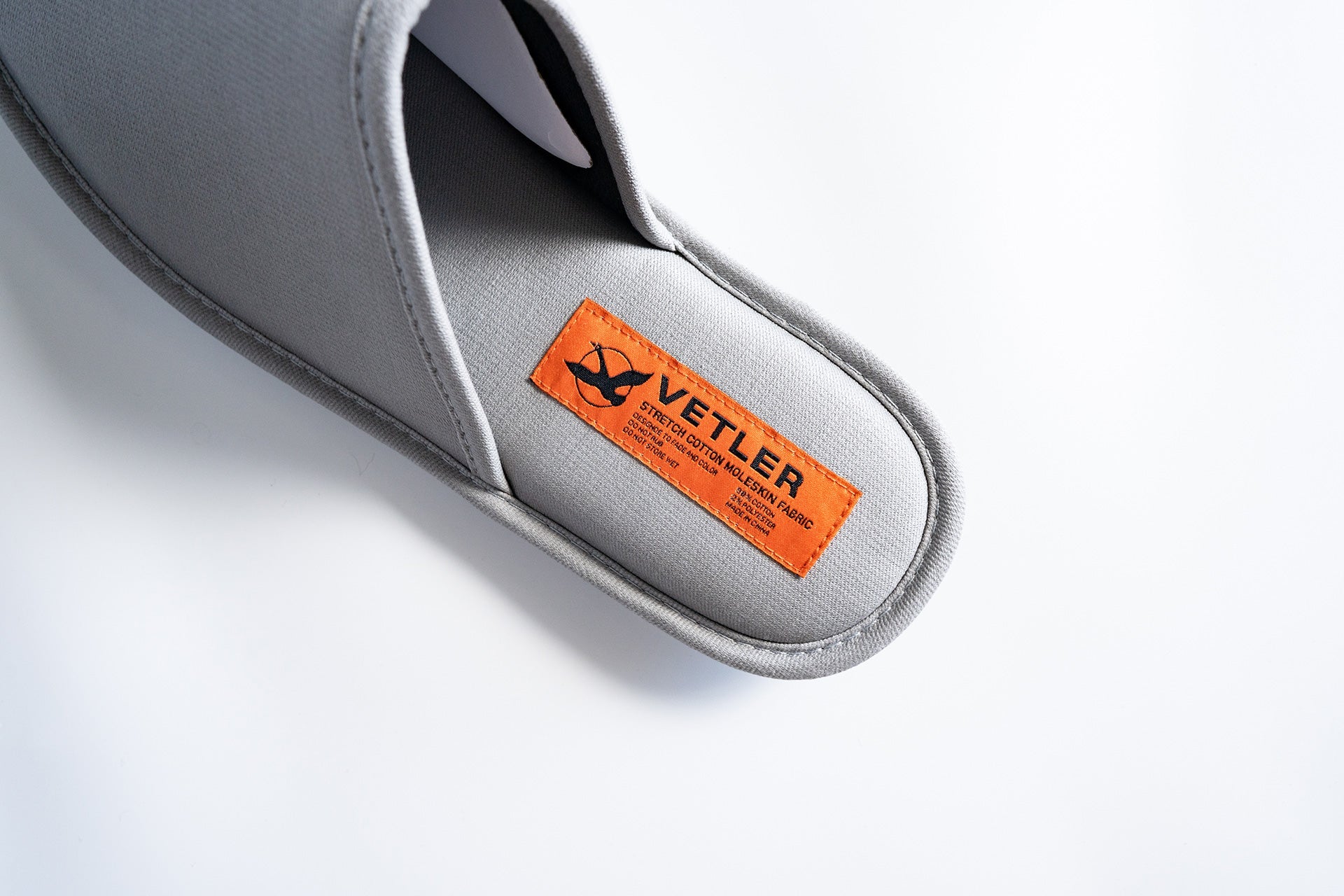 ストレッチモールスキンのシックな生地にオレンジのタグが映えるシンプルなスリッパです。厚みのあるクッションで履き心地は抜群。ソールには一般的なスリッパで多用される合皮よりもタフなTPR樹脂を使用。擦り切れ難く長く使えるのもポイントです。