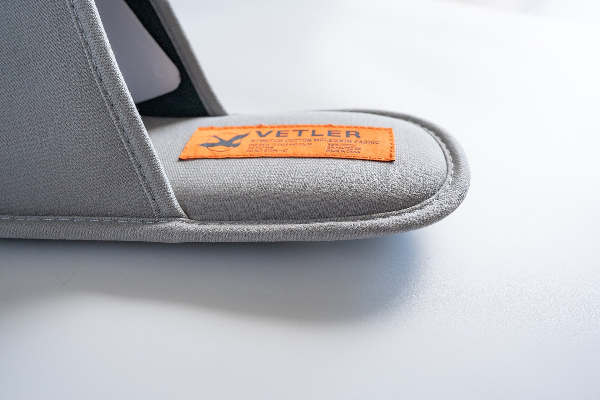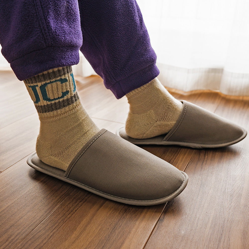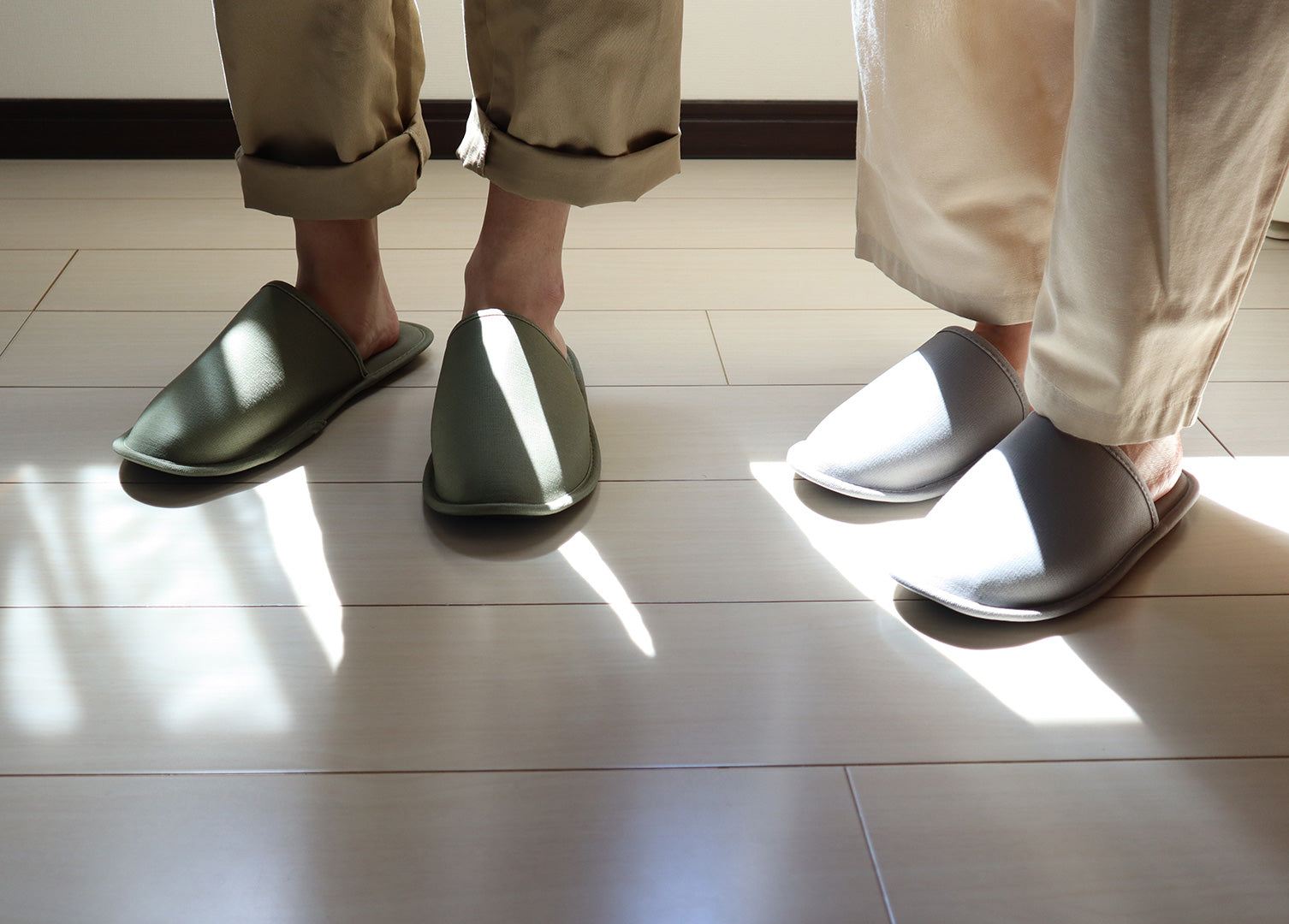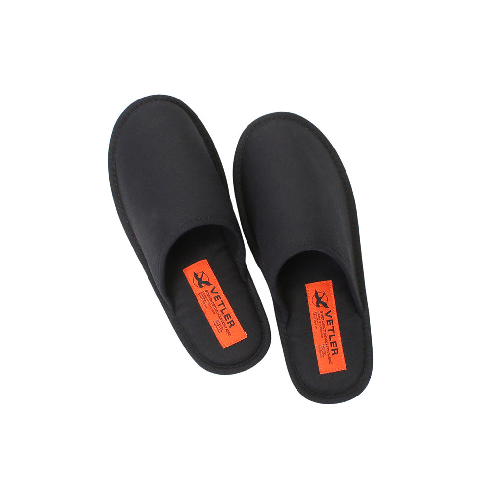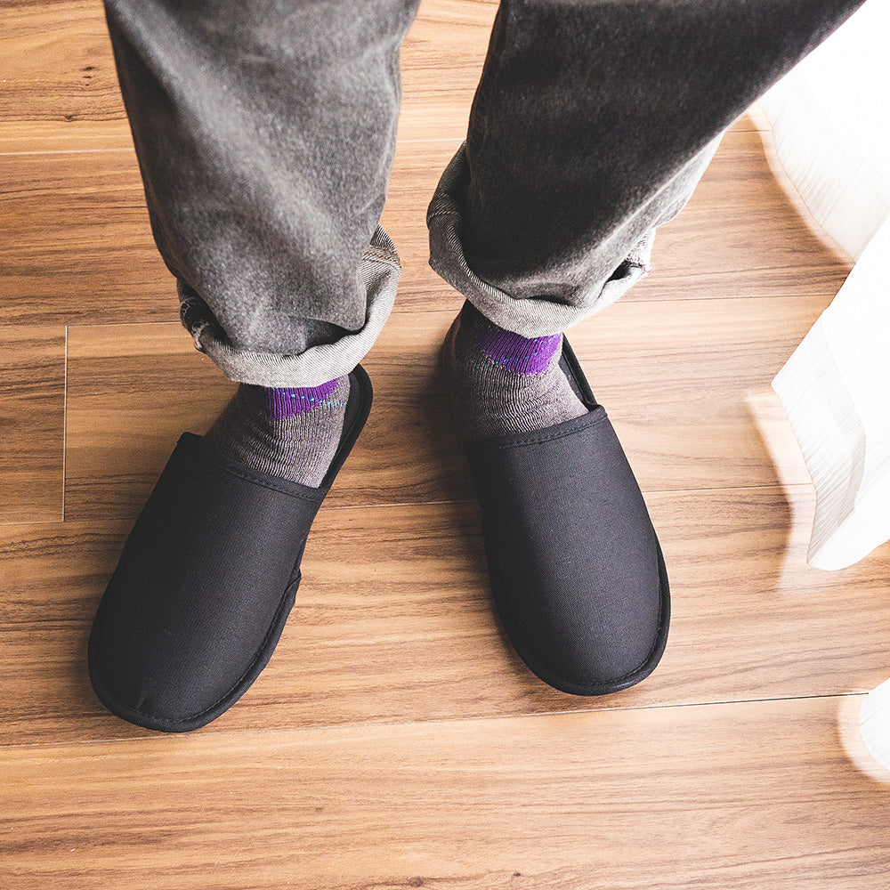 ストレッチモールスキンのシックな生地にオレンジのタグが映えるシンプルなスリッパです。厚みのあるクッションで履き心地は抜群。ソールには一般的なスリッパで多用される合皮よりもタフなTPR樹脂を使用。擦り切れ難く長く使えるのもポイントです。