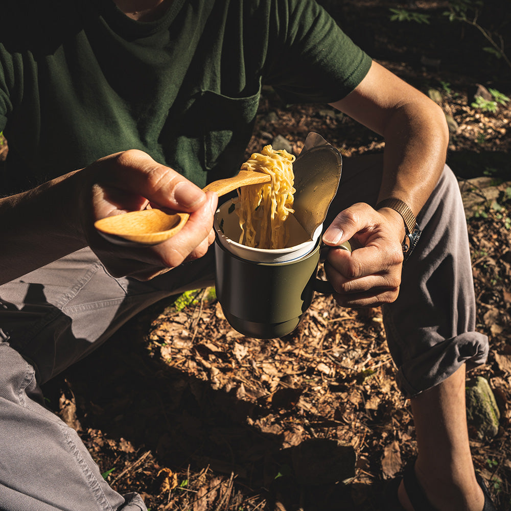 具だくさんなスープにも使えるほどのビックサイズのマグカップです。カップメンをぴったり収納する事ができ、ハンドル付きカップメンホルダーとしても使える優れもの。スタッキングができるので、家族分のマグを持ってキャンプに行くときもかさばりません。