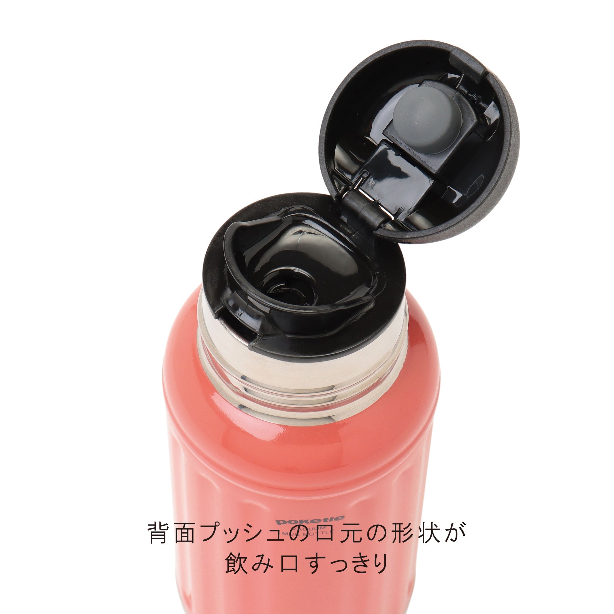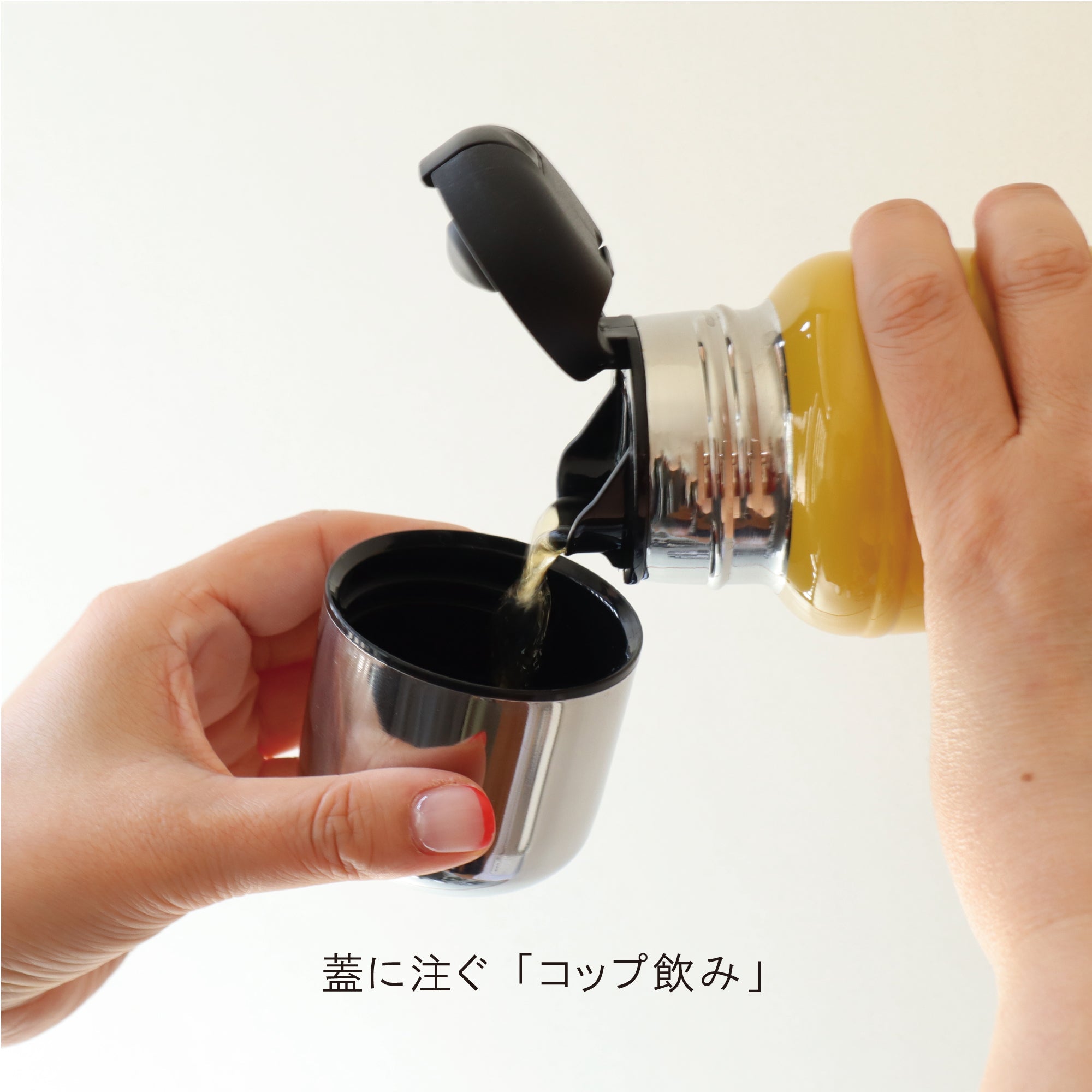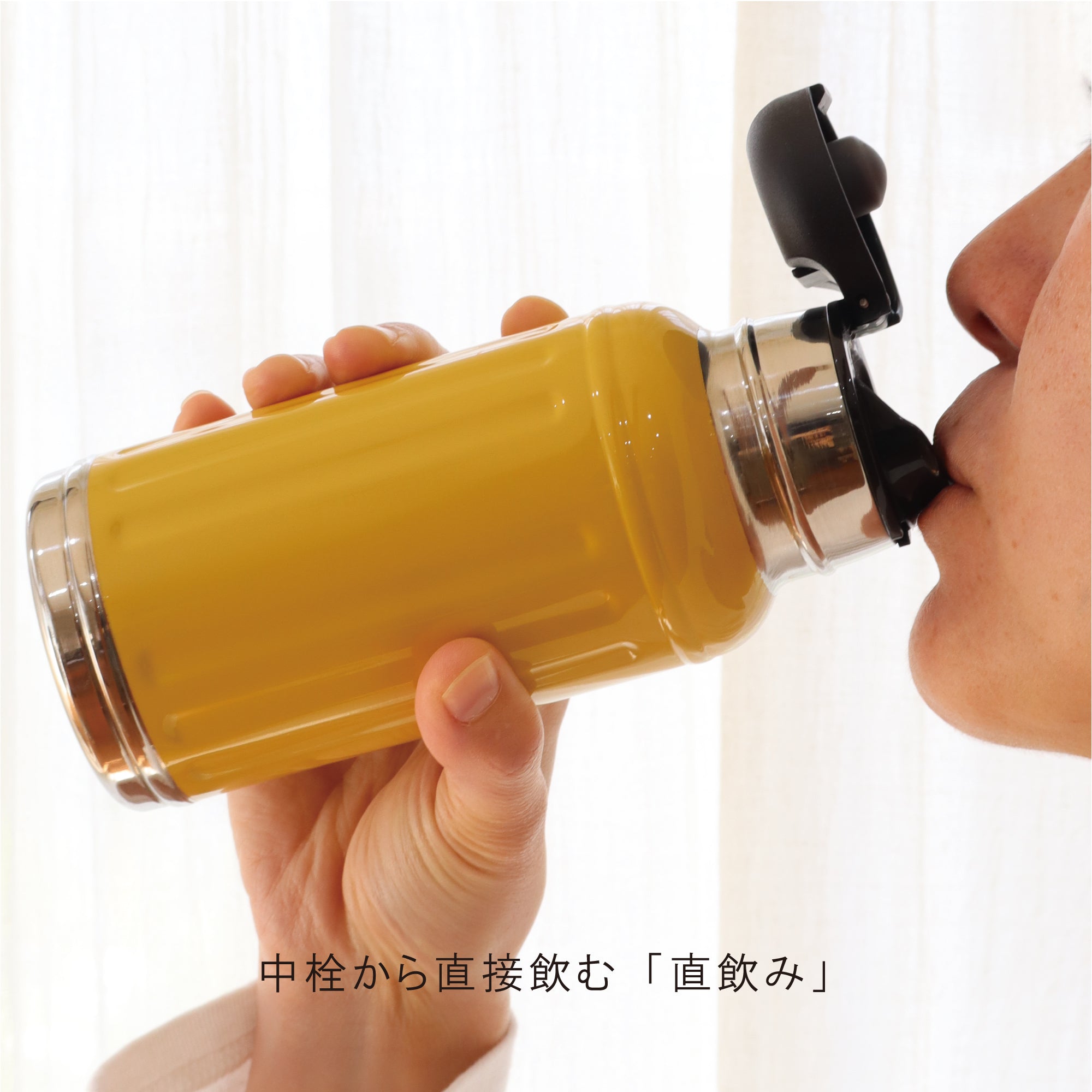 アメリカン50’s なビンテージデザイン、大人から4 歳くらい~小学校低学年までのお子様にも、おすすめの350ml サイズ。ワンタッチで開く中栓からの「直飲み」とフタにそそぐ「コップ飲み」どちらでも使えるから、ゴクゴク飲みたいときの水分補給や温かい飲み物をゆっくり飲みたいときなど、シーンを選ばずお使いいただけます。また背面プッシュですっきりした飲み口です。