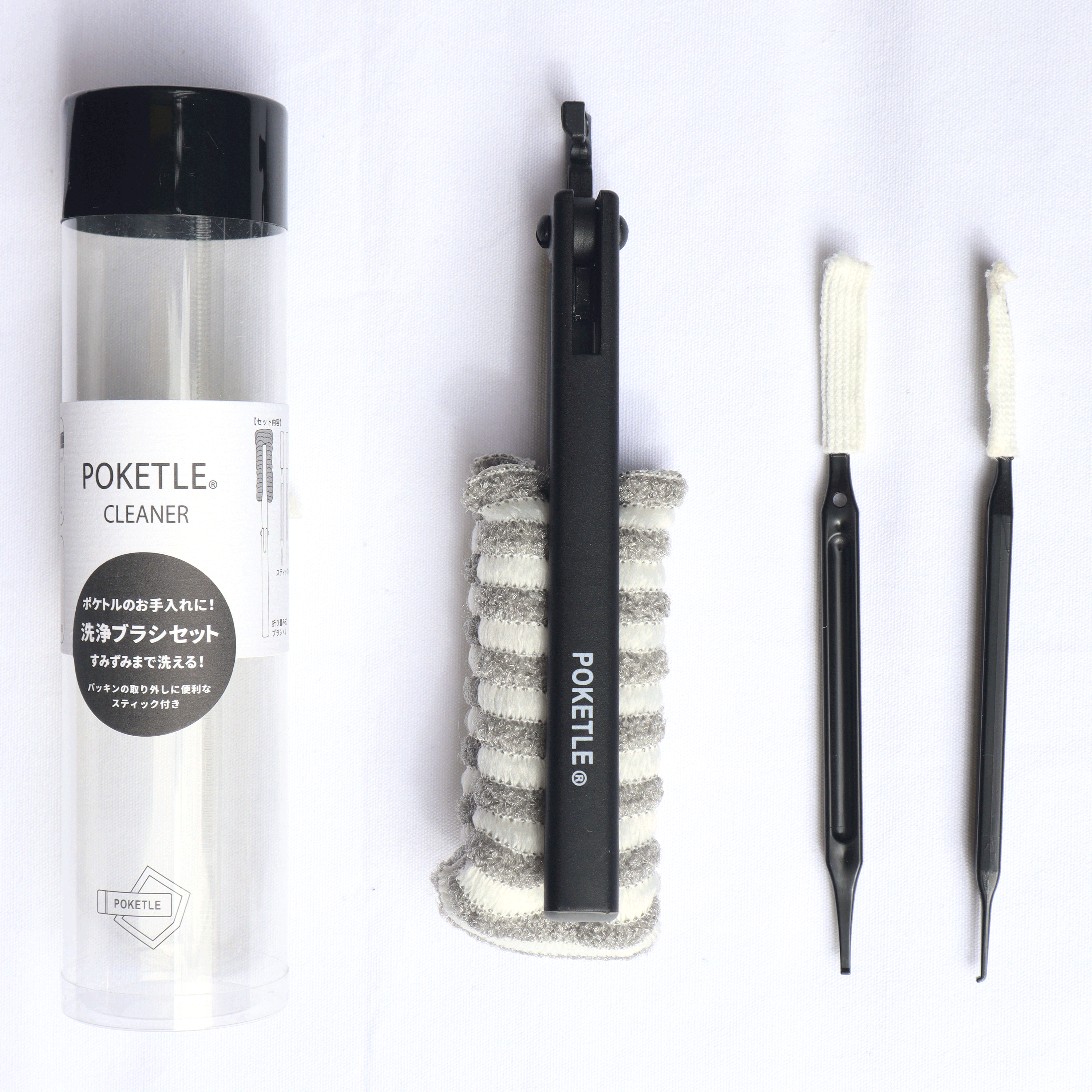 ポケトル専用洗浄ブラシセットがついに登場。すみずみまで洗えて、パッキンの取り外しに便利なスティック付きです。
