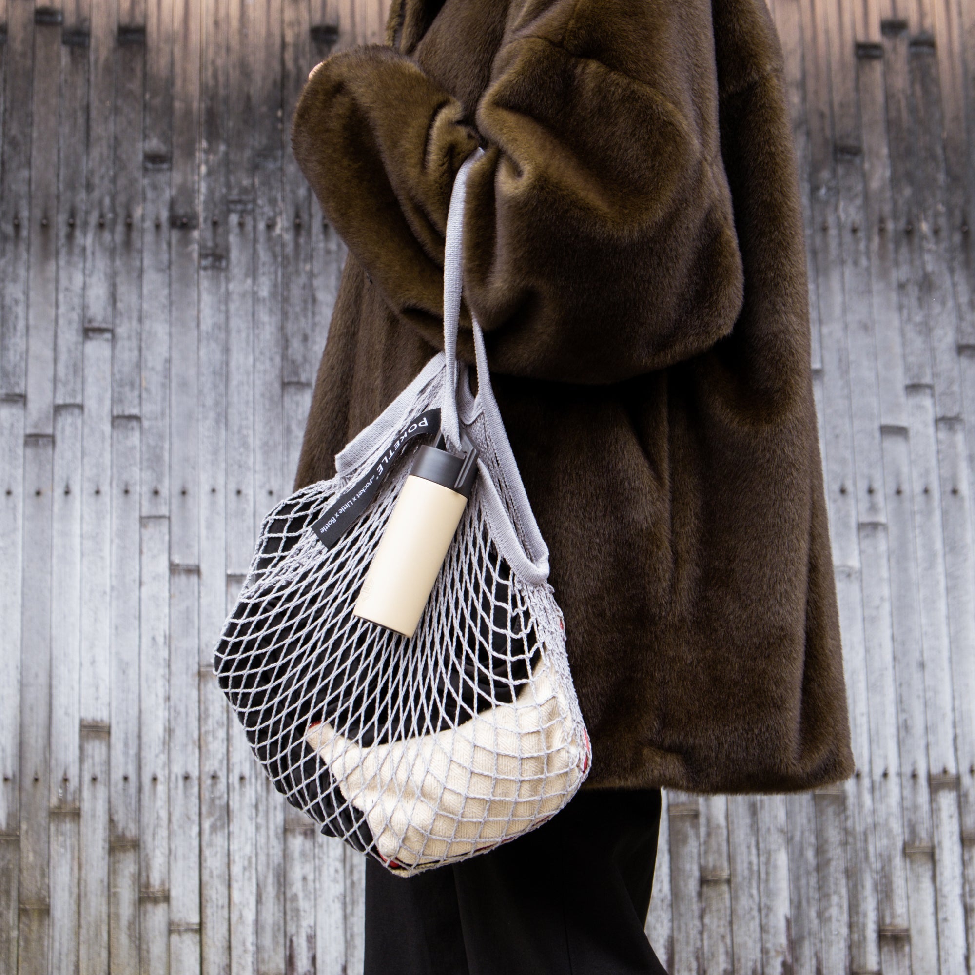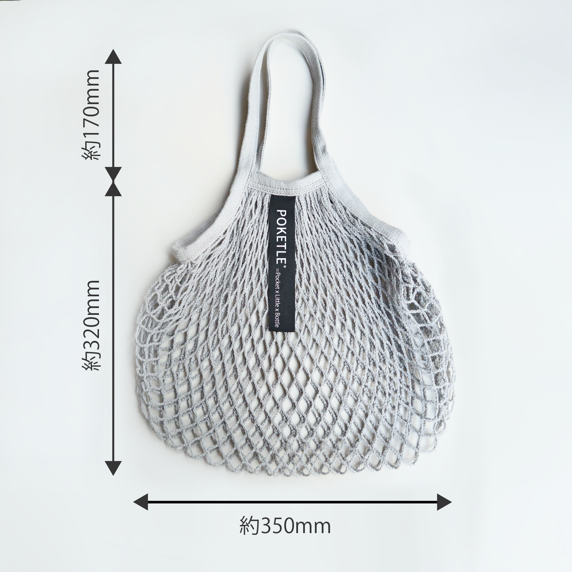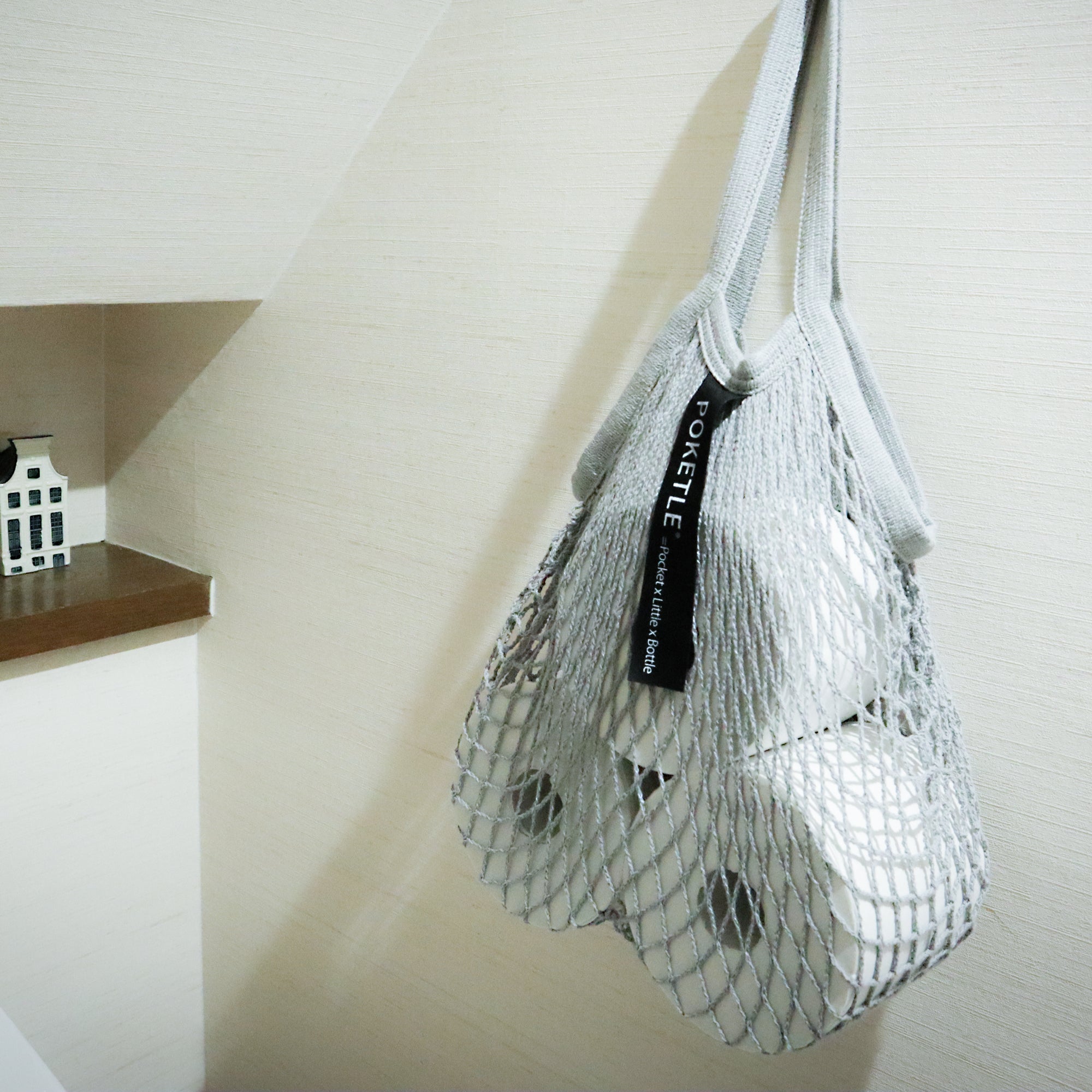 お出かけのサブバッグとして気軽に使えるスタイリッシュなメッシュバッグです。小さく畳んで持ち歩けます。ブラックのリボンがポイント。エコバッグや見せる収納など様々なシーンで活躍します。