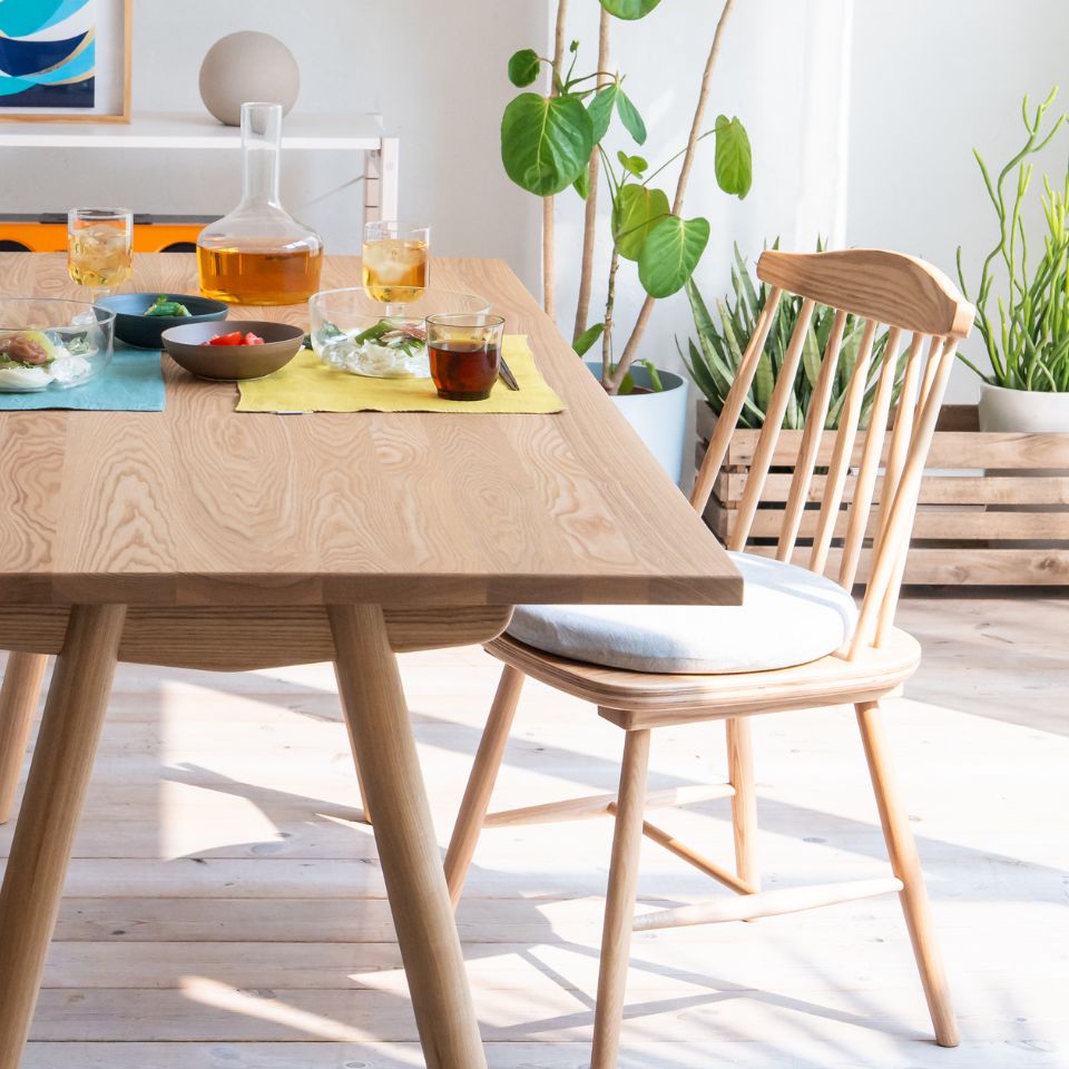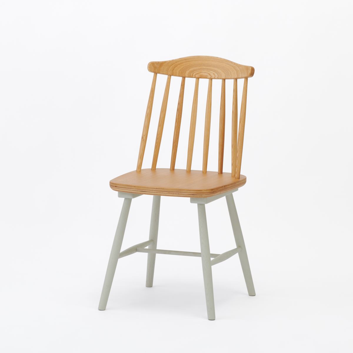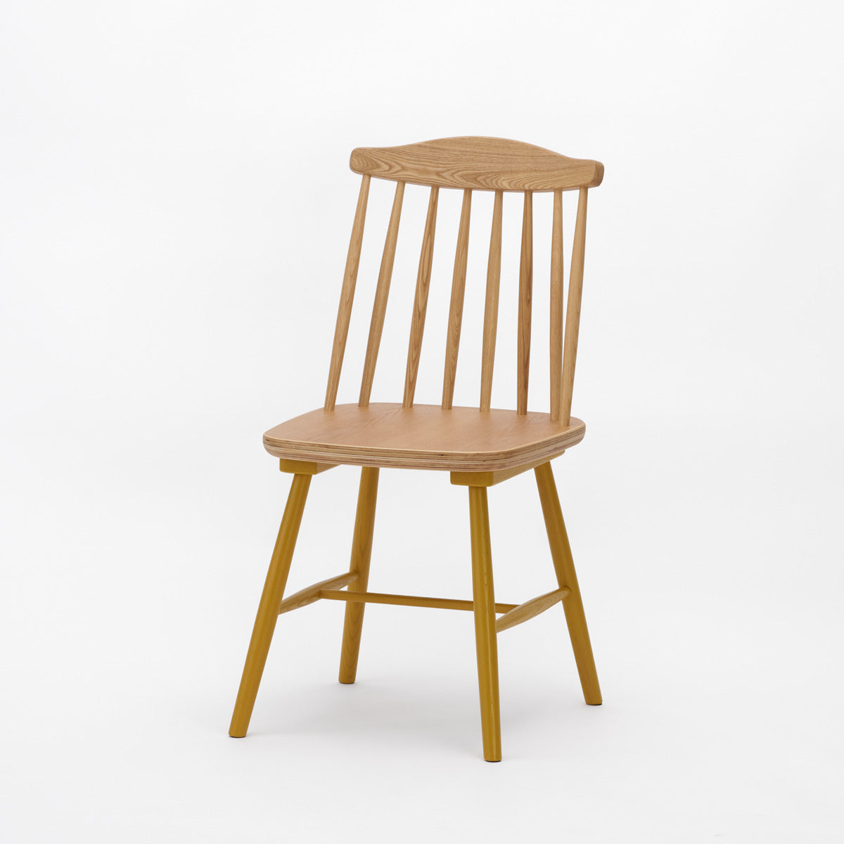 曲げ木とスピンドルタイプの背もたれが特徴のダイニングチェア。上部に向けて細くなっているので、すっきりとした印象を与えてくれます。 背もたれの曲げ木は、ENENの代表的なKUUM Chair「kinoco」に合わせたデザインになっています。背中にフィットしやすいよう緩やかに湾曲しているので、長時間座っても疲れにくいのも特徴です。脚と座面は組立て式になっており、上下で違う色にするなど、お客様のお好みでカラーの組み合わせもお楽しみいただけます。