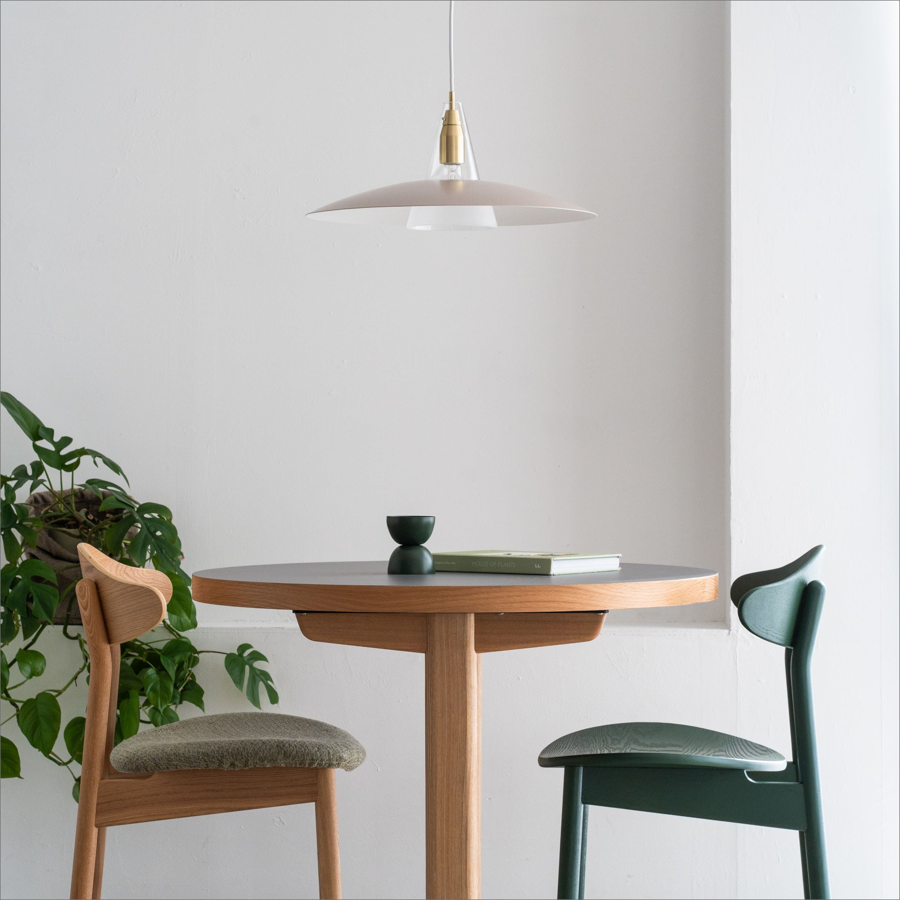丸いフォルムとあたたみを感じる雰囲気で、毎日の食事が楽しくなるような、2人掛けのダイニングセット 壁や窓など直線が多い空間に、丸テーブルを使うことで全体が柔らかい雰囲気になり、動線も確保しやすくなります。 そのため、様々なレイアウトに合わせやすく、コンパクトなお部屋でもゆとりある空間の使い方をすることができます。 直径85cmのテーブルは、1人でお使いの場合はお食事やデスク用にゆったりと、2人でお使いの場合はちょうど良い距離感でコミュニケーションの取りやすいサイズになっています。 また、傷や汚れに強く耐久性に優れ、アルコールでのふき取りも可能でメンテナンスが楽なメラミン天板は、経年変化も起きにくいので買った時の色合いのまま長くお使いいただけます。 落ち着いたグレーの天板と、緩やかなフォルムでアクセントカラーを取り入れた椅子を合わせた、北欧風テイストがお好みの方におすすめのダイニングセットです。 お気に入りのスペースで楽しくおしゃべり。 丸い天板だからできる距離感でリラックスした時間を過ごせます。 【セット内容】 ・ KUUM Table Φ850 - メラミングレー 脚 wood_T_natural ・ K UUM Chair kinoco - Natural Wooden Frame/Cushion カバー:グレー ・ KUUM Chair kinoco - Color Wooden Frame グリーン