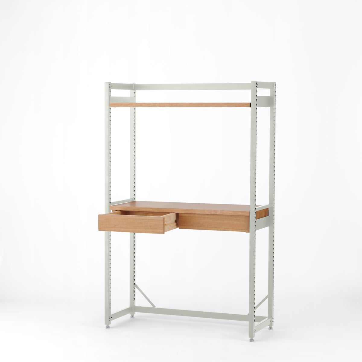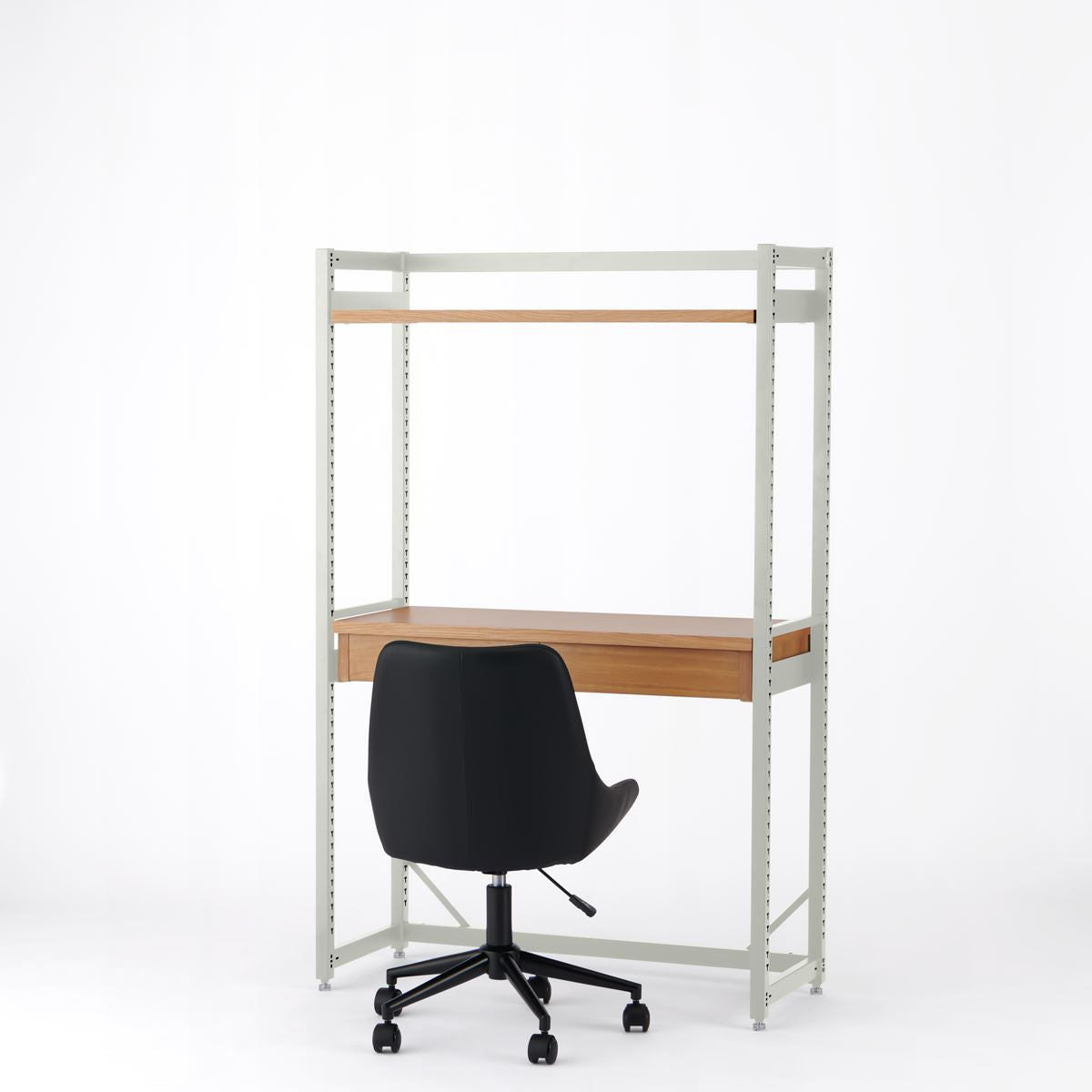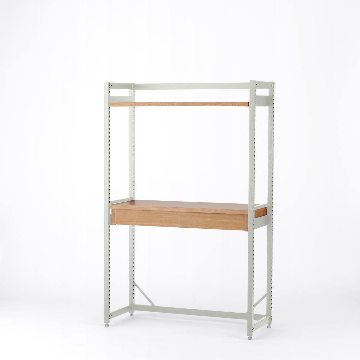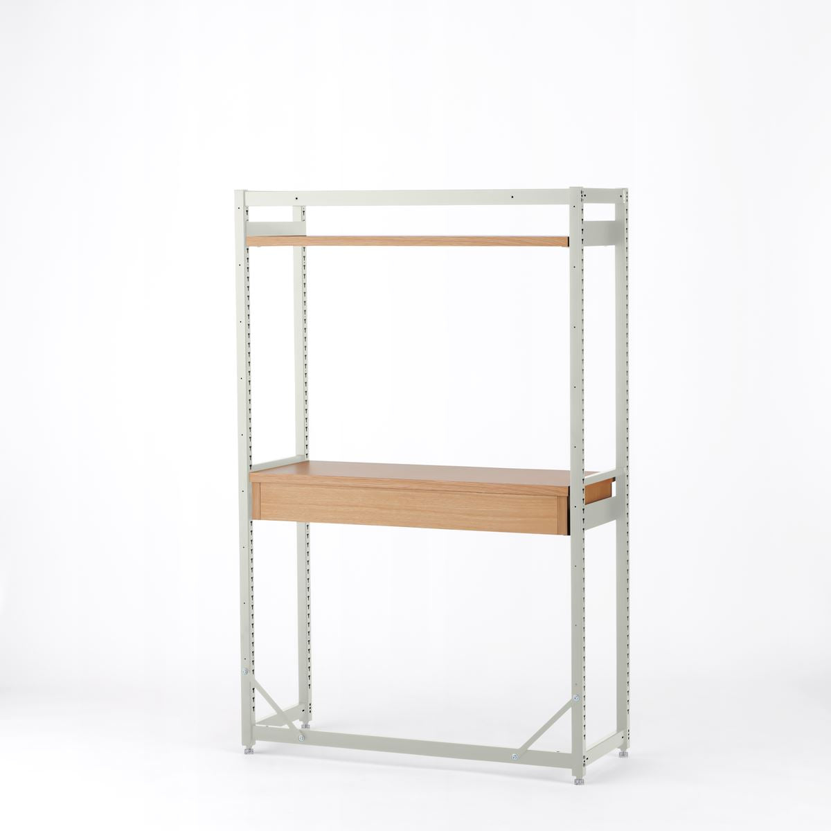 ENENのルーツである店舗什器製造のノウハウを活用し、その時々の暮らしや場所を選ばず、お客様に長く楽しんでいただける、自由度が高いシェルフ。25mm間隔で、棚やボックスなどのパーツを自由に取り付けることができ、住宅用家具よりも耐久性基準が高い店舗用の構造で設計しているので、強度の高さも特徴です。パーツカラーの組み合わせ次第で、収納ラックや飾り棚、キッチンのカップボードやワークスペースとしての使用が可能で、使い方は自由自在です。ワークスペースとしてお使いいただける、棚板とデスク棚の基本ベースセットです。圧迫感の少ないH1500タイプは、どんな空間でも丁度良い大きさで使いやすいサイズです。各棚とデスク棚はナチュラル・ブラウン、メラミングレーの3色から選べ、追加でご購入の方は以下のオプションページから必要分をお選びください。ちょっとしたワークスペースにしたり、お子様の勉強机代わりとしても最適です。棚板も後から追加出来るので、暮らしの変化に合わせてカスタムできます。デスク棚は引き出し付きなので、天板上で散らかり気味になる文房具や書類なども収納でき、すっきりとお使いいただけます。オプションアイテムは こちら です。