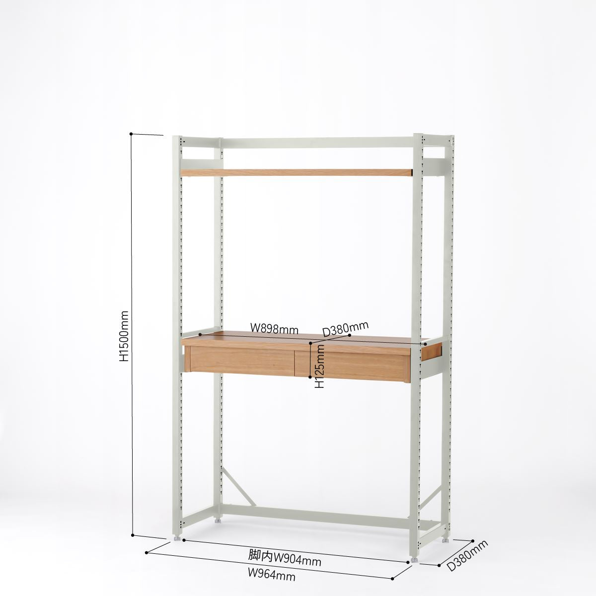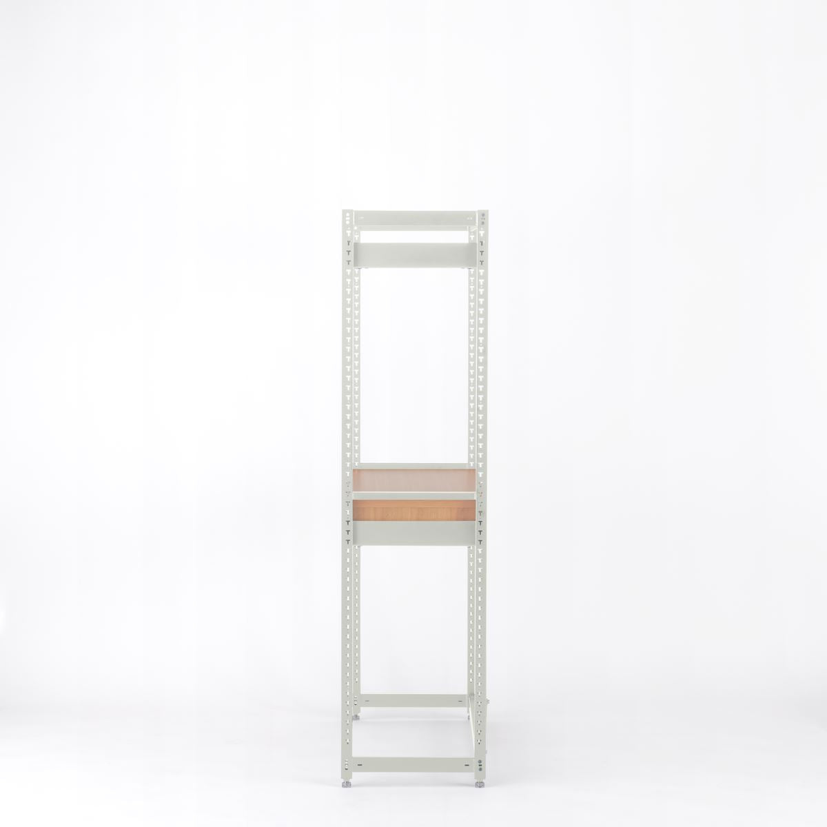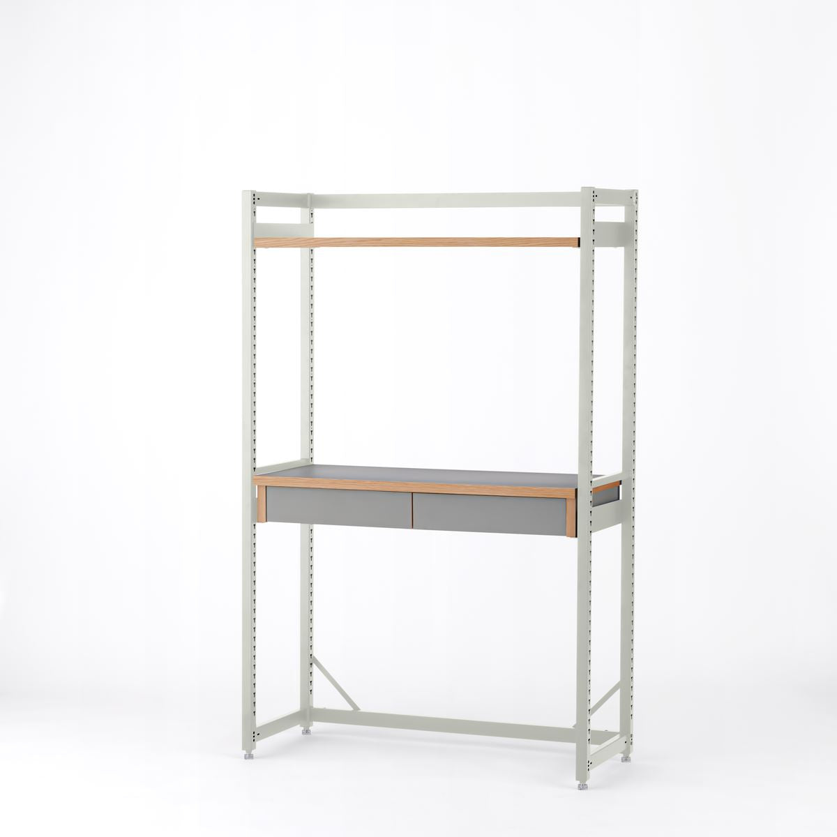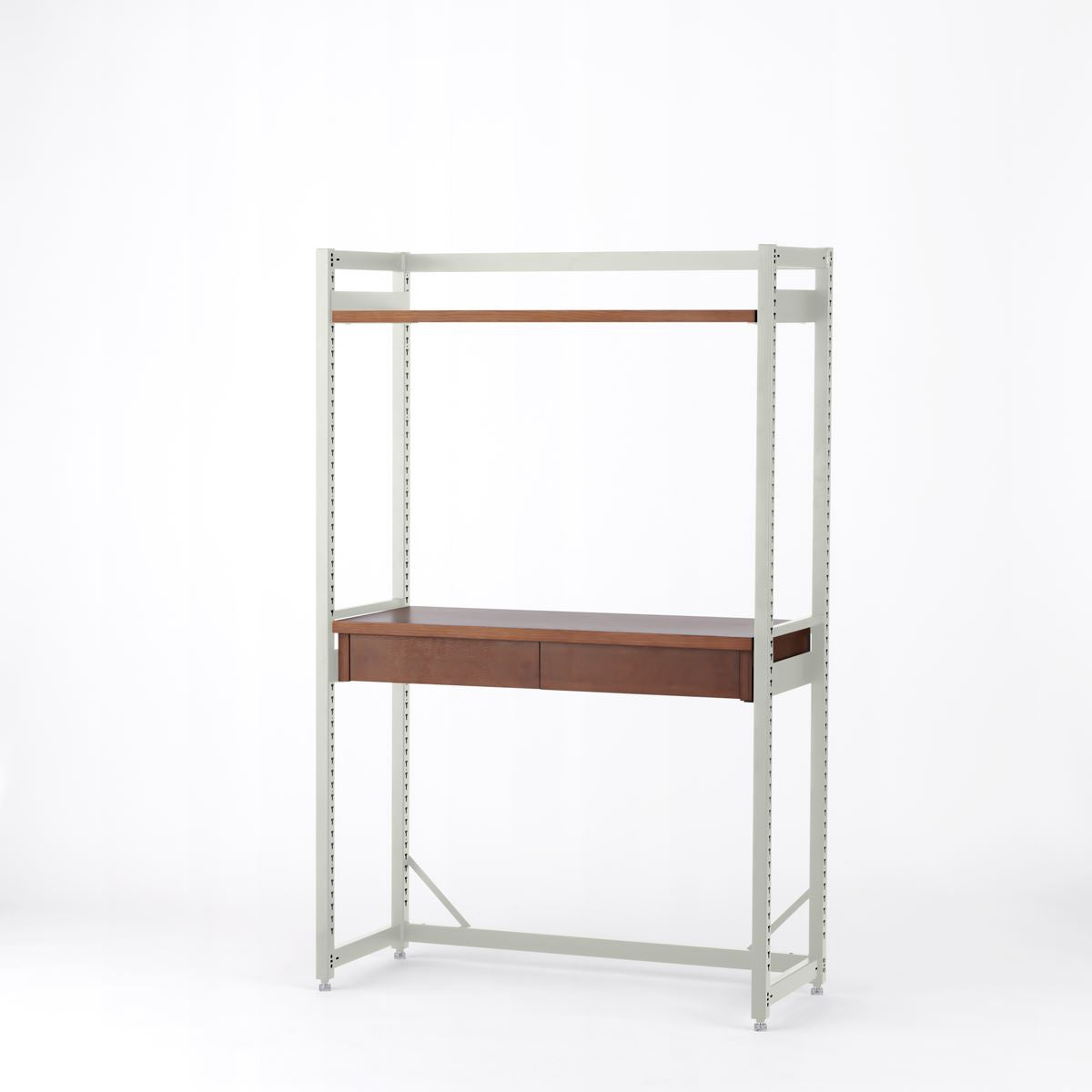 ENENのルーツである店舗什器製造のノウハウを活用し、その時々の暮らしや場所を選ばず、お客様に長く楽しんでいただける、自由度が高いシェルフ。25mm間隔で、棚やボックスなどのパーツを自由に取り付けることができ、住宅用家具よりも耐久性基準が高い店舗用の構造で設計しているので、強度の高さも特徴です。パーツカラーの組み合わせ次第で、収納ラックや飾り棚、キッチンのカップボードやワークスペースとしての使用が可能で、使い方は自由自在です。ワークスペースとしてお使いいただける、棚板とデスク棚の基本ベースセットです。圧迫感の少ないH1500タイプは、どんな空間でも丁度良い大きさで使いやすいサイズです。各棚とデスク棚はナチュラル・ブラウン、メラミングレーの3色から選べ、追加でご購入の方は以下のオプションページから必要分をお選びください。ちょっとしたワークスペースにしたり、お子様の勉強机代わりとしても最適です。棚板も後から追加出来るので、暮らしの変化に合わせてカスタムできます。デスク棚は引き出し付きなので、天板上で散らかり気味になる文房具や書類なども収納でき、すっきりとお使いいただけます。オプションアイテムは こちら です。
