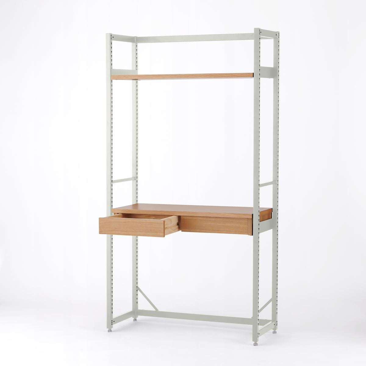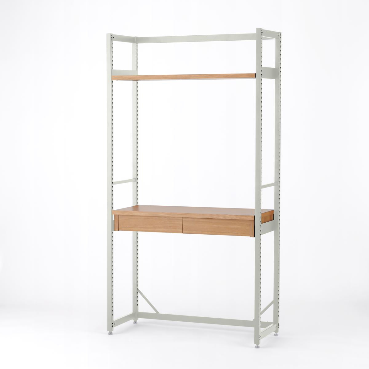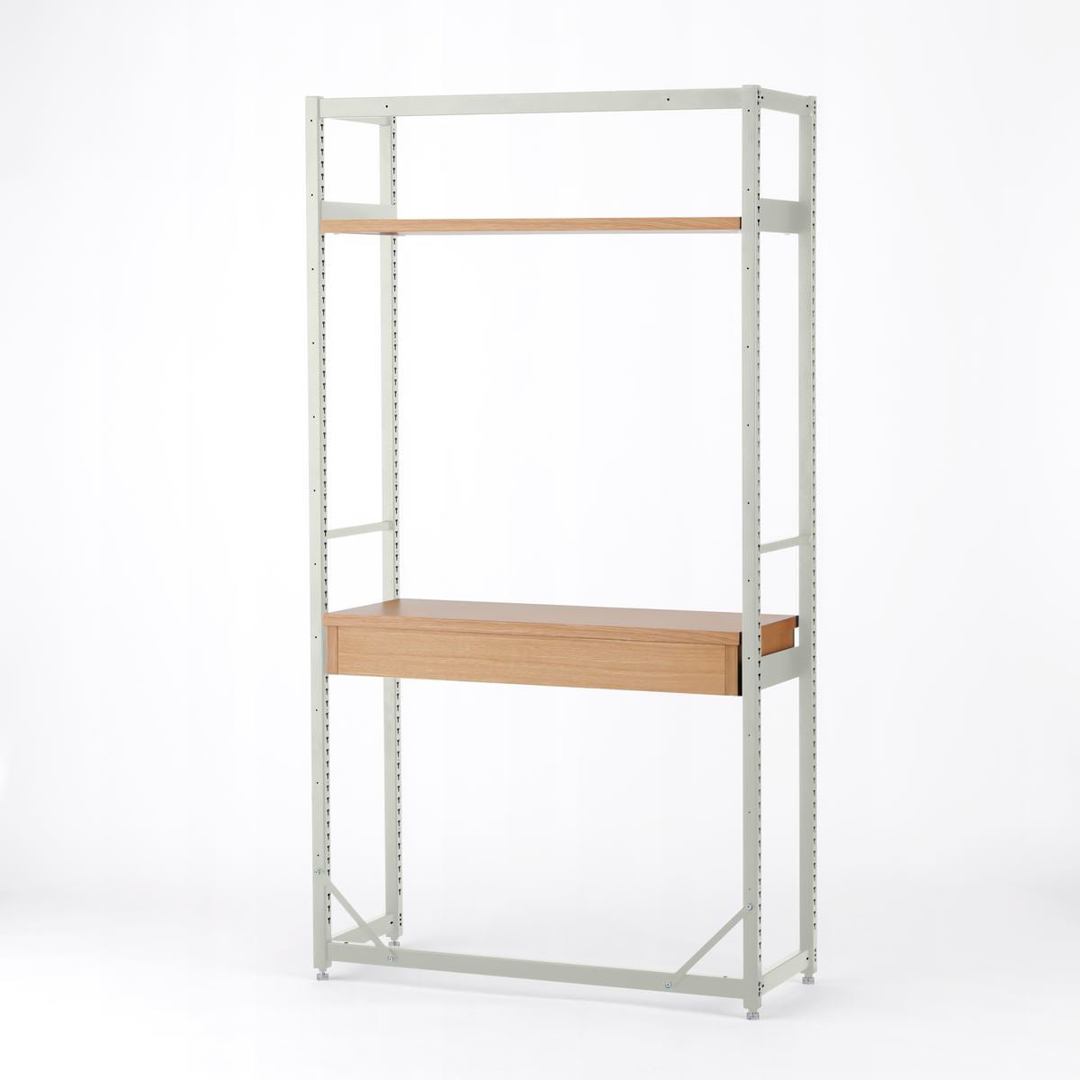 ENENのルーツである店舗什器製造のノウハウを活用し、その時々の暮らしや場所を選ばず、お客様に長く楽しんでいただける、自由度が高いシェルフ。25mm間隔で、棚やボックスなどのパーツを自由に取り付けることができ、住宅用家具よりも耐久性基準が高い店舗用の構造で設計しているので、強度の高さも特徴です。パーツカラーの組み合わせ次第で、収納ラックや飾り棚、キッチンのカップボードやワークスペースとしての使用が可能で、使い方は自由自在です。ワークスペースとしてお使いいただける、棚板とデスク棚の基本ベースセットです。H1800タイプは、最上段でも踏み台が要らず手が届くので、多く収納できながら、使い勝手も良い高さになります。各棚とデスク棚はナチュラル・ブラウン、メラミングレーの3色から選べ、追加でご購入の方は以下のオプションページから必要分をお選びください。ちょっとしたワークスペースにしたり、お子様の勉強机代わりとしても最適です。棚板も後から追加出来るので、暮らしの変化に合わせてカスタムできます。デスク棚は引き出し付きなので、天板上で散らかり気味になる文房具や書類なども収納でき、すっきりとお使いいただけます。オプションアイテムは こちら です