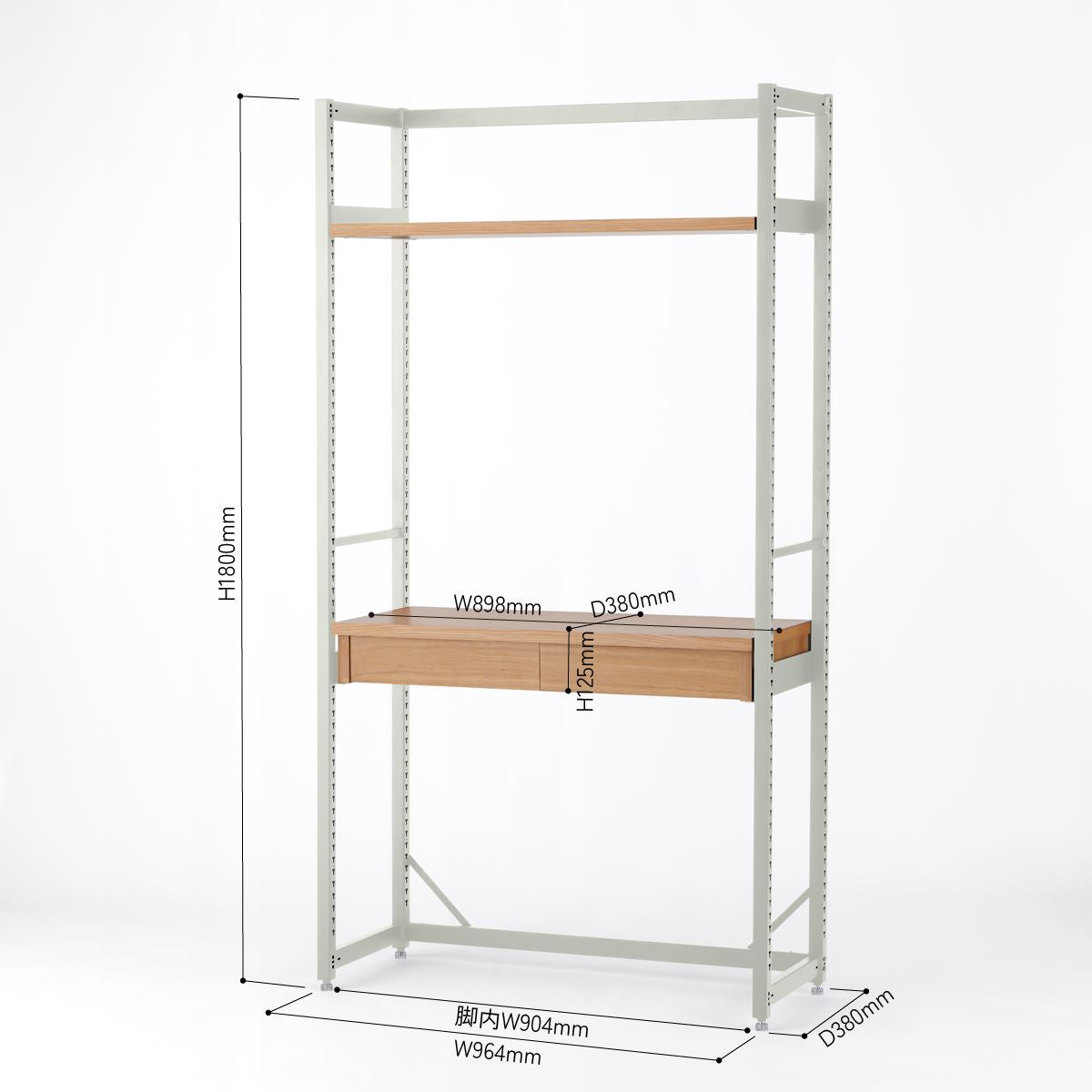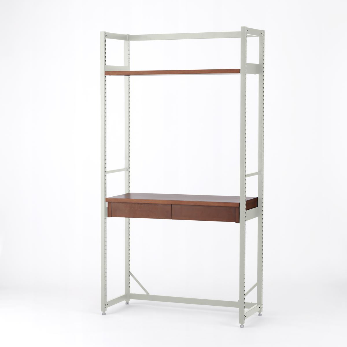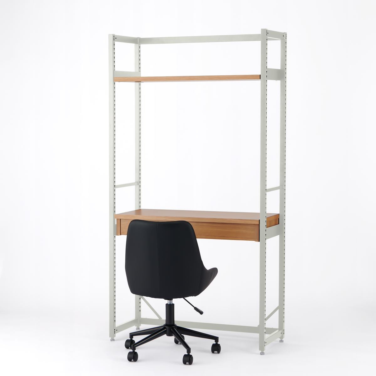 ENENのルーツである店舗什器製造のノウハウを活用し、その時々の暮らしや場所を選ばず、お客様に長く楽しんでいただける、自由度が高いシェルフ。25mm間隔で、棚やボックスなどのパーツを自由に取り付けることができ、住宅用家具よりも耐久性基準が高い店舗用の構造で設計しているので、強度の高さも特徴です。パーツカラーの組み合わせ次第で、収納ラックや飾り棚、キッチンのカップボードやワークスペースとしての使用が可能で、使い方は自由自在です。ワークスペースとしてお使いいただける、棚板とデスク棚の基本ベースセットです。H1800タイプは、最上段でも踏み台が要らず手が届くので、多く収納できながら、使い勝手も良い高さになります。各棚とデスク棚はナチュラル・ブラウン、メラミングレーの3色から選べ、追加でご購入の方は以下のオプションページから必要分をお選びください。ちょっとしたワークスペースにしたり、お子様の勉強机代わりとしても最適です。棚板も後から追加出来るので、暮らしの変化に合わせてカスタムできます。デスク棚は引き出し付きなので、天板上で散らかり気味になる文房具や書類なども収納でき、すっきりとお使いいただけます。オプションアイテムは こちら です