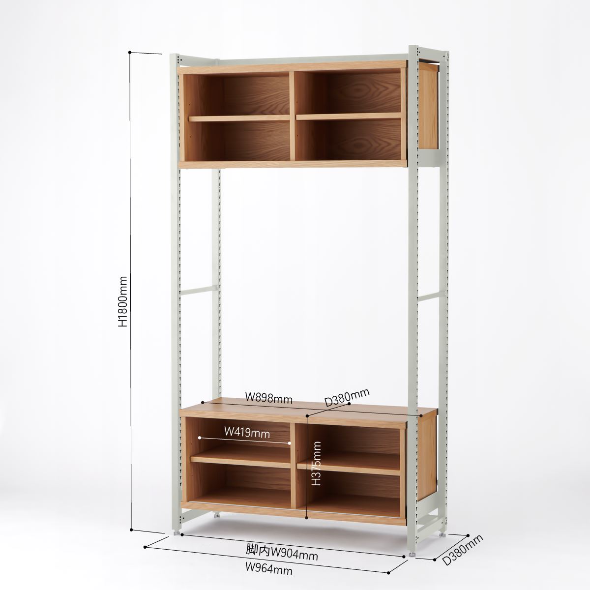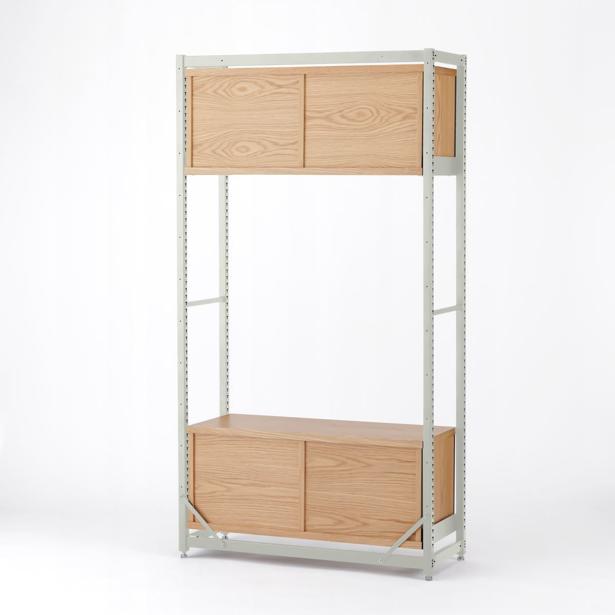 ENENのルーツである店舗什器製造のノウハウを活用し、その時々の暮らしや場所を選ばず、お客様に長く楽しんでいただける、自由度が高いシェルフ。25mm間隔で、棚やボックスなどのパーツを自由に取り付けることができ、住宅用家具よりも耐久性基準が高い店舗用の構造で設計しているので、強度の高さも特徴です。パーツカラーの組み合わせ次第で、収納ラックや飾り棚、キッチンのカップボードやワークスペースとしての使用が可能で、使い方は自由自在です。収納機能を重視される方に向けた、収納BOXが2段付いたの基本ベースセットです。H1800タイプは、最上段でも踏み台が要らず手が届くので、多く収納できながら、使い勝手も良い高さになります。収納BOXはナチュラル・ブランの2色から選べます。また収納BOXの基本ベースはオープンタイプになりますが、収納を隠したい方・見せる収納をしたい方それぞれに合わせて突板・メラミンタイプの扉やガラス扉を用意しています。収納用扉や棚板など追加でご購入の方は以下のオプションページから必要分をお選びください。収納BOXの扉をガラス扉にすることでキッチンボードのように使ったり、棚板を追加してお気に入りのアイテムを並べたりディスプレイできる飾り棚にしたりと、収納機能を活かせるシェルフをカスタムしやすいセットです。オプションアイテムは こちら です。