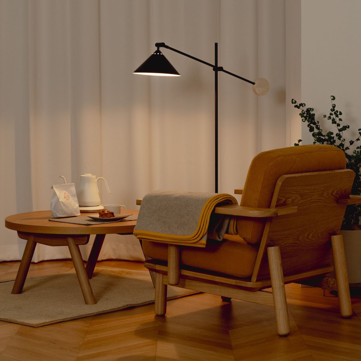 多種多様なシーンやお好みのスタイルに合わせられるKUUMテーブル。お好みの天板と脚をお選びいただけます。天板と脚の取付方法はどのデザインでも共通で、簡単に交換や変更が可能です。テイストに飽きたり、傷がついたら終わりではなく、パーツを交換することで長くご使用いただけます。脚のデザインは、木タイプ2種類×2色、鉄タイプ3種類×2色の全10種類。力強く美しい木目のホワイトオークの突板を使用した天板は、無垢材と比べて反りや割れが少なく、木目が整っていることが特徴です。また、少ない材料で天然木を気軽に楽しむことができるため、環境に優しく、製造コストを抑えることができます。ENENでは、突板の中でも天然木の質感をより感じられるように、厚突と呼ばれる0.6mmの突板を使用しており、削れ・摩耗に強い仕様になっています。さらに表面をウレタン仕上げにしているので、水や汚れが染み込みにくく、耐久性に優れ、傷にも強くしています。木脚・鉄脚どちらを合わせても柔らかい印象を与えてくれるので、どんなテイストのインテリアにも合わせやすいです。円形テーブルは角が無い分アクセスが自由で、座った時に横並びにならず、自然に相手の顔が見えるのでコミュニケーションが取りやすいという特徴があります。また、壁など直線が多いお部屋に曲線を入れることで、柔らかい雰囲気をもたらしてくれ、動線も広く確保しやすくなります。Φ850のサイズは1人でお使いの場合は、お食事やデスクとしてもゆったりとしたスペースでお使いいただけ、 2人で使う時も遠すぎず、ちょうど良い距離感で使いやすいサイズになっています。