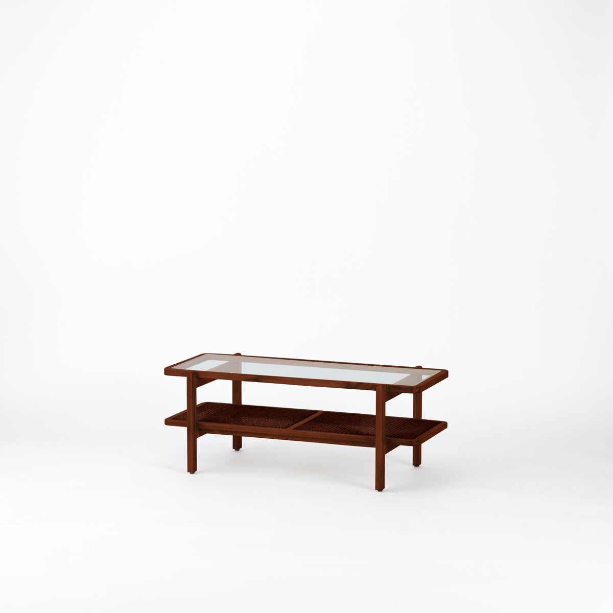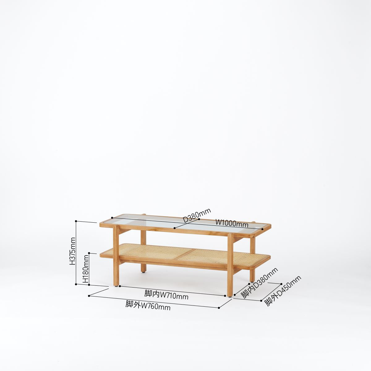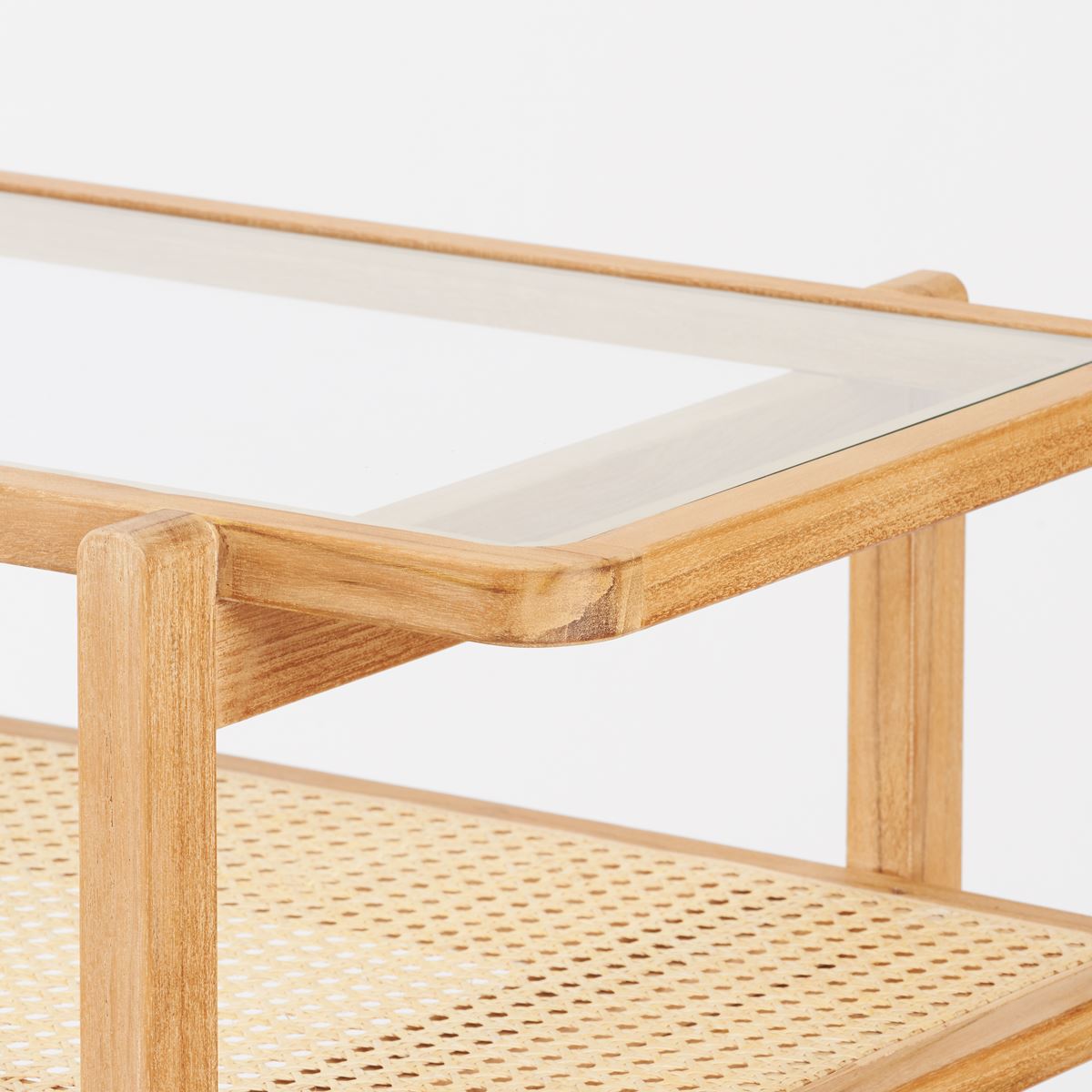 ラタンとチーク無垢材を組み合わせたリビングテーブル。ラタンは手編みなのでハンドメイドの温かみを感じていただけます。ガラス天板とラタン編みで圧迫感の少ないデザインで、下の棚はディスプレイスペースとしても活用できます。