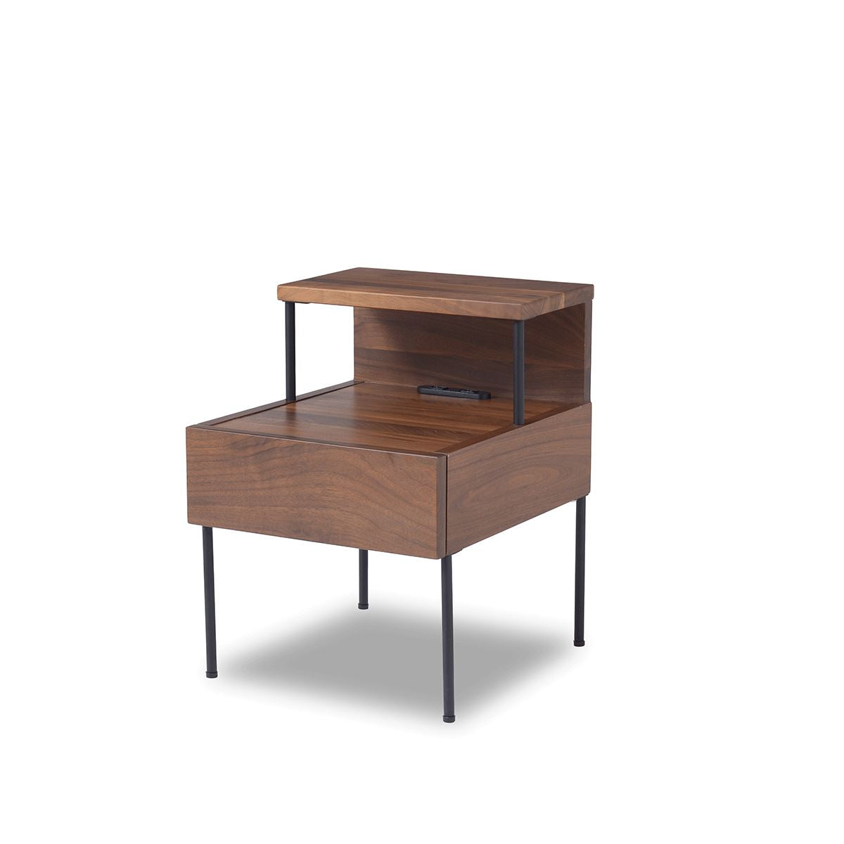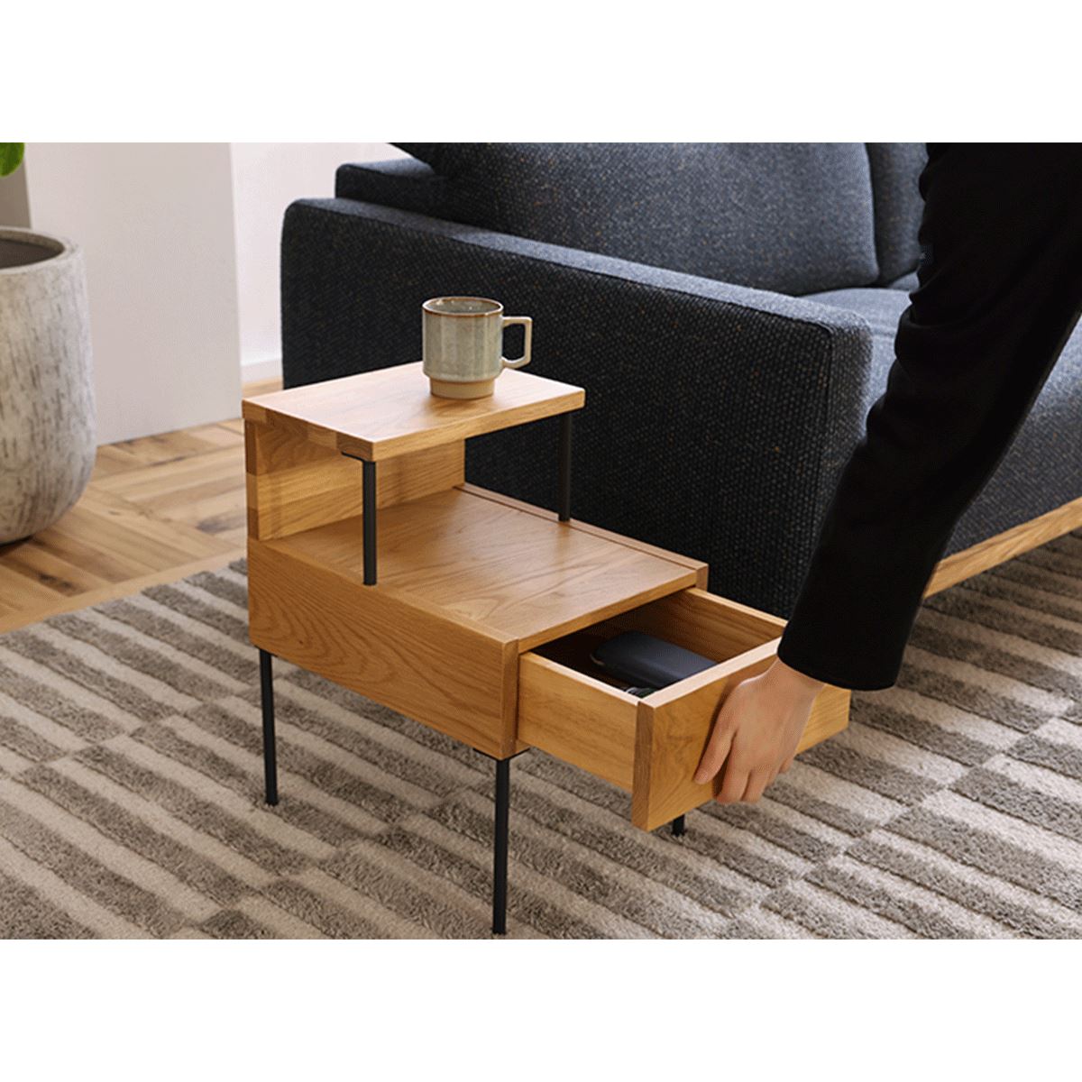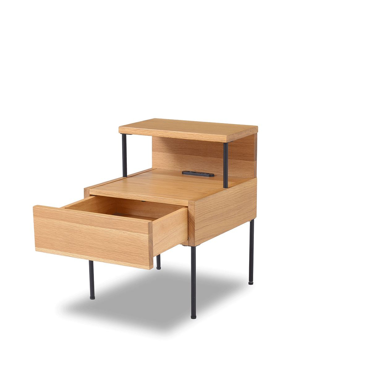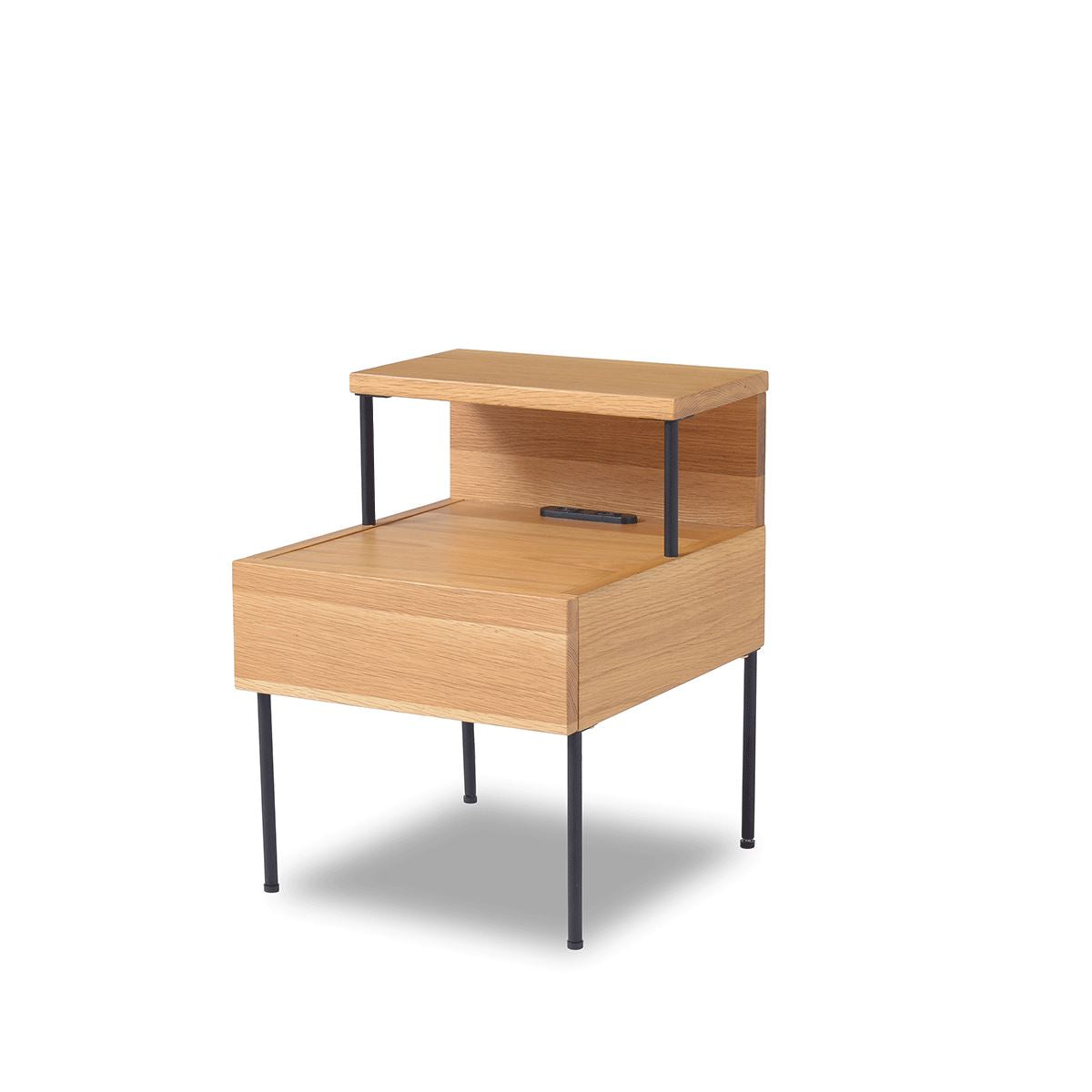 ミニマルなデザインのサイドテーブル。段違いの棚に雑誌やメガネなどの小物を置いたり、引き出しも付いているので、小ぶりながら収納性にも優れています。コンセント付きでスマートフォンやタブレットの充電にも対応します。ベッドサイドやソファサイドで活躍するアイテムです。