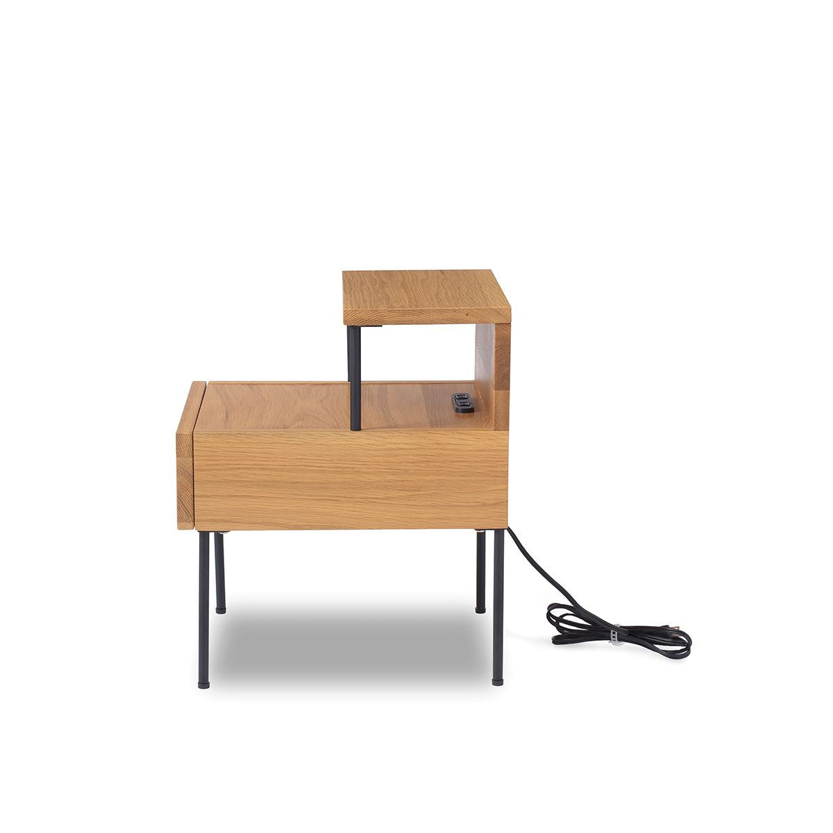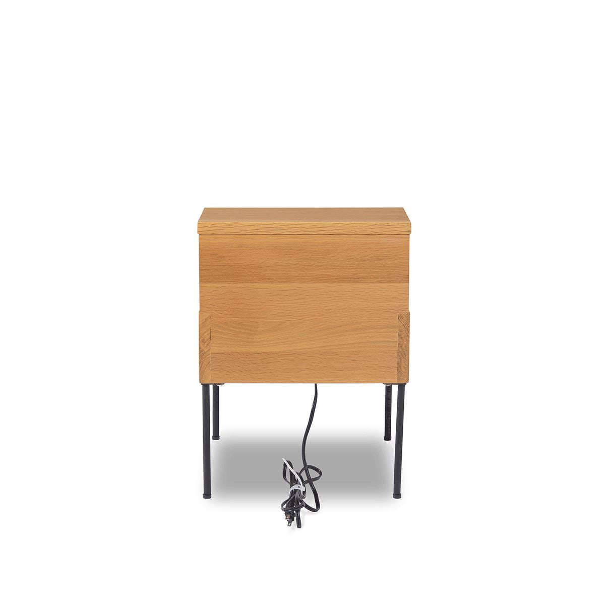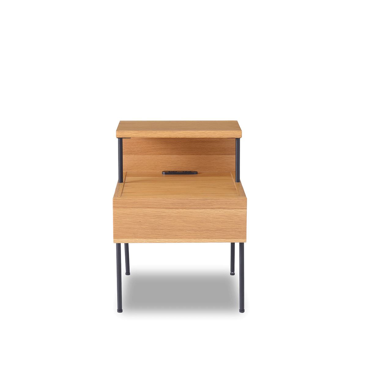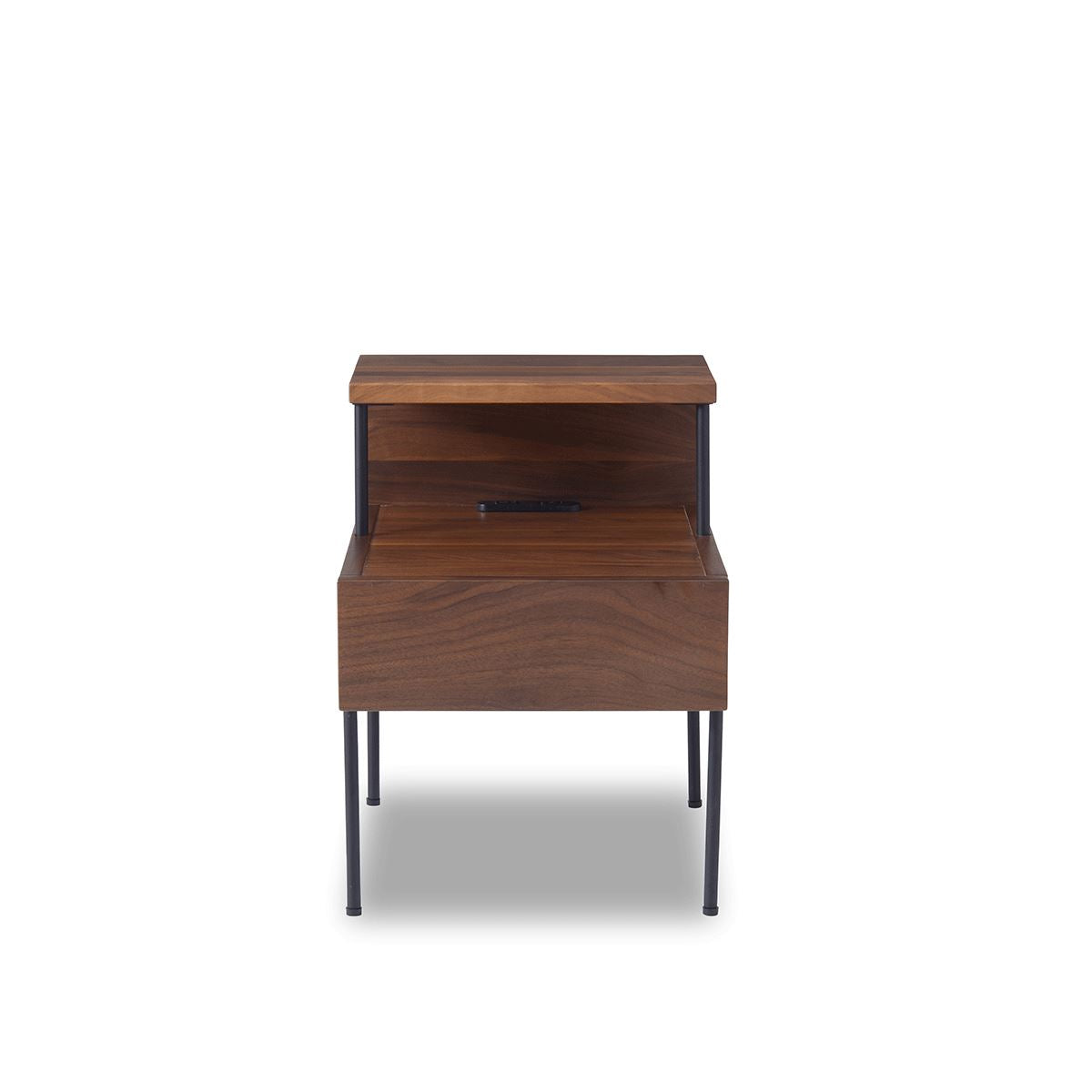 ミニマルなデザインのサイドテーブル。段違いの棚に雑誌やメガネなどの小物を置いたり、引き出しも付いているので、小ぶりながら収納性にも優れています。コンセント付きでスマートフォンやタブレットの充電にも対応します。ベッドサイドやソファサイドで活躍するアイテムです。