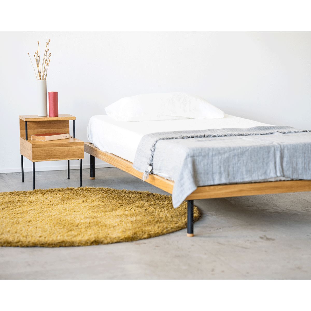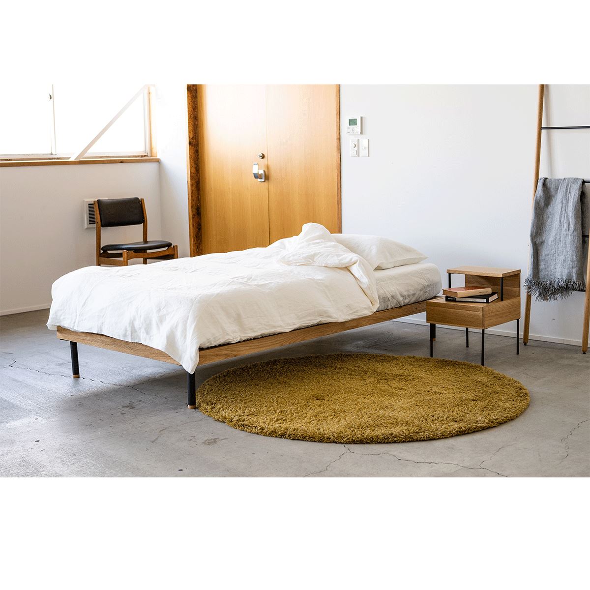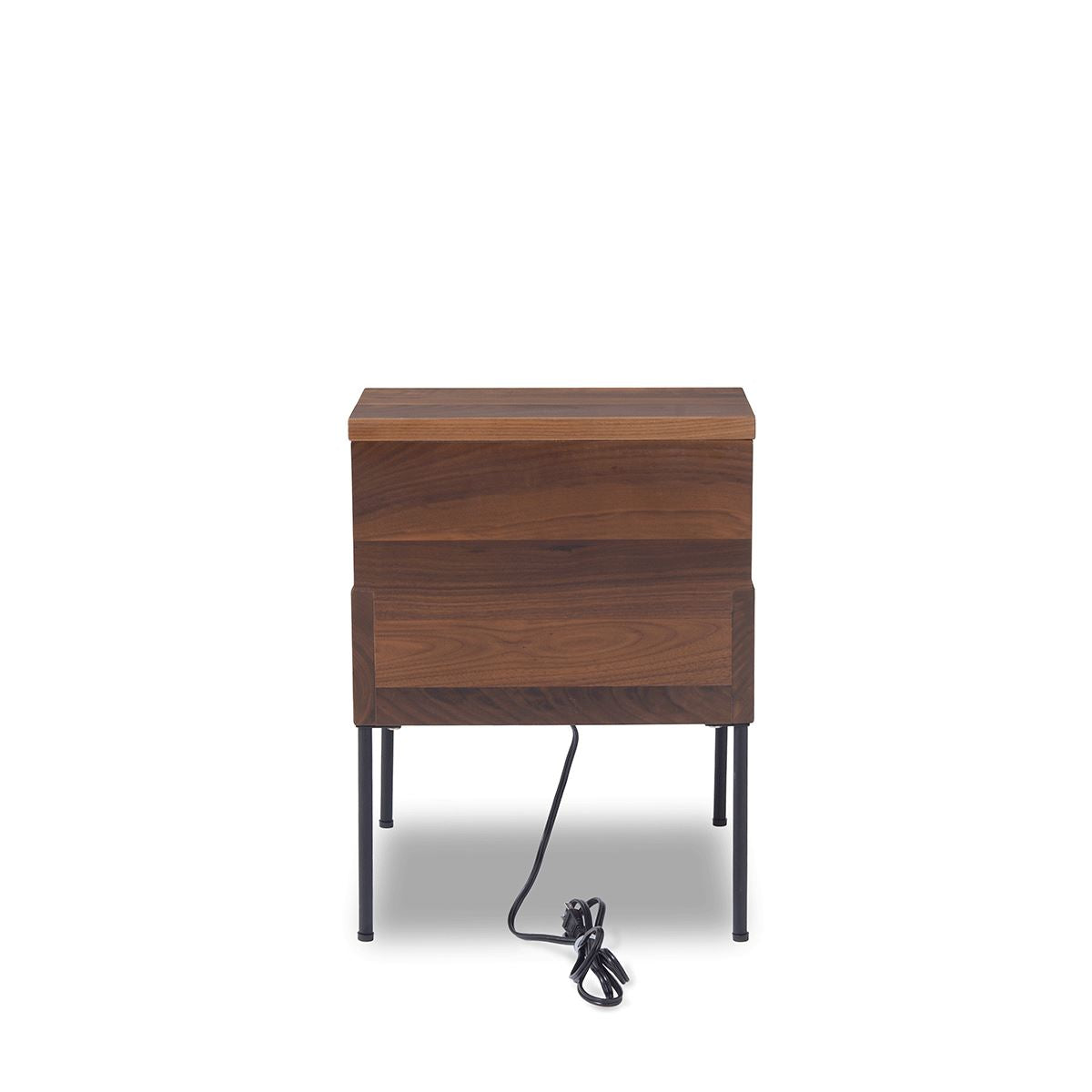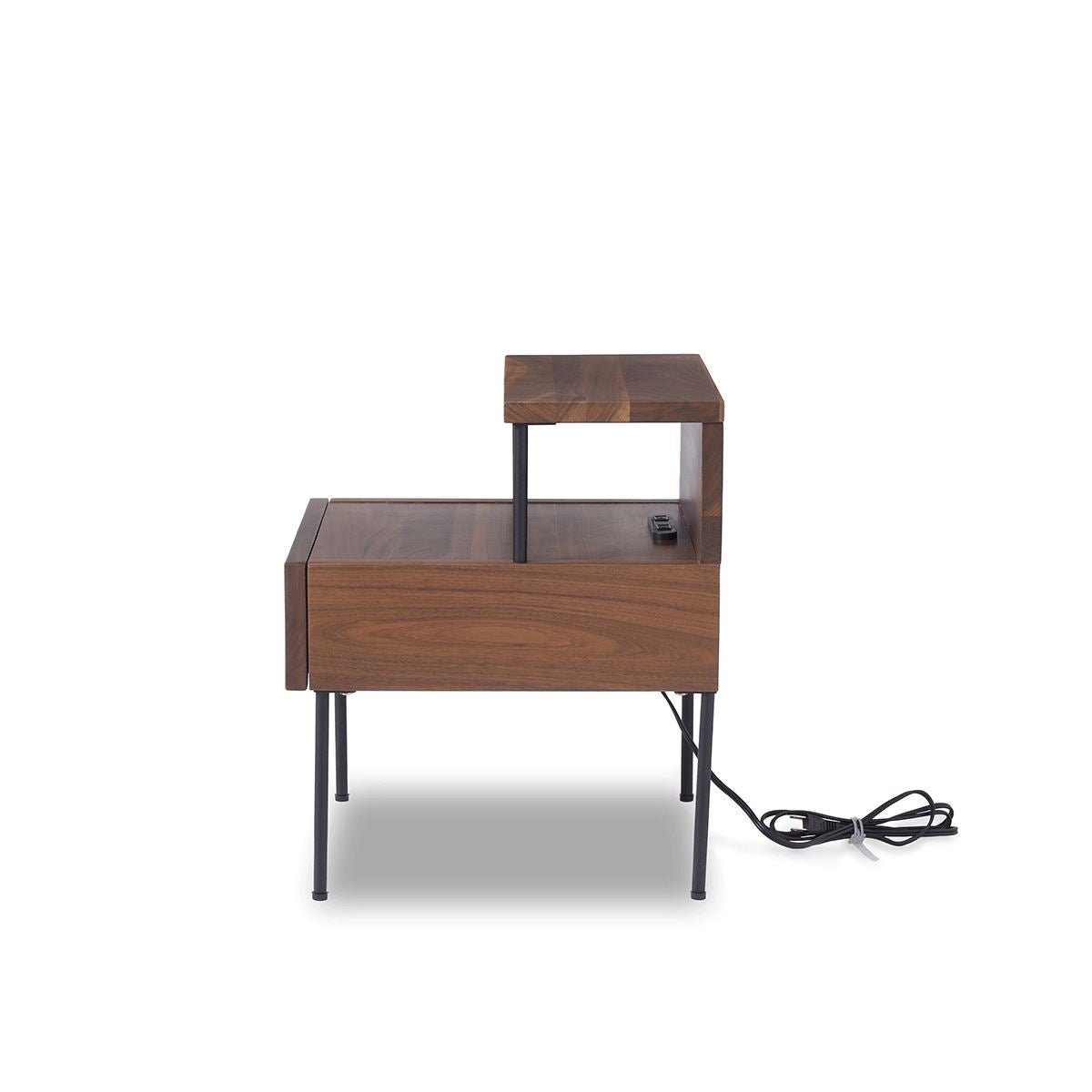 ミニマルなデザインのサイドテーブル。段違いの棚に雑誌やメガネなどの小物を置いたり、引き出しも付いているので、小ぶりながら収納性にも優れています。コンセント付きでスマートフォンやタブレットの充電にも対応します。ベッドサイドやソファサイドで活躍するアイテムです。