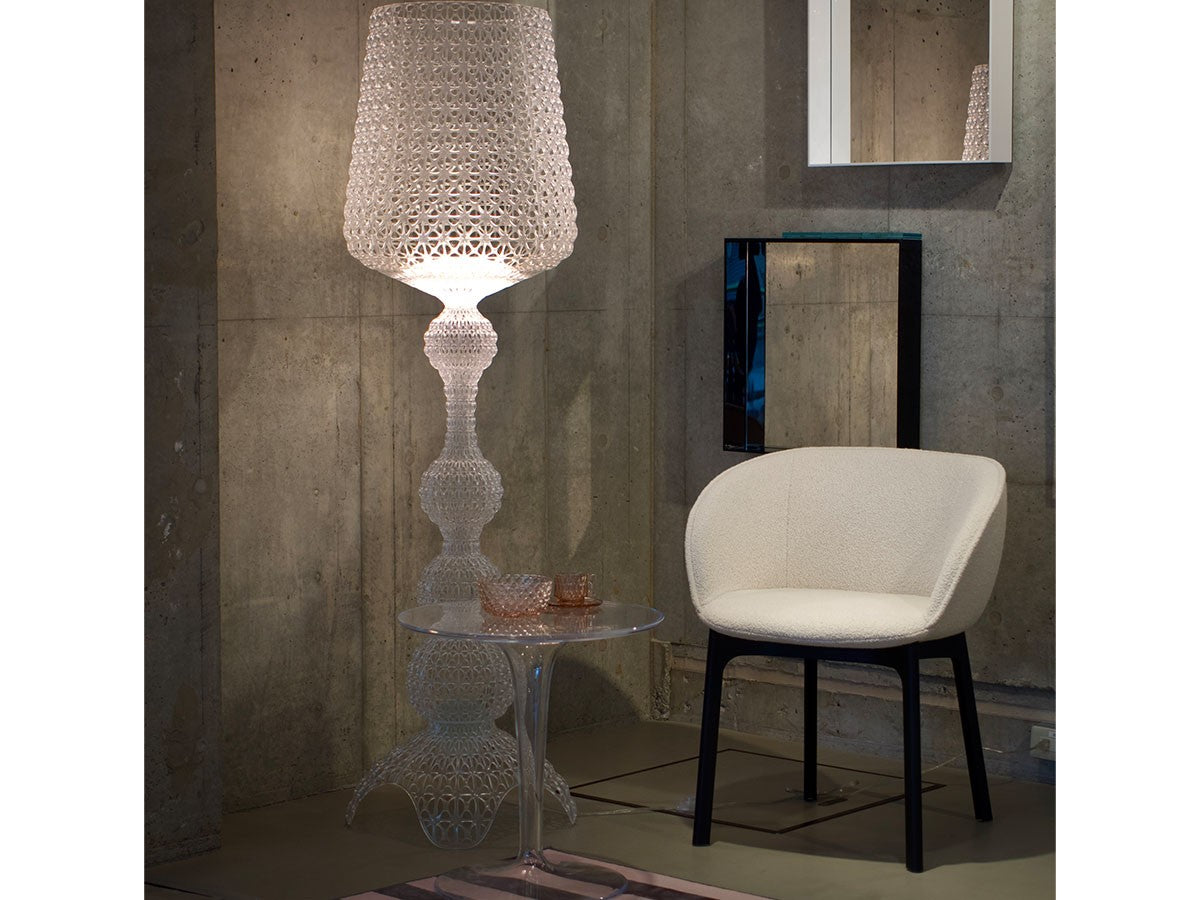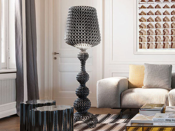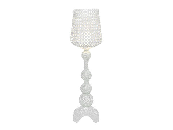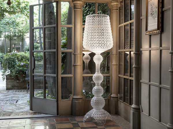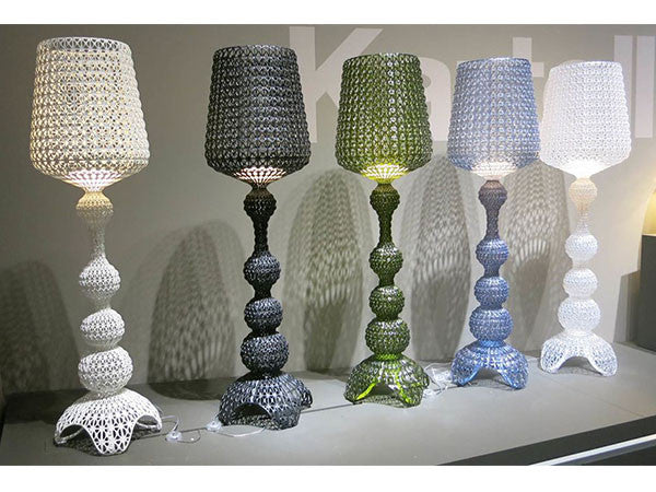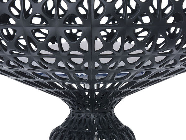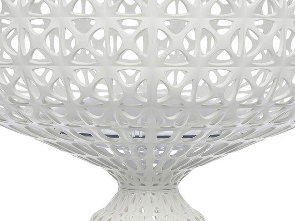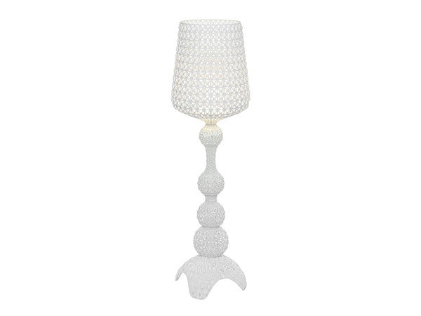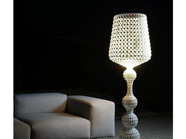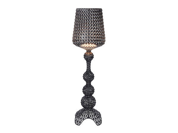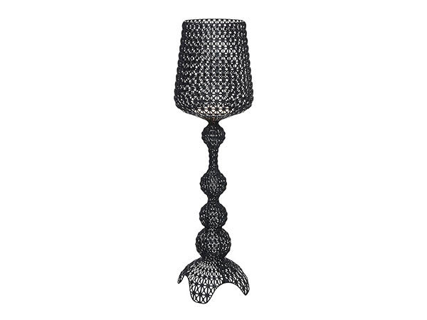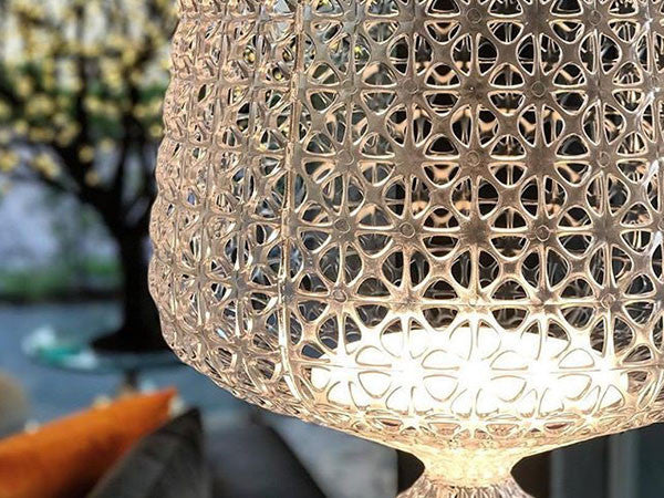 「カブキ」は糸を紡いで作られるレース生地のような独自形状のフロアランプです。レースの穴を通して直接届く光と、製品越しの穏やかに拡散する光が合わさって、周囲を美しく照らします。ひとつひとつ手間を掛けた職人技のように見えるこの形状は、インジェクションモールディングの洗練された最新技術により製品化が実現されました。