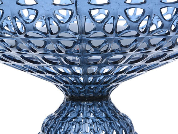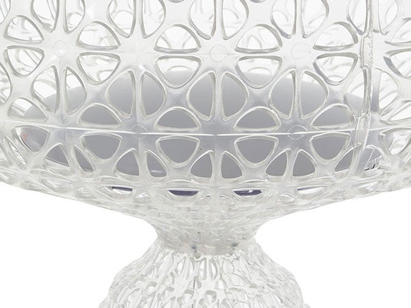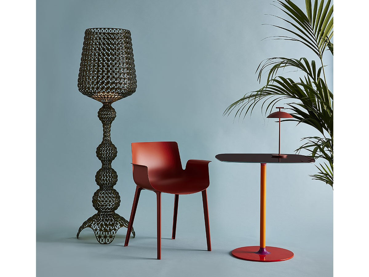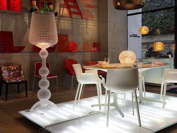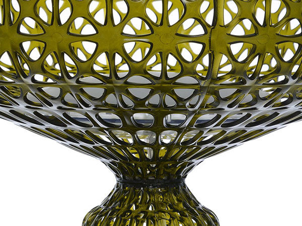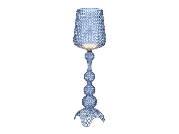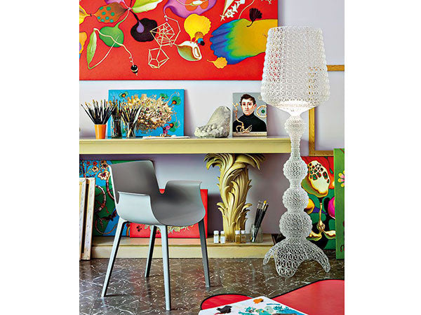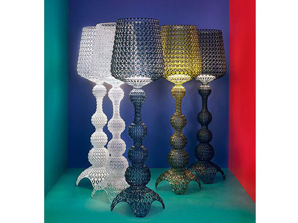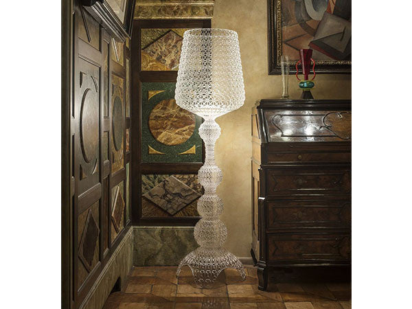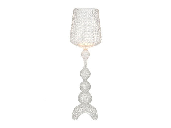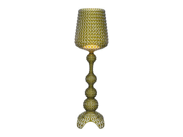 「カブキ」は糸を紡いで作られるレース生地のような独自形状のフロアランプです。レースの穴を通して直接届く光と、製品越しの穏やかに拡散する光が合わさって、周囲を美しく照らします。ひとつひとつ手間を掛けた職人技のように見えるこの形状は、インジェクションモールディングの洗練された最新技術により製品化が実現されました。