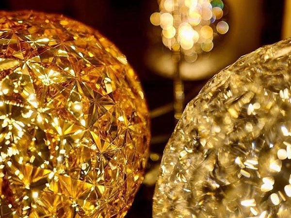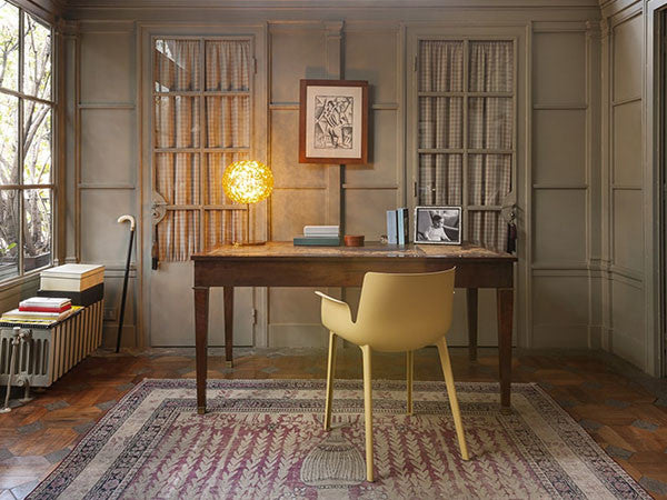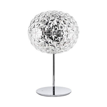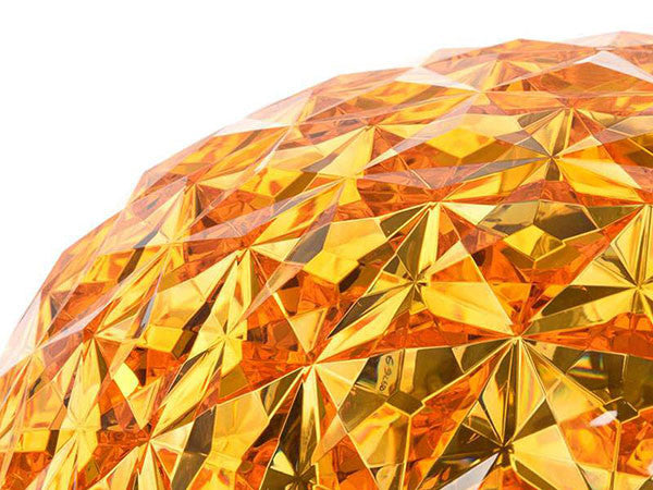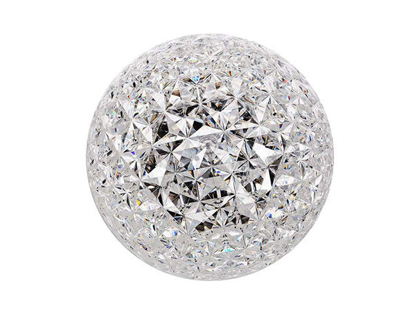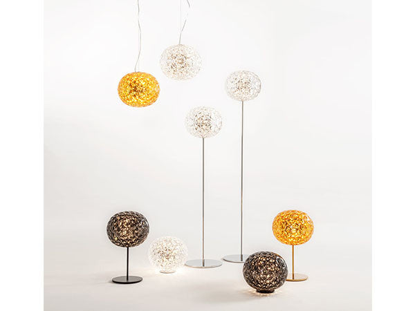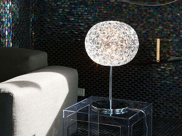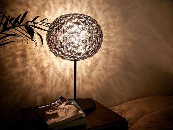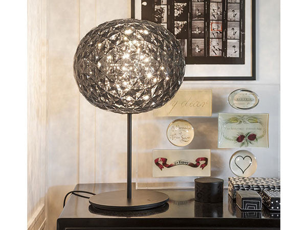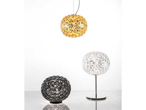 日本人デザイナーの吉岡徳仁によって、宇宙に浮かぶ惑星をイメージしてデザインされた「プラネット」。クリスタルガラスのように透明な樹脂の厚みを巧みに調整することによって、様々な角度からみて、美しく変化するきらめきを実現しました。各色にあわせて本体の仕上げや色も変えられています。テーブルランプはタッチセンサー式で調光も可能です。