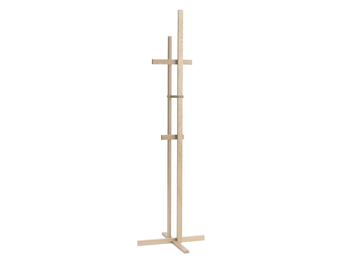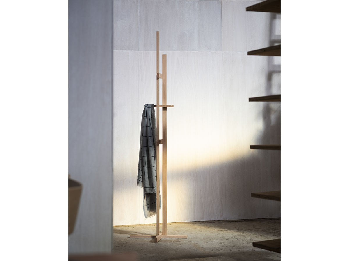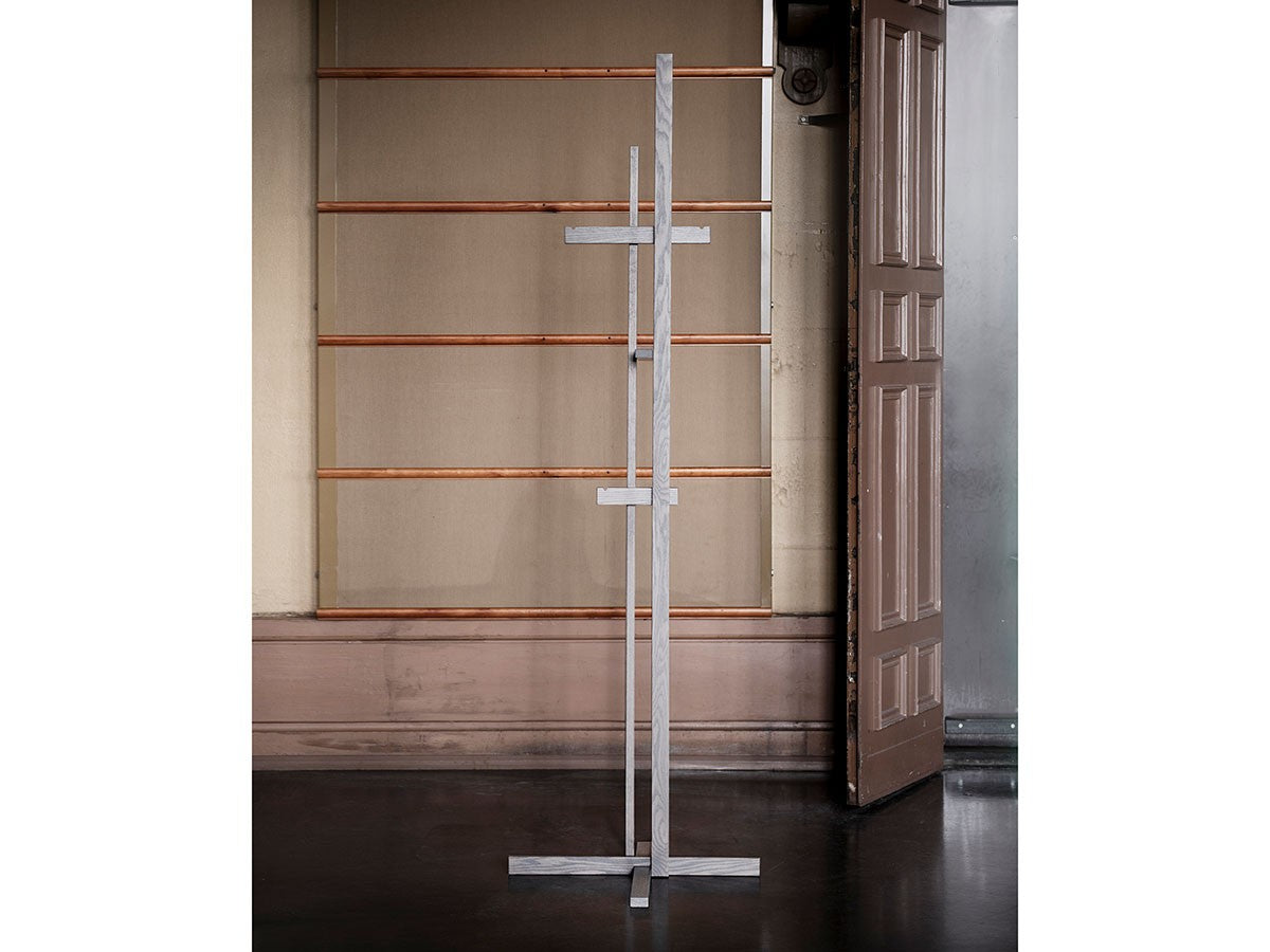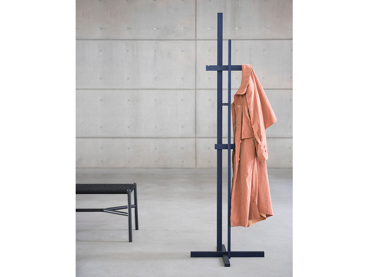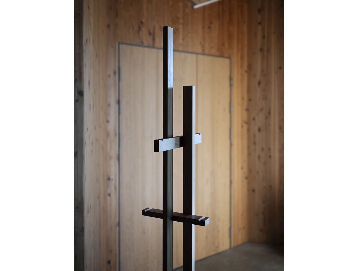 このコートスタンドは、機能的な彫刻としてデザインされました。木の構成部品は全て同じ材料で長さのみを変化させていますが、方向・場所・角度を変えて不均一に組み上げることにより、視点によって様々な表情を見せるデザインとなっています。また意図的に表裏面のある構成は、壁面傍に配置されることを意識し「よく使う側」と「そうでもない側」の違いを反映しています。This coat stand is a functional sculpture in a house. The construction elements are made of one type of timber in different lengths. As they are jointed together in different places with various angles and directions, the object changes its character according to the side where it is looked at. The design has the face side which hangs more clothes and the back side with less hanging space which is designed to be facing the wall.