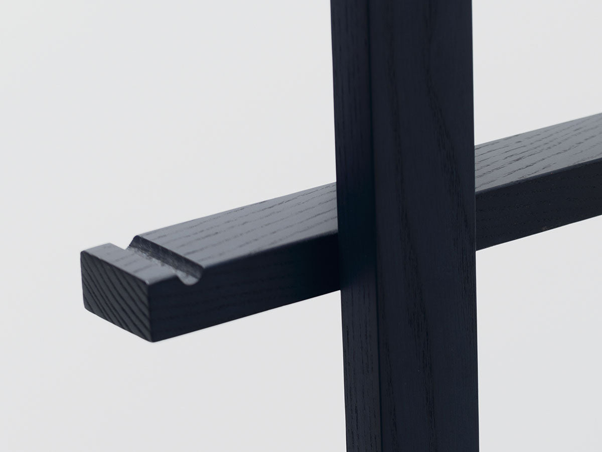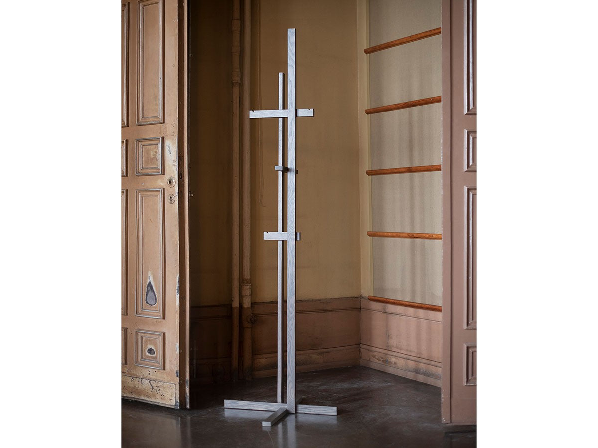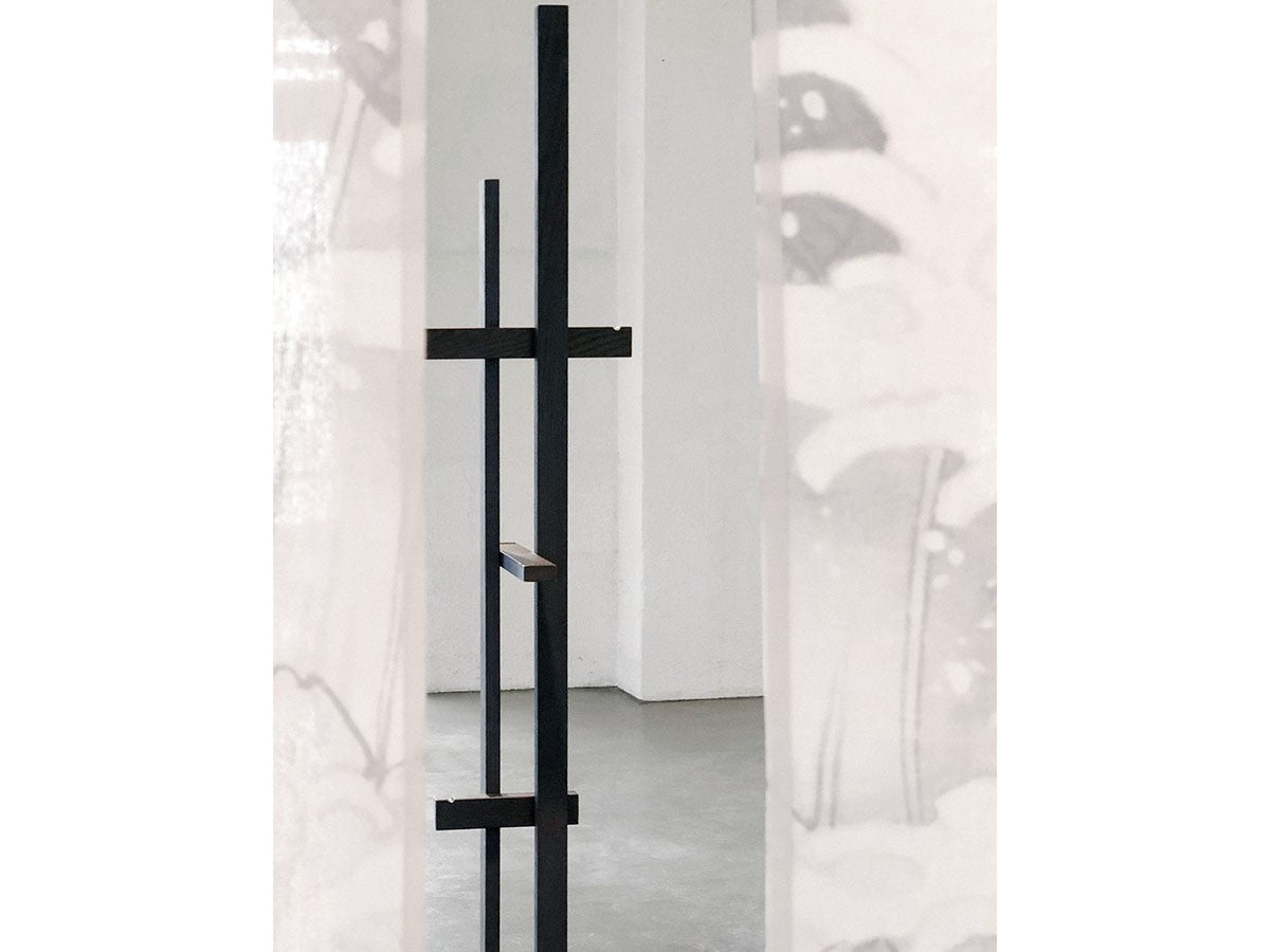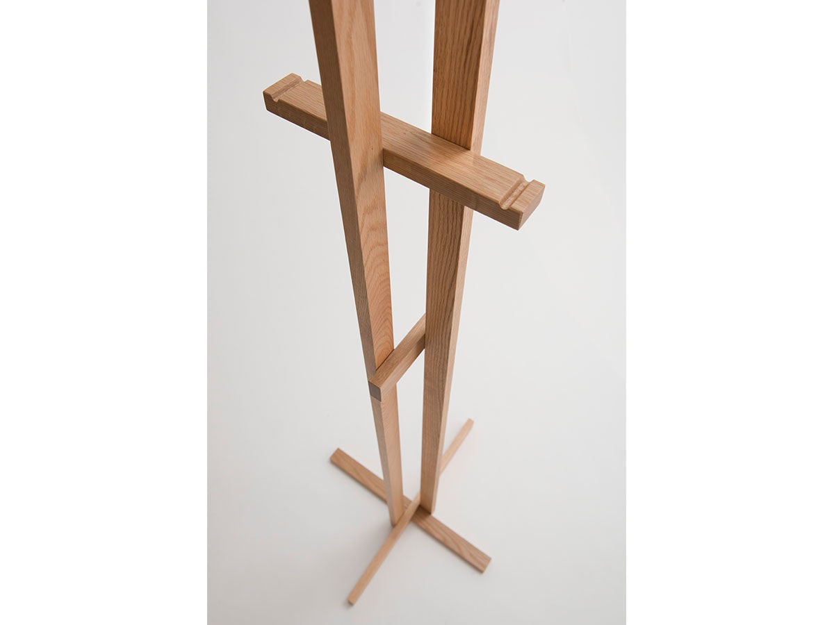 このコートスタンドは、機能的な彫刻としてデザインされました。木の構成部品は全て同じ材料で長さのみを変化させていますが、方向・場所・角度を変えて不均一に組み上げることにより、視点によって様々な表情を見せるデザインとなっています。また意図的に表裏面のある構成は、壁面傍に配置されることを意識し「よく使う側」と「そうでもない側」の違いを反映しています。This coat stand is a functional sculpture in a house. The construction elements are made of one type of timber in different lengths. As they are jointed together in different places with various angles and directions, the object changes its character according to the side where it is looked at. The design has the face side which hangs more clothes and the back side with less hanging space which is designed to be facing the wall.